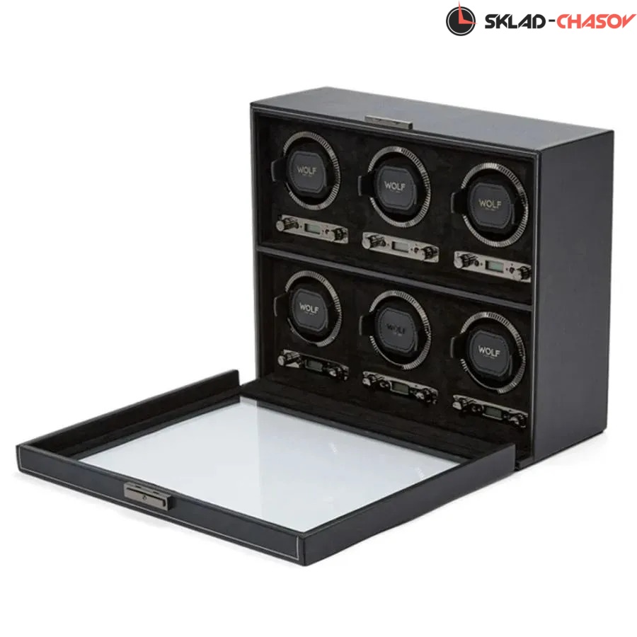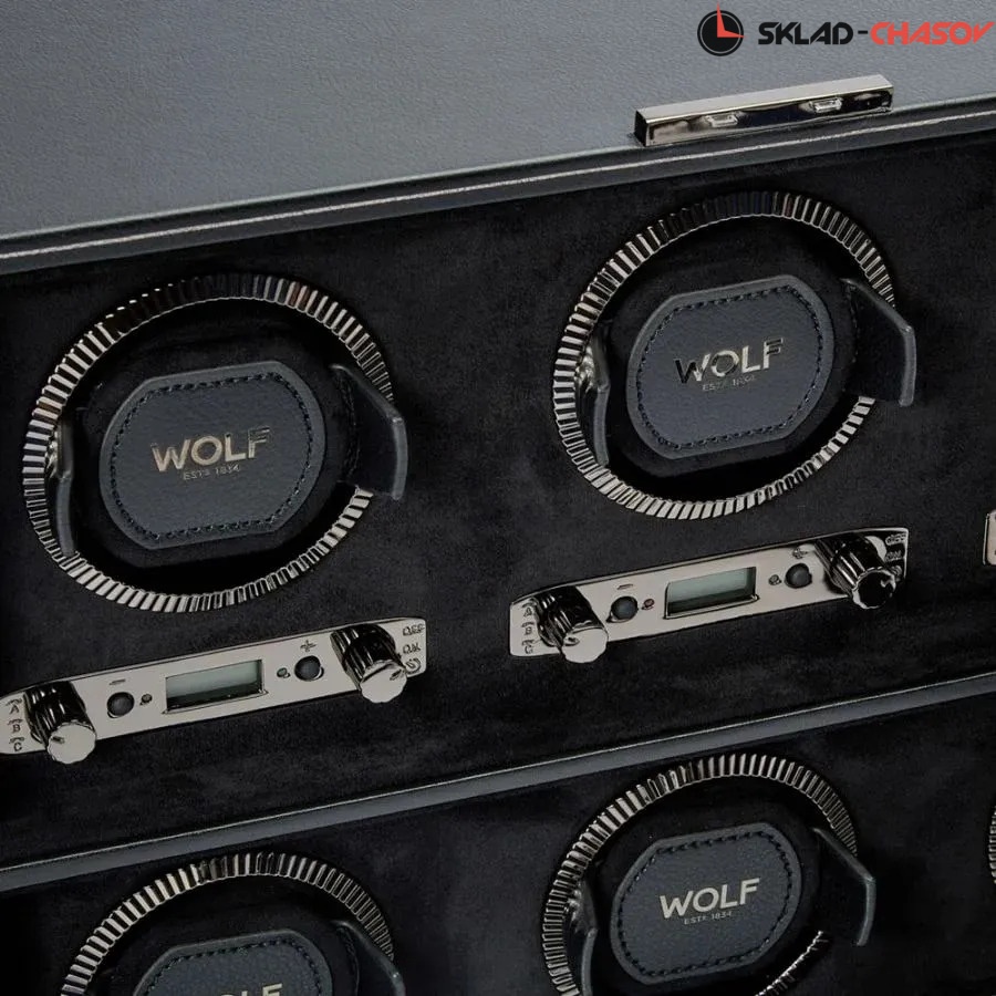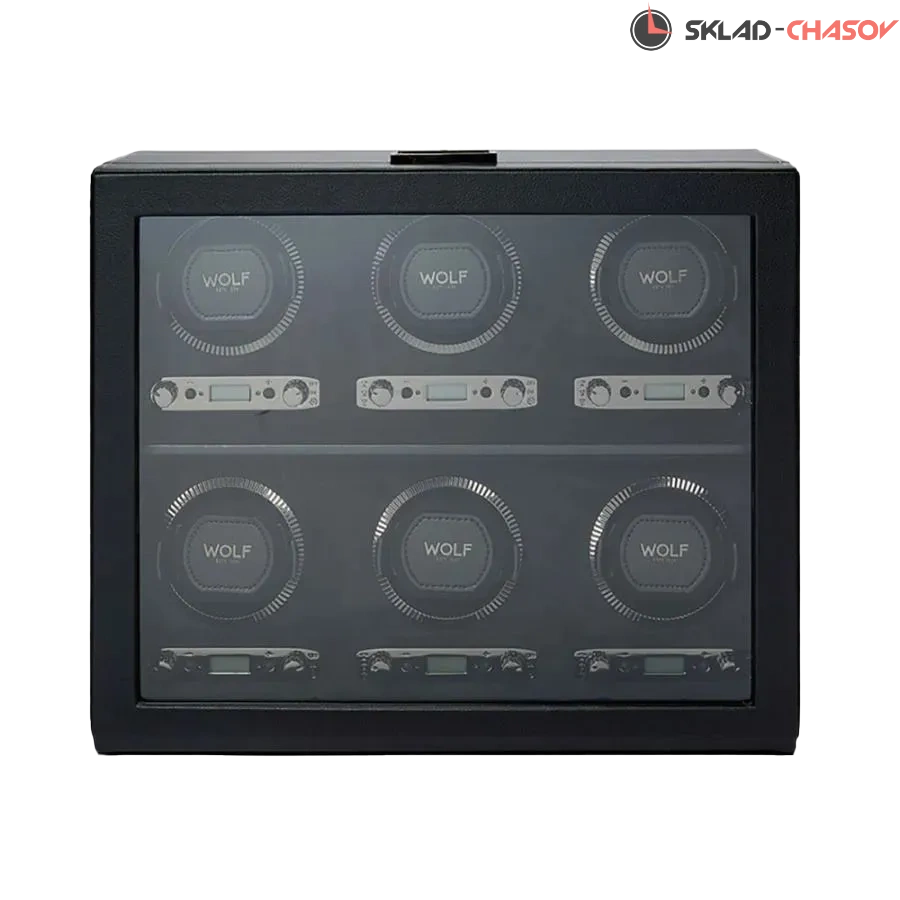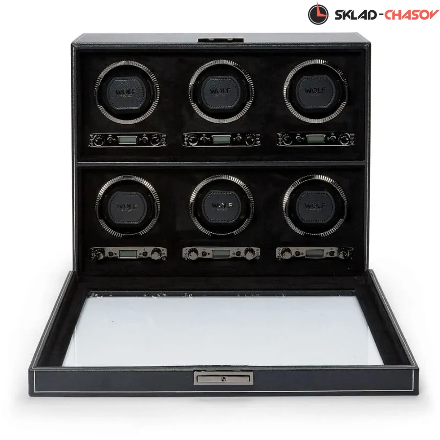 Элегантная модель British Racing 6 в утонченном чёрно-графитовом исполнении с рифлёным безелем и серебристой фурнитурой — это воплощение гармонии формы, технологий и безупречного вкуса. Корпус шкатулки выполнен в нежной веган-коже глубокого чёрного оттенка, а внутренняя поверхность отделана мягкой микрофиброй, которая бережно сохраняет внешний вид часов. Каждое гнездо оснащено телескопической мягкой подушечкой, которая адаптируется под размер браслета и надёжно фиксируется с вашими часами в посадочном стакане, исключая скольжение или перекос во время подзавода. Шкатулка оборудована системой подзавода для 6-ти часов: каждая ячейка настраивается индивидуально, с возможностью выбора направления вращения и количества оборотов (от 300 до 1200 в сутки). Доступны функции задержки запуска на 10 секунд и режима ожидания. Благодаря запатентованной технологии WOLF, часы по завершении цикла возвращаются в исходное положение.