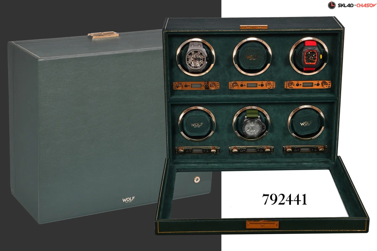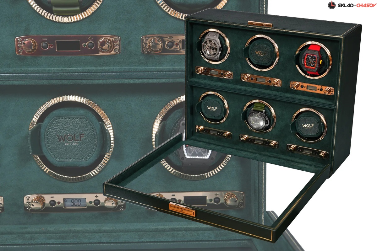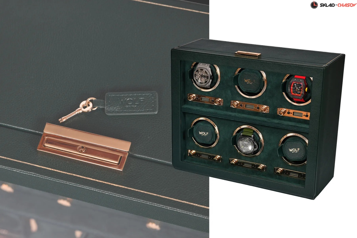 Мало найдется цветов, столь же изысканных и неповторимых, как глубокий, роскошный оттенок British Racing Green. Благодаря элегантному спортивному стилю и гоночному наследию, объединяющими таких знаменитостей как Стирлинг Мосс, Джим Кларк и Грэм Хилл с легендарными брендами Bentley, Jaguar, Lotus и Aston Martin, темно-зеленый оттенок неразрывно связан с роскошью и британским спортивным совершенством. Вполне естественно, что классический британский бренд WOLF использовал этот триумфальный цвет в собственной премиальной коллекции шкатулок для автоматического завода и хранения часов. Каждое изделие из коллекции WOLF British Racing Green изготавливается из мягкой эластичной экокожи с фактурной поверхностью, отличается отделкой высшего класса и повышенным вниманием к деталям, отражает суть гоночного наследия. Виндеры WOLF British Racing Green выпускаются в разных модификациях в зависимости от количества заводимых часов: 1, 2, 3, 6 и 8, сочетают классический роскошный внешний вид с уникальными техническими инновациями. Верхняя поверхность шкатулки отделаны классическими панелями, напоминающими раритетные упаковки для механических часов середины ХХ века, и украшены тонкой полоской из золотой фольги ручной работы. Внутренние поверхности устланы зеленой алькантарой цвета British Racing. Фурнитура выполнена из золотого металла для создания благородного классического эффекта, включая блестяще отполированные рамки с рифленым дизайном в винтажном стиле. Помимо внешнего вида, каждая из этих шкатулок оснащена ультрасовременным мотором для обеспечения бесперебойной и надежной работы. Запатентованный счетчик подзавода WOLF отслеживает точное количество оборотов, выполняемых в день, в то время как все другие виндеры, представленные на рынке, просто оценивают эту цифру. Это точное количество оборотов может быть установлено пользователем вручную в диапазоне от 300 до 1200 оборотов в день по часовой стрелке, против часовой стрелки или в двунаправленном режиме. Настраиваемая настройка позволяет владельцам индивидуально настраивать программу подзавода в соответствии с запасом хода каждой отдельной пары часов, при этом настройки программы варьируются от 6 до 72 часов запаса хода, что позволяет часам высвобождать накопленную энергию до начала программы подзавода. Для обеспечения абсолютной безопасности во время программы заводки запатентованная фиксирующая манжета WOLF надежно фиксирует часы практически любого размера во вращающемся барабане с помощью пены низкой плотности, оказывающее минимальное давление на часы. Каждое изделие из серии WOLF British Racing Green скрывает дополнительную секцию под обшитой панелями крышкой, обеспечивая незаметное и надежное место для хранения наручных часов, ремешков и мелких ценностей. Сделанный вручную, British Racing сочетает в себе зеленый цвет международных автогонок британских автомобилей, участвовавших в гонках в Ирландии в начале 1900-х годов, с революционной четырехугольной панельной крышкой. Тонкая работа включает в себя линии золотой фольги вручную на веганской зернистой коже. Золотые фурнитуры, удобные петли и рифленый безель. BRG, еще один дизайн, впервые разработанный компанией Wolf. Шкатулка удобна в использовании так есть дополнительное хранения часов , закрывается на ключик.