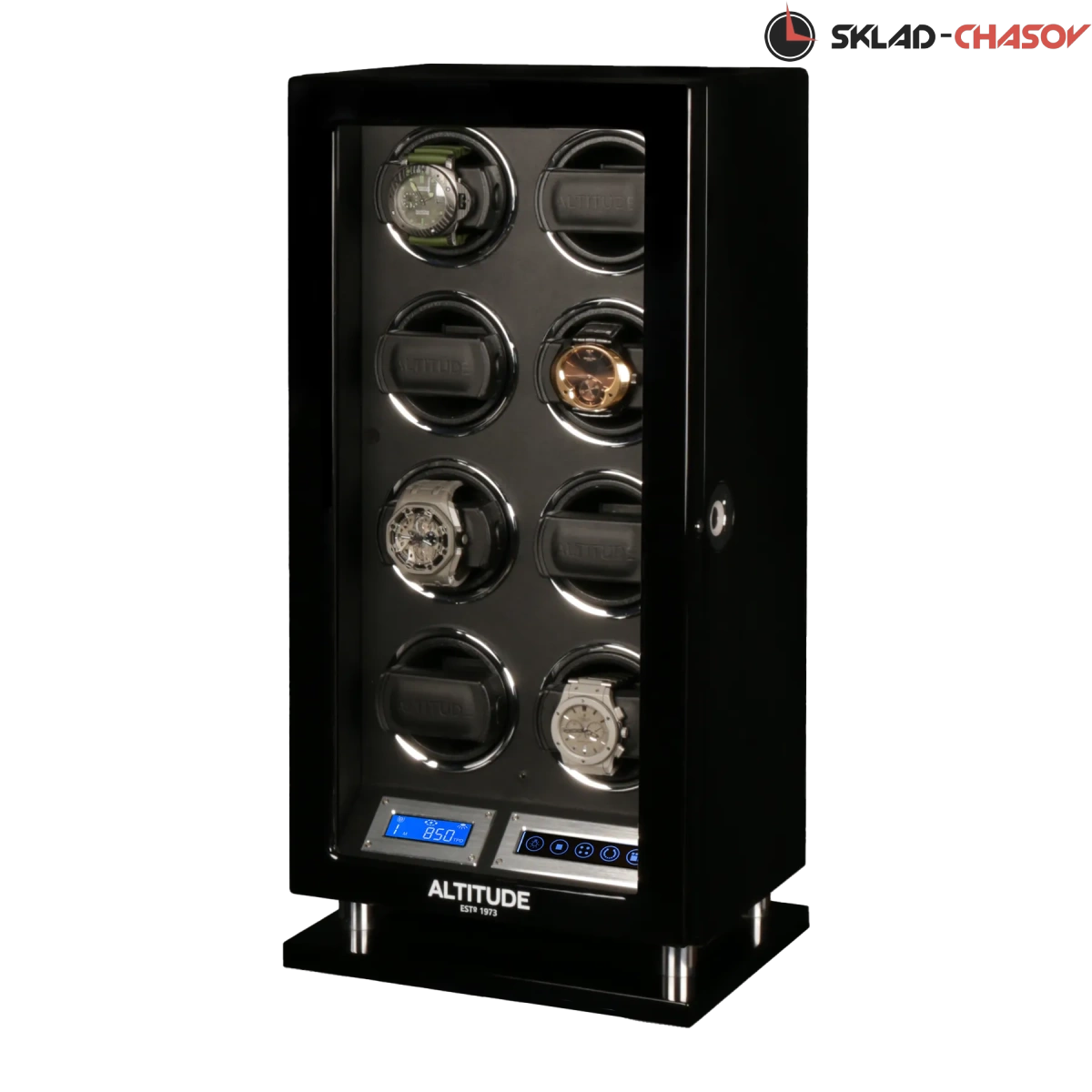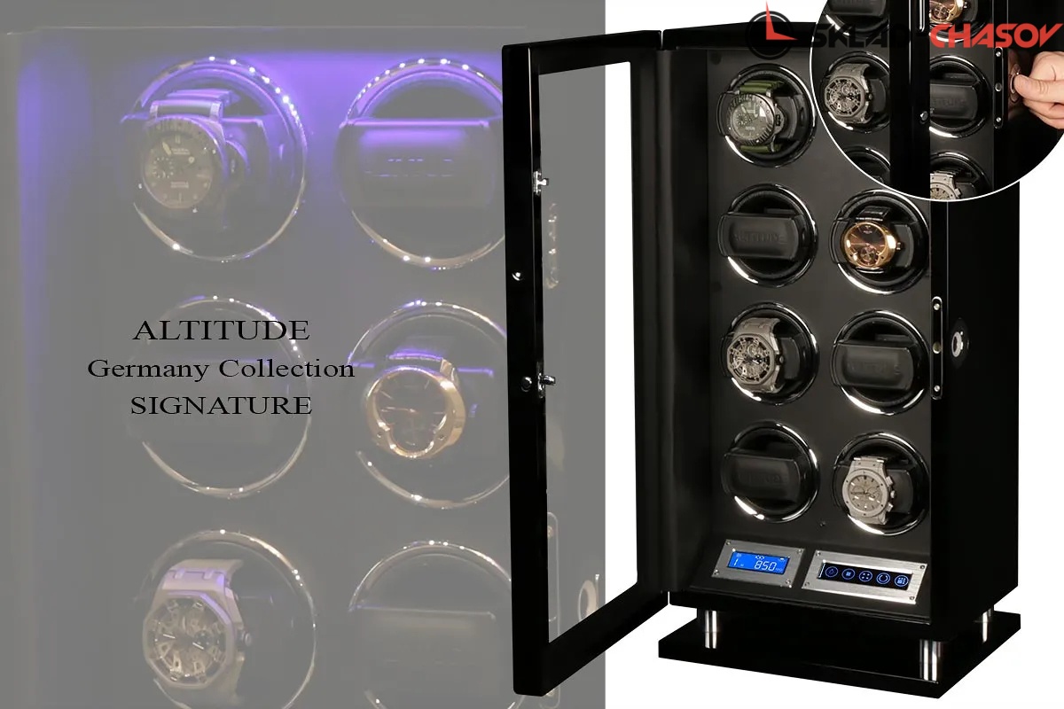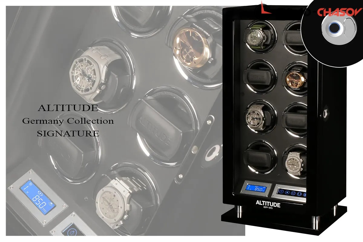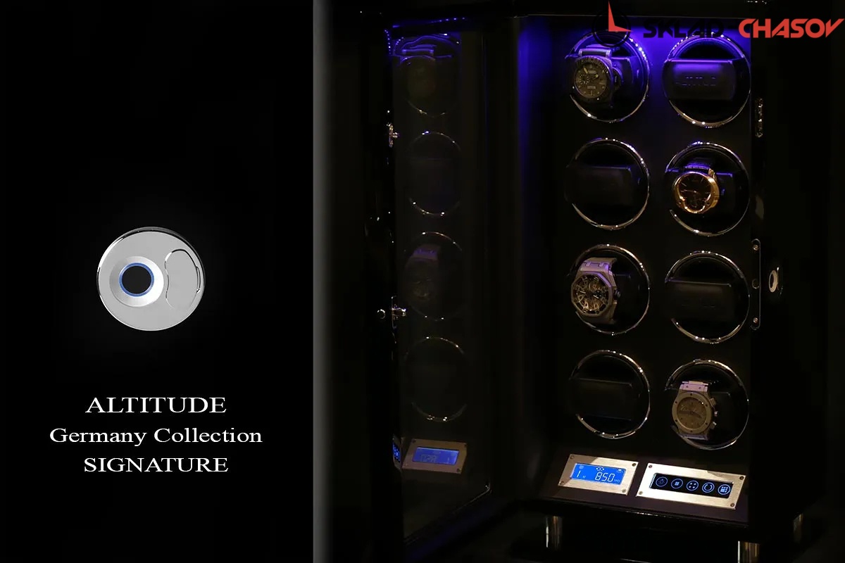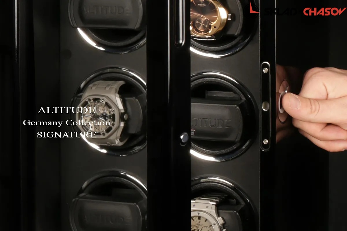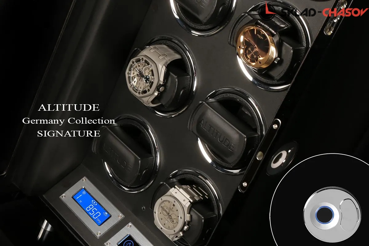 Новая серия шкатулок "Signature“ с отпечатком пальца по очень привлекательным ценам для наших дорогих клиентов, удобно и просто настроить и пользоваться этим инновационным решением от немецких дизайнеров (настроить можно не менее 5 отпечатков), чёрное дерево венге покрыто лаком, внутри выстлано чёрной кожей, два дисплея тачскрин позволяют выставить любое направление вращения механизма, а также количество оборотов в сутки 650/750/850/1000/1950. Включение и выключение светодиодной подсветки на дисплеи. Подзавод 8 часов. Удобные телескопические держатели идеально подходят для больших и любых запястьев. Фирменная гарантия 1 год