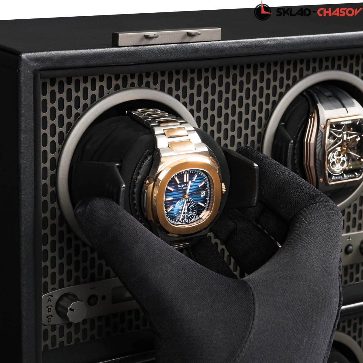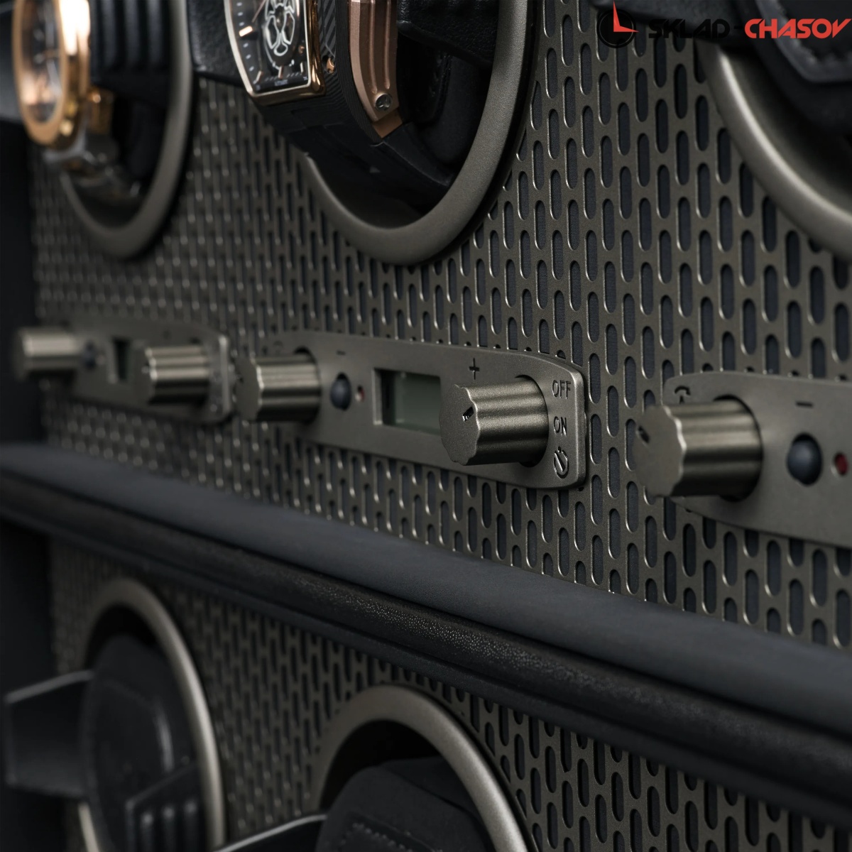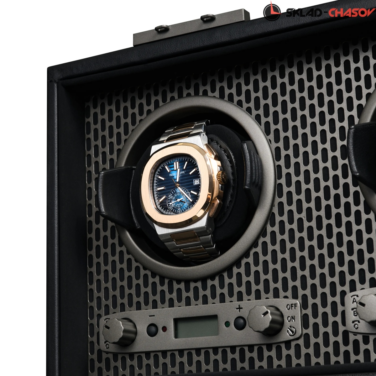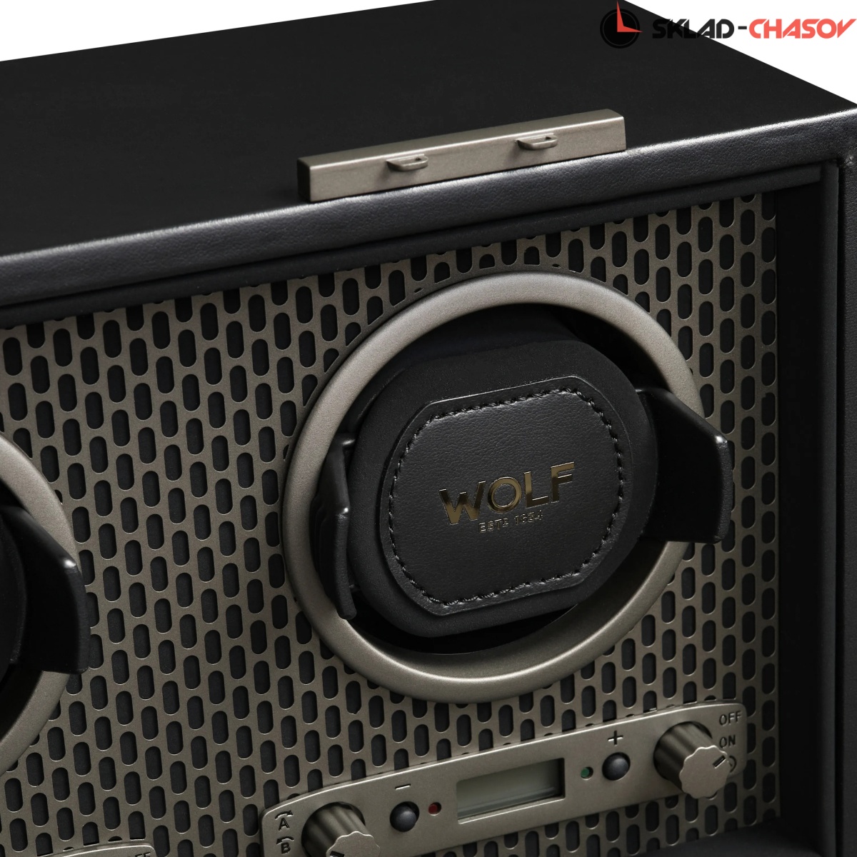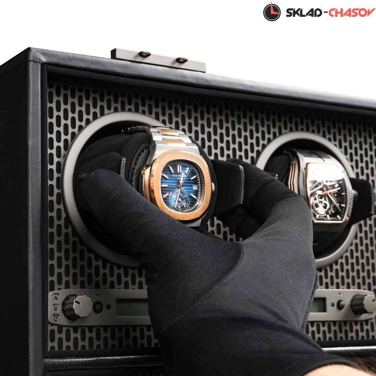 Коллекция Axis от самого известного английского бренда Wolf поражает воображение своим видом и используемыми материалами. Шкатулка создана для автоподзавода ваших часов в безопасности под металлическим ключиком. Экстерьер выполнен из мягкой и гладкой экологичной кожи высшего сорта, плавно переходящий в современный интерьер с использованием матовой перфорированной стали и необычайно мягкого велюра. Абсолютно каждый элемент фурнитуры покрыт порошковой краской. Через натуральное стекло можно созерцать коллекцию из 8-ми наручных часов. Продуманный комплект разноразмерных подушек подойдет для установки часов любого диаметра с любой длиной ремешка или браслета. Ретро дизайн системы подзавода неповторимо удобен для настройки. Матово-серыми тумблерами выбирается сторона вращения и включение / выключение подзавода. Резиновыми кнопками выбирается количество оборотов от 300 до 1200 в сутки. Важно отметить, что вся продукция премиального бренда Wolf изготавливается вручную с использованием экологически чистых материалов.