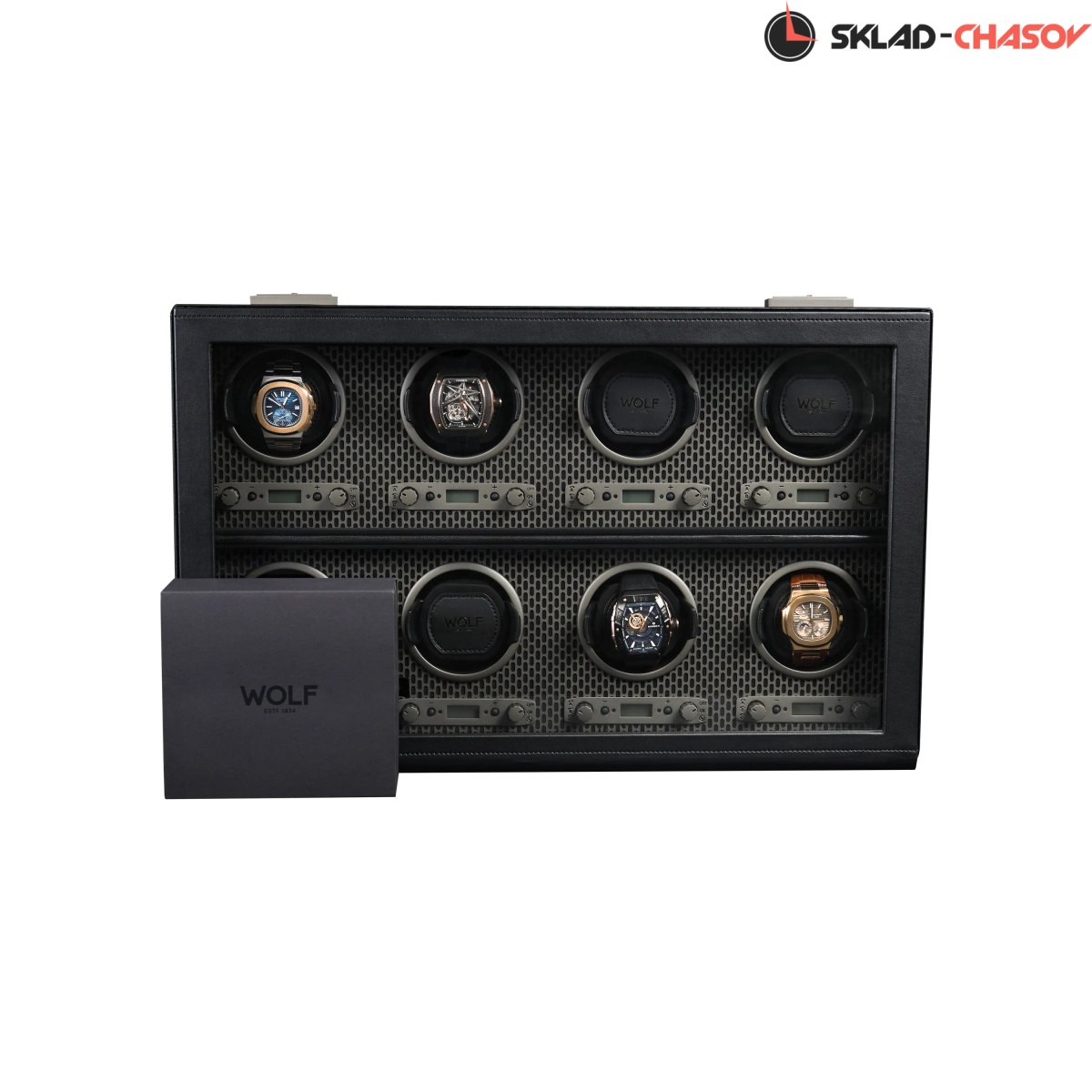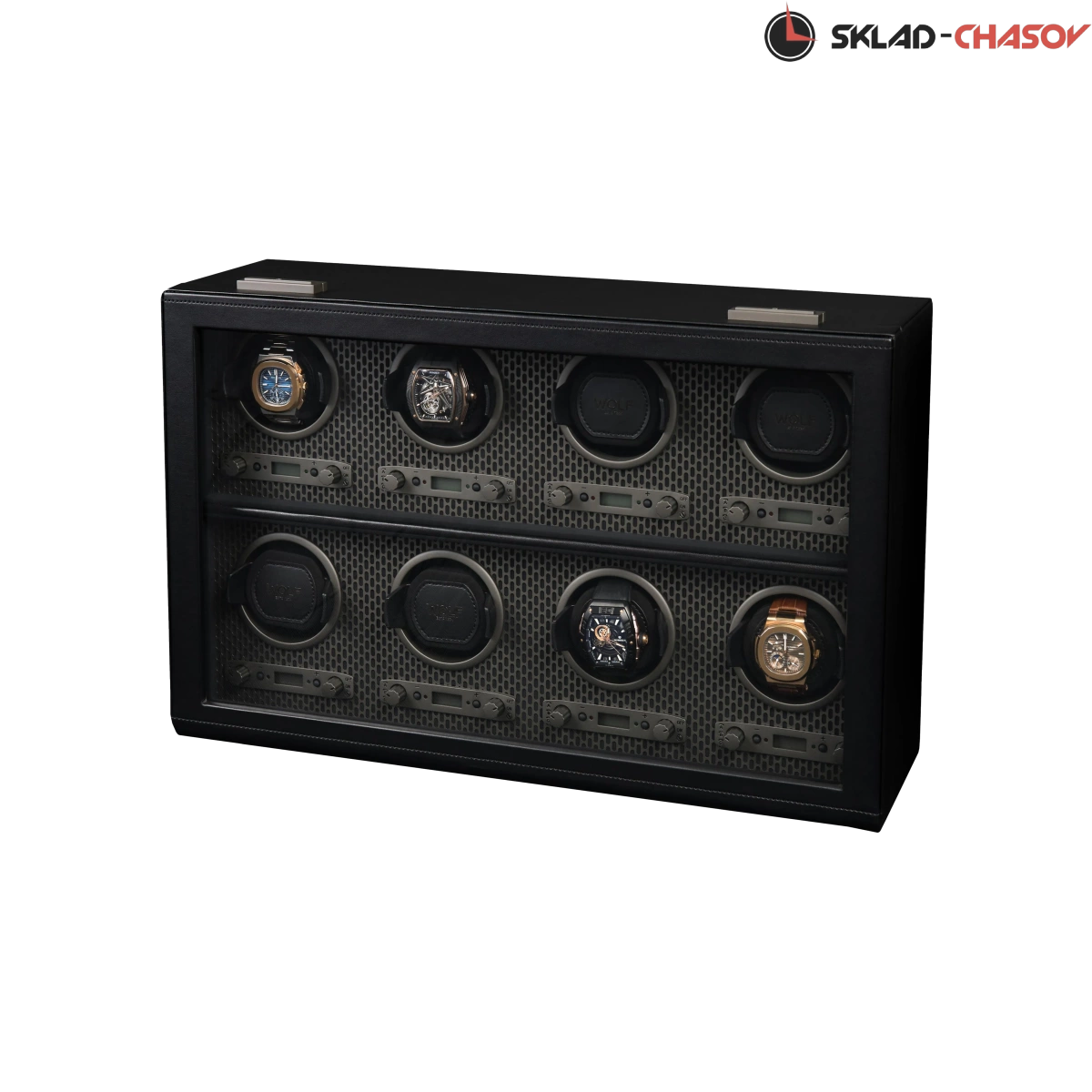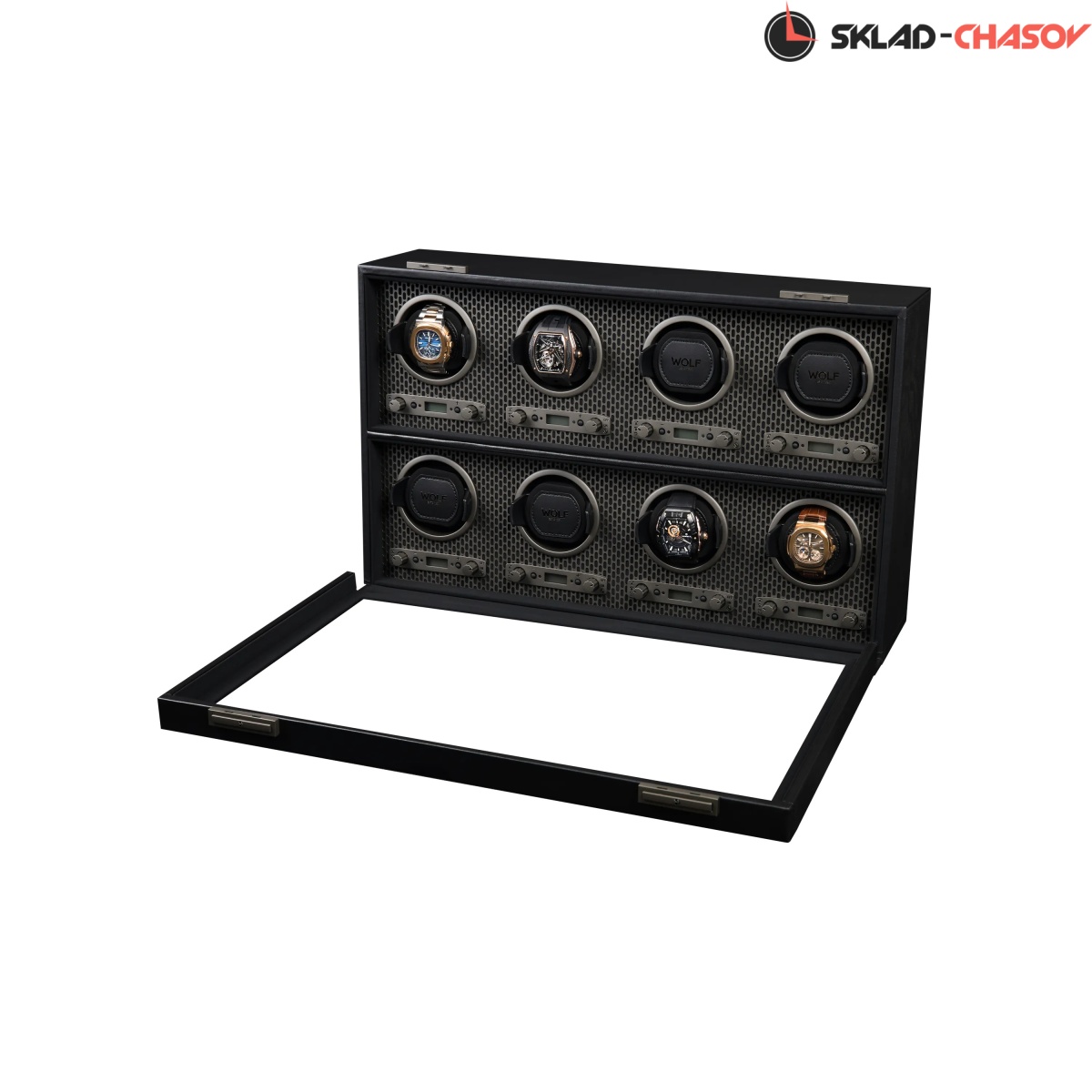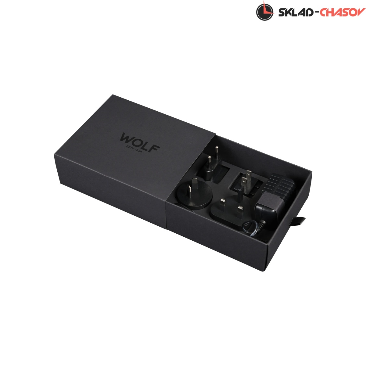 Коллекция Axis от самого известного английского бренда Wolf поражает воображение своим видом и используемыми материалами. Шкатулка создана для автоподзавода ваших часов в безопасности под металлическим ключиком. Экстерьер выполнен из мягкой и гладкой экологичной кожи высшего сорта, плавно переходящий в современный интерьер с использованием матовой перфорированной стали и необычайно мягкого велюра. Абсолютно каждый элемент фурнитуры покрыт порошковой краской. Через натуральное стекло можно созерцать коллекцию из 8-ми наручных часов. Продуманный комплект разноразмерных подушек подойдет для установки часов любого диаметра с любой длиной ремешка или браслета. Ретро дизайн системы подзавода неповторимо удобен для настройки. Матово-серыми тумблерами выбирается сторона вращения и включение / выключение подзавода. Резиновыми кнопками выбирается количество оборотов от 300 до 1200 в сутки. Важно отметить, что вся продукция премиального бренда Wolf изготавливается вручную с использованием экологически чистых материалов.