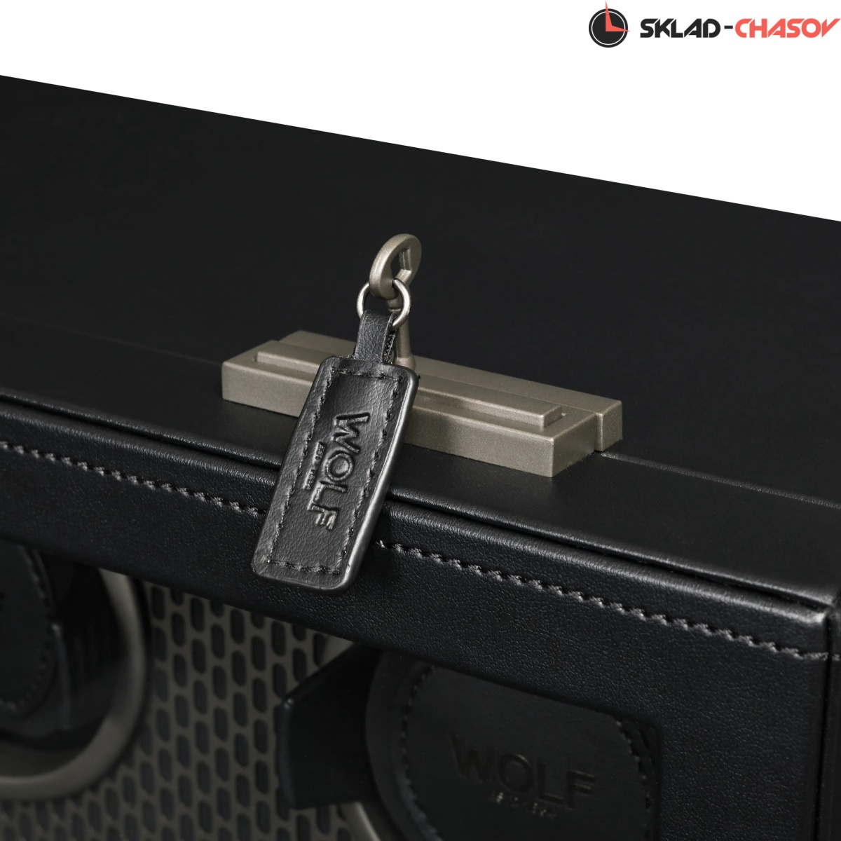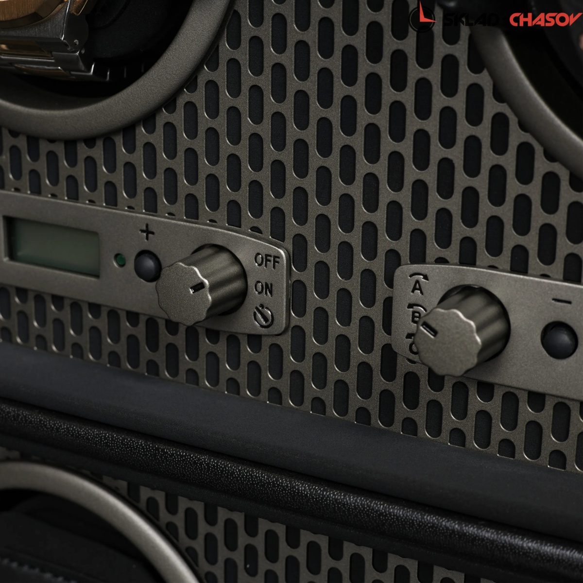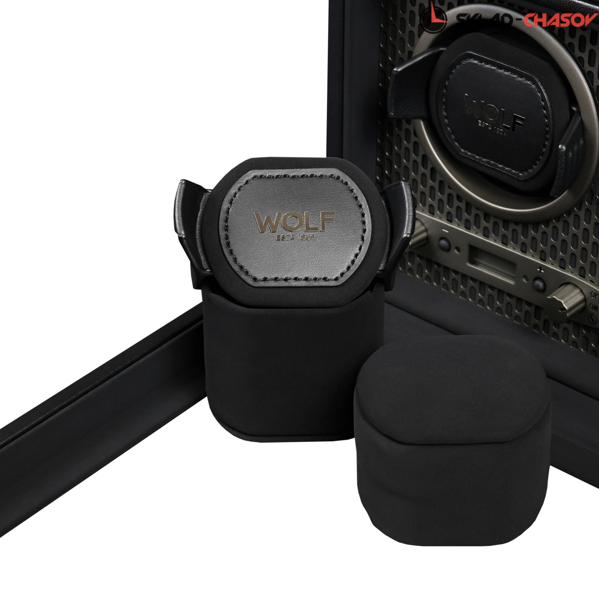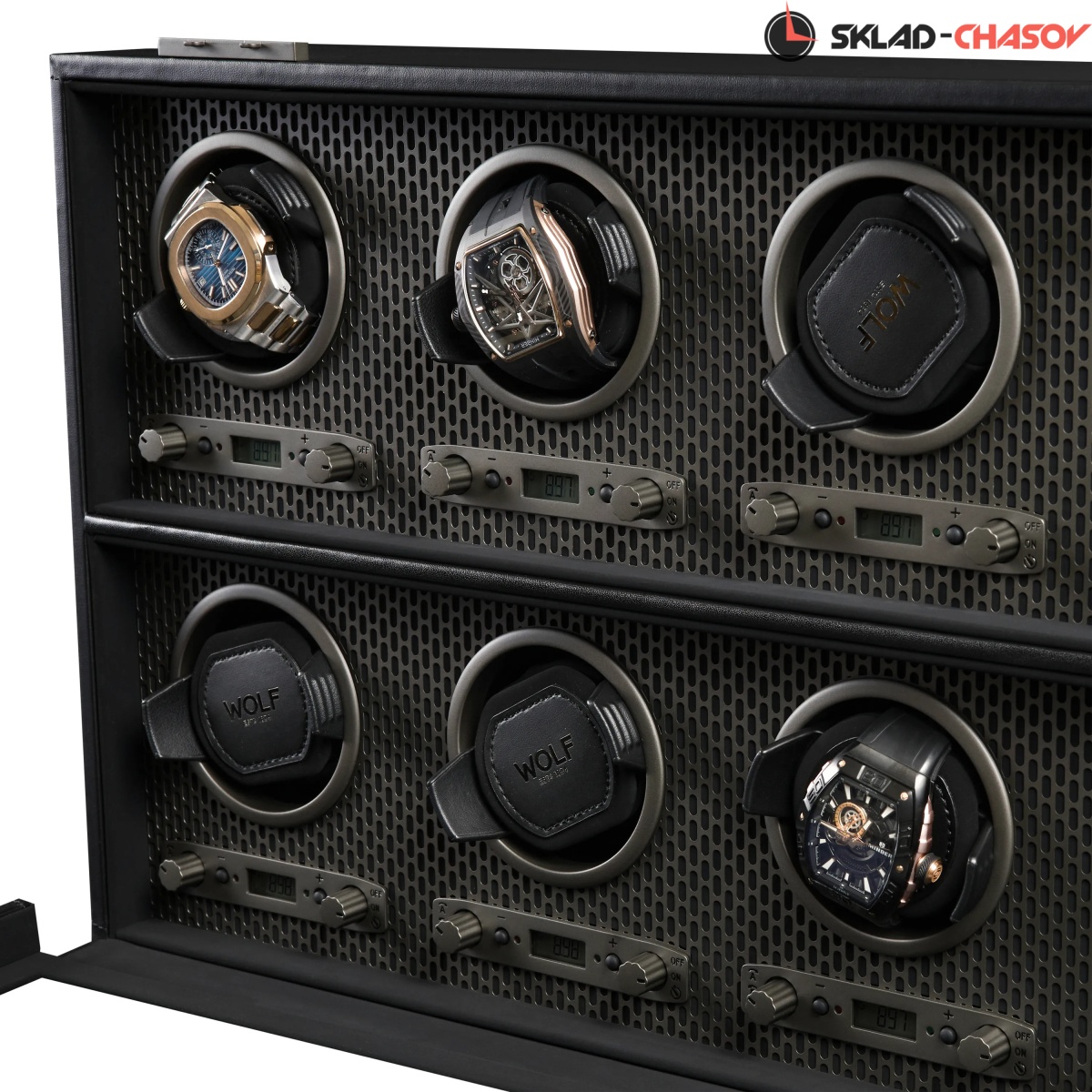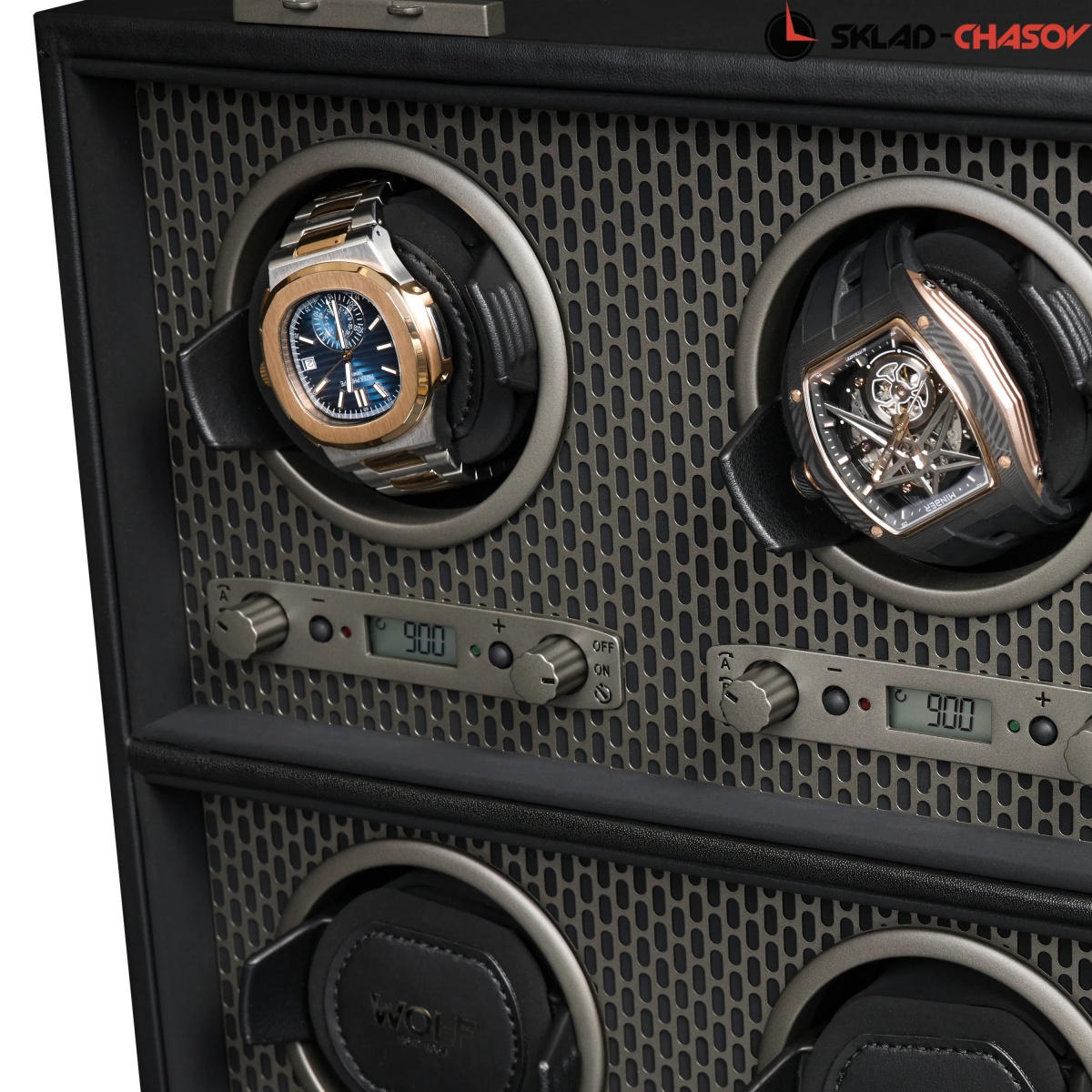 Коллекция Axis от самого известного английского бренда Wolf поражает воображение своим видом и используемыми материалами. Шкатулка создана для автоподзавода ваших часов в безопасности под металлическим ключиком. Экстерьер выполнен из мягкой и гладкой экологичной кожи высшего сорта, плавно переходящий в современный интерьер с использованием матовой перфорированной стали и необычайно мягкого велюра. Абсолютно каждый элемент фурнитуры покрыт порошковой краской. Через натуральное стекло можно созерцать коллекцию из 8-ми наручных часов. Продуманный комплект разноразмерных подушек подойдет для установки часов любого диаметра с любой длиной ремешка или браслета. Ретро дизайн системы подзавода неповторимо удобен для настройки. Матово-серыми тумблерами выбирается сторона вращения и включение / выключение подзавода. Резиновыми кнопками выбирается количество оборотов от 300 до 1200 в сутки. Важно отметить, что вся продукция премиального бренда Wolf изготавливается вручную с использованием экологически чистых материалов.