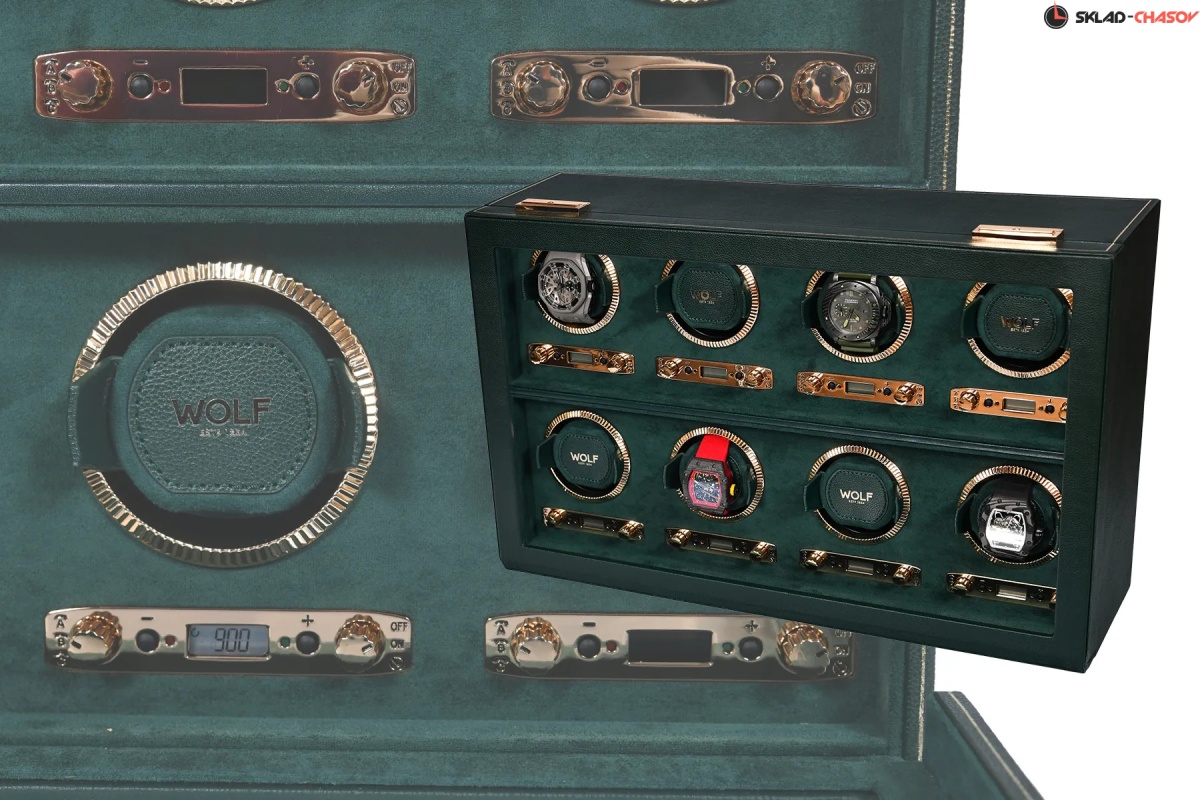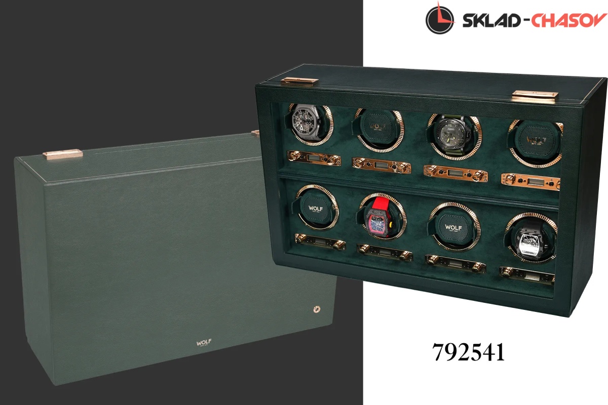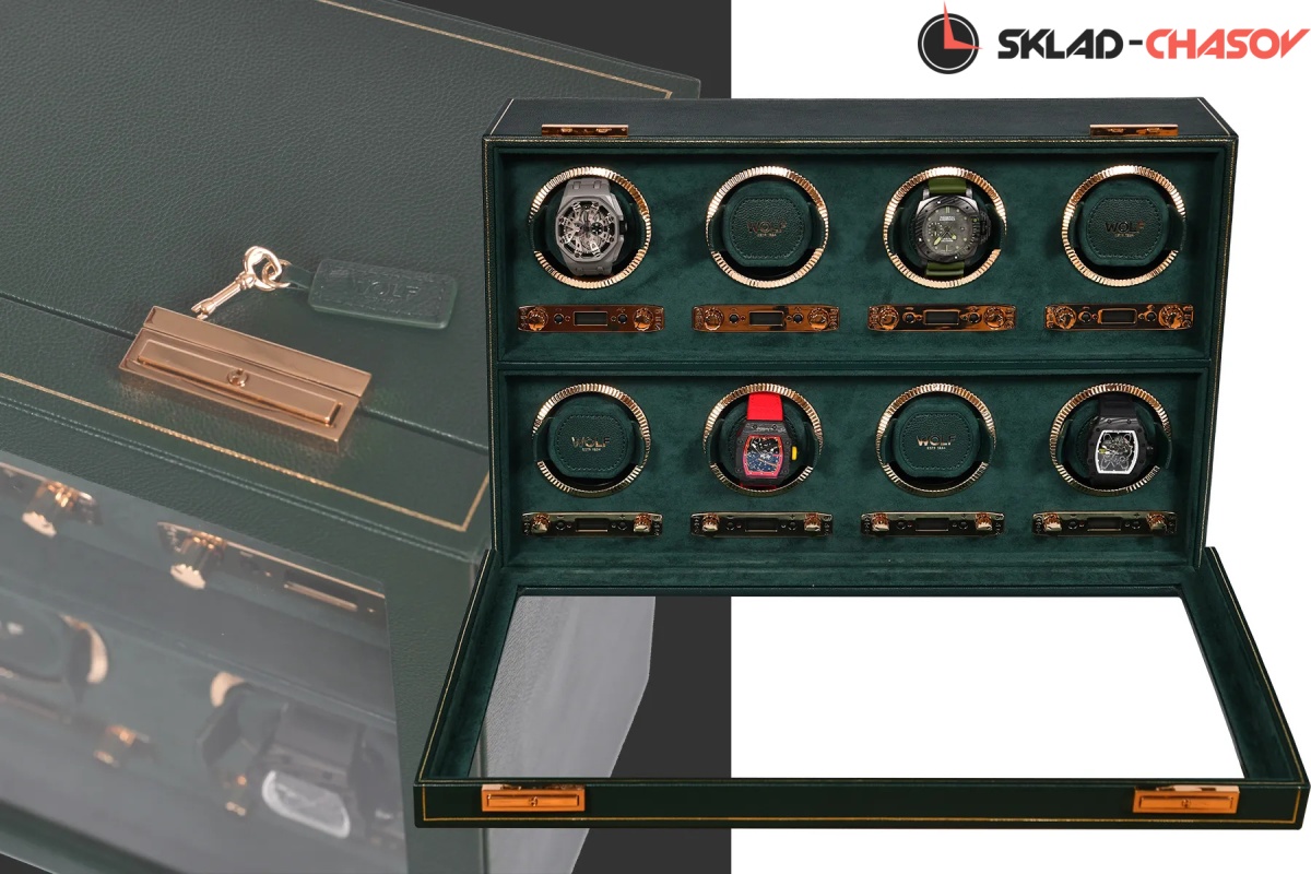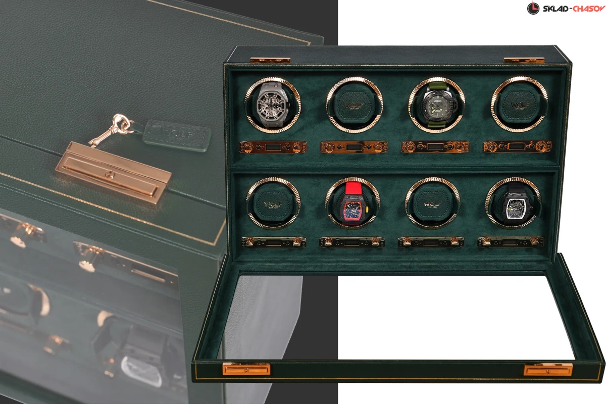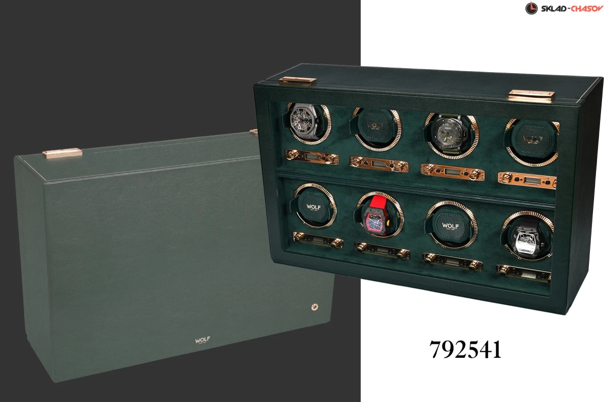 Мало найдется цветов, столь же изысканных и неповторимых, как глубокий, роскошный оттенок British Racing Green. Благодаря элегантному спортивному стилю и гоночному наследию, объединяющими таких знаменитостей как Стирлинг Мосс, Джим Кларк и Грэм Хилл с легендарными брендами Bentley, Jaguar, Lotus и Aston Martin, темно-зеленый оттенок неразрывно связан с роскошью и британским спортивным совершенством. Вполне естественно, что классический британский бренд WOLF использовал этот триумфальный цвет в собственной премиальной коллекции шкатулок для автоматического завода и хранения часов. Каждое изделие из коллекции WOLF British Racing Green изготавливается из мягкой эластичной экокожи с фактурной поверхностью, отличается отделкой высшего класса и повышенным вниманием к деталям, отражает суть гоночного наследия. Виндеры WOLF British Racing Green выпускаются в разных модификациях в зависимости от количества заводимых часов: 1, 2, 3, 6 и 8, сочетают классический роскошный внешний вид с уникальными техническими инновациями. Верхняя поверхность шкатулки отделаны классическими панелями, напоминающими раритетные упаковки для механических часов середины ХХ века, и украшены тонкой полоской из золотой фольги ручной работы. Внутренние поверхности устланы зеленой алькантарой цвета British Racing. Фурнитура выполнена из золотого металла для создания благородного классического эффекта, включая блестяще отполированные рамки с рифленым дизайном в винтажном стиле. Помимо внешнего вида, каждая из этих шкатулок оснащена ультрасовременным мотором для обеспечения бесперебойной и надежной работы. Запатентованный счетчик подзавода WOLF отслеживает точное количество оборотов, выполняемых в день, в то время как все другие виндеры, представленные на рынке, просто оценивают эту цифру. Это точное количество оборотов может быть установлено пользователем вручную в диапазоне от 300 до 1200 оборотов в день по часовой стрелке, против часовой стрелки или в двунаправленном режиме. Настраиваемая настройка позволяет владельцам индивидуально настраивать программу подзавода в соответствии с запасом хода каждой отдельной пары часов, при этом настройки программы варьируются от 6 до 72 часов запаса хода, что позволяет часам высвобождать накопленную энергию до начала программы подзавода. Для обеспечения абсолютной безопасности во время программы заводки запатентованная фиксирующая манжета WOLF надежно фиксирует часы практически любого размера во вращающемся барабане с помощью пены низкой плотности, оказывающее минимальное давление на часы. Каждое изделие из серии WOLF British Racing Green скрывает дополнительную секцию под обшитой панелями крышкой, обеспечивая незаметное и надежное место для хранения наручных часов, ремешков и мелких ценностей. Сделанный вручную, British Racing сочетает в себе зеленый цвет международных автогонок британских автомобилей, участвовавших в гонках в Ирландии в начале 1900-х годов, с революционной четырехугольной панельной крышкой. Тонкая работа включает в себя линии золотой фольги вручную на веганской зернистой коже. Золотые фурнитуры, удобные петли и рифленый безель. BRG, еще один дизайн, впервые разработанный компанией Wolf. Шкатулка удобна в использовании так есть дополнительное хранения часов , закрывается на ключик.