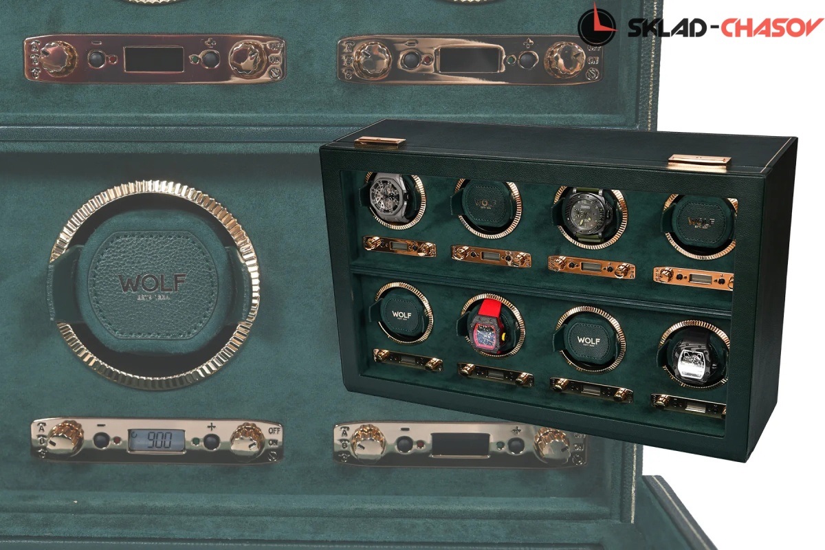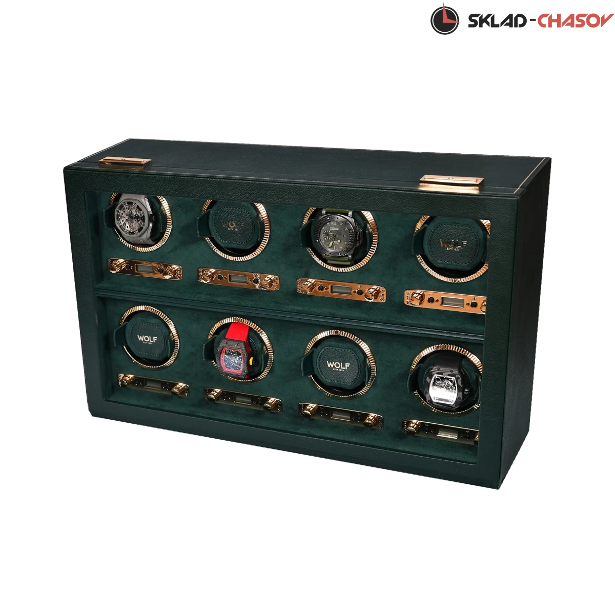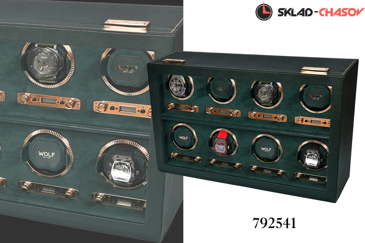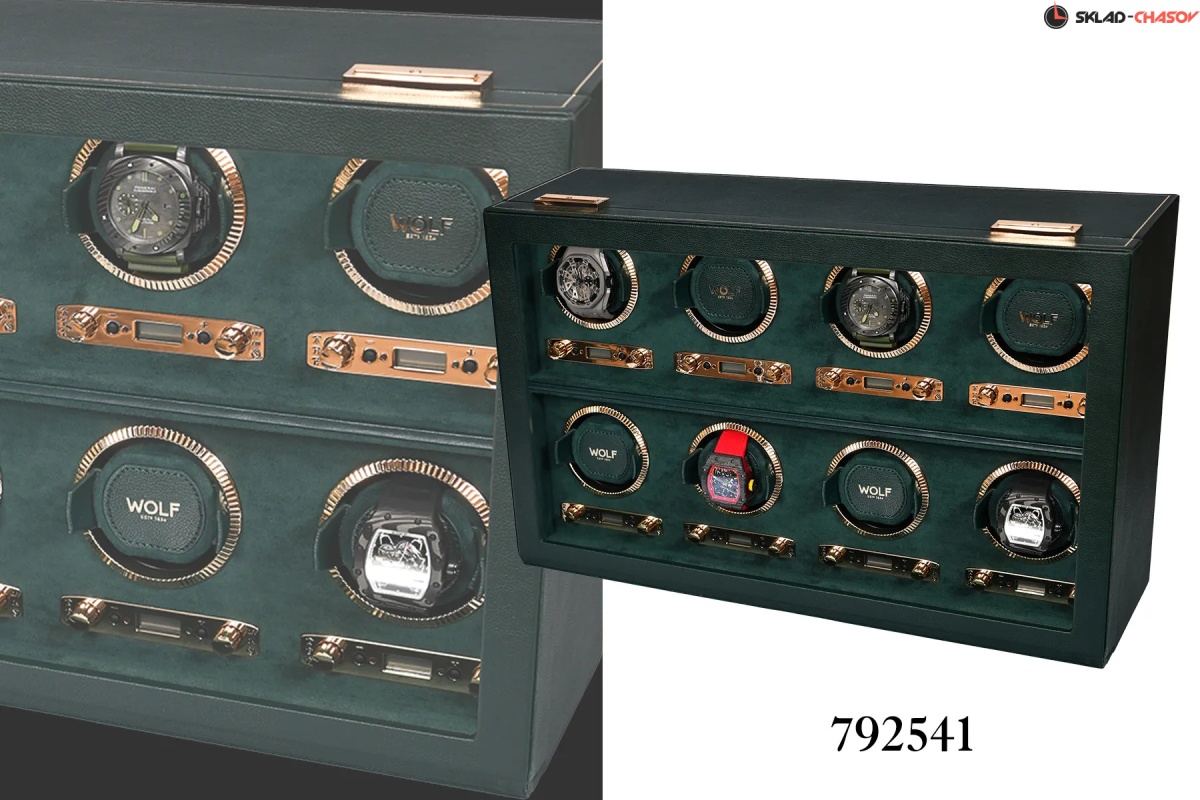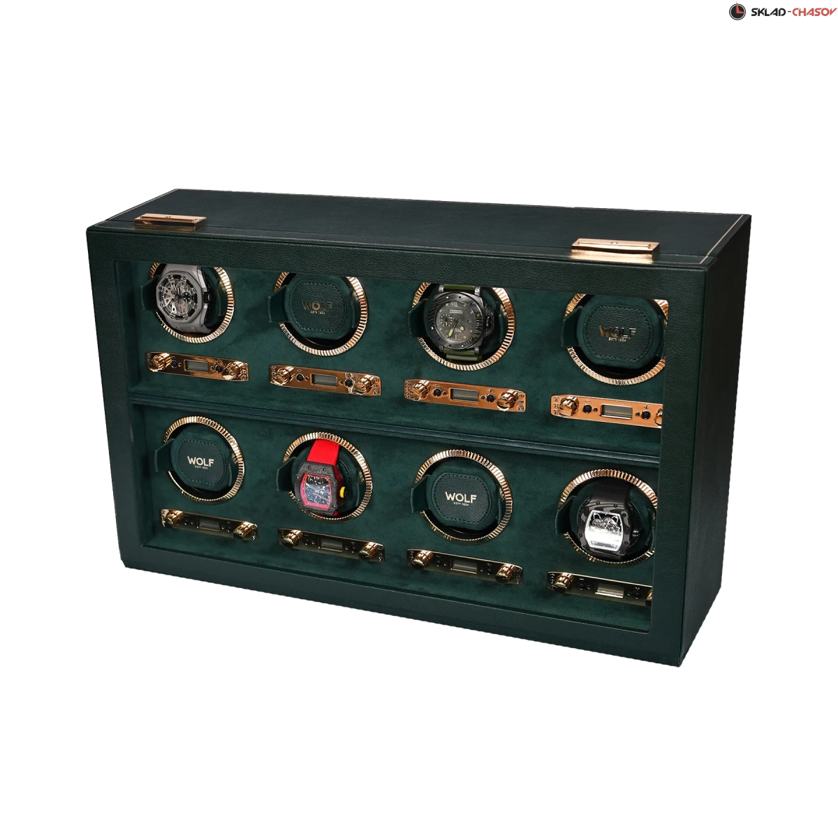 Мало найдется цветов, столь же изысканных и неповторимых, как глубокий, роскошный оттенок British Racing Green. Благодаря элегантному спортивному стилю и гоночному наследию, объединяющими таких знаменитостей как Стирлинг Мосс, Джим Кларк и Грэм Хилл с легендарными брендами Bentley, Jaguar, Lotus и Aston Martin, темно-зеленый оттенок неразрывно связан с роскошью и британским спортивным совершенством. Вполне естественно, что классический британский бренд WOLF использовал этот триумфальный цвет в собственной премиальной коллекции шкатулок для автоматического завода и хранения часов. Каждое изделие из коллекции WOLF British Racing Green изготавливается из мягкой эластичной экокожи с фактурной поверхностью, отличается отделкой высшего класса и повышенным вниманием к деталям, отражает суть гоночного наследия. Виндеры WOLF British Racing Green выпускаются в разных модификациях в зависимости от количества заводимых часов: 1, 2, 3, 6 и 8, сочетают классический роскошный внешний вид с уникальными техническими инновациями. Верхняя поверхность шкатулки отделаны классическими панелями, напоминающими раритетные упаковки для механических часов середины ХХ века, и украшены тонкой полоской из золотой фольги ручной работы. Внутренние поверхности устланы зеленой алькантарой цвета British Racing. Фурнитура выполнена из золотого металла для создания благородного классического эффекта, включая блестяще отполированные рамки с рифленым дизайном в винтажном стиле. Помимо внешнего вида, каждая из этих шкатулок оснащена ультрасовременным мотором для обеспечения бесперебойной и надежной работы. Запатентованный счетчик подзавода WOLF отслеживает точное количество оборотов, выполняемых в день, в то время как все другие виндеры, представленные на рынке, просто оценивают эту цифру. Это точное количество оборотов может быть установлено пользователем вручную в диапазоне от 300 до 1200 оборотов в день по часовой стрелке, против часовой стрелки или в двунаправленном режиме. Настраиваемая настройка позволяет владельцам индивидуально настраивать программу подзавода в соответствии с запасом хода каждой отдельной пары часов, при этом настройки программы варьируются от 6 до 72 часов запаса хода, что позволяет часам высвобождать накопленную энергию до начала программы подзавода. Для обеспечения абсолютной безопасности во время программы заводки запатентованная фиксирующая манжета WOLF надежно фиксирует часы практически любого размера во вращающемся барабане с помощью пены низкой плотности, оказывающее минимальное давление на часы. Каждое изделие из серии WOLF British Racing Green скрывает дополнительную секцию под обшитой панелями крышкой, обеспечивая незаметное и надежное место для хранения наручных часов, ремешков и мелких ценностей. Сделанный вручную, British Racing сочетает в себе зеленый цвет международных автогонок британских автомобилей, участвовавших в гонках в Ирландии в начале 1900-х годов, с революционной четырехугольной панельной крышкой. Тонкая работа включает в себя линии золотой фольги вручную на веганской зернистой коже. Золотые фурнитуры, удобные петли и рифленый безель. BRG, еще один дизайн, впервые разработанный компанией Wolf. Шкатулка удобна в использовании так есть дополнительное хранения часов , закрывается на ключик.