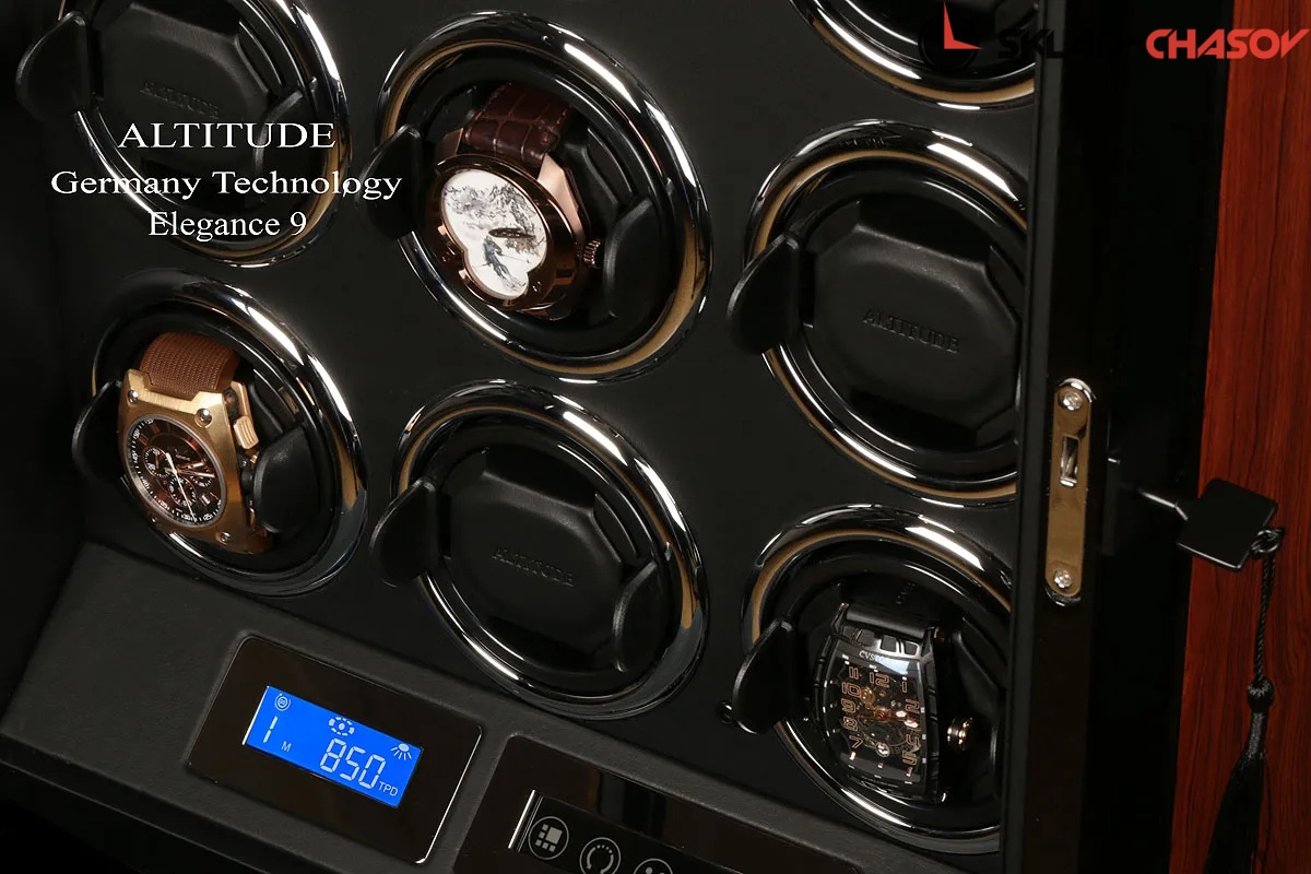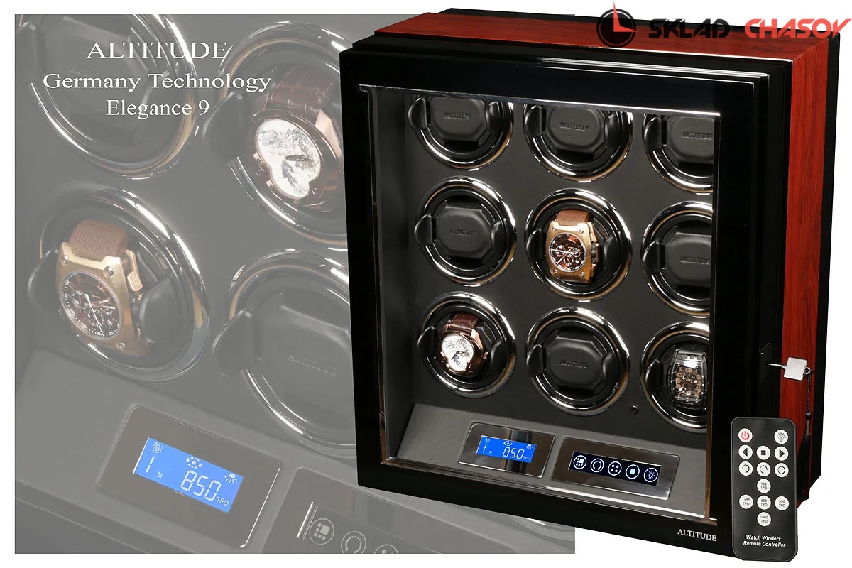 Mодель "Elegance9”. Новая модель от немецкого производителя "Altitude”, выполнена полностью из дерева двух пород (чёрного венге и канадского клёна), внутри выстлана чёрной кожей, новые телескопические держатели, дисплей "touchscreen”, автостоп при открывании дверцы, электронные часы, регулировка количества оборотов в сутки 650/750/850/1000/1950 и выбор из 3 направлений вращения. Светодиодная подстветка с функцией вкл/выкл. Фирменная гарантия 18 мес. Закрывается на магнитик и при желании на чёрный ключик. Возможность регулировок с помощью пульта. Упакована в белую картонную коробку.