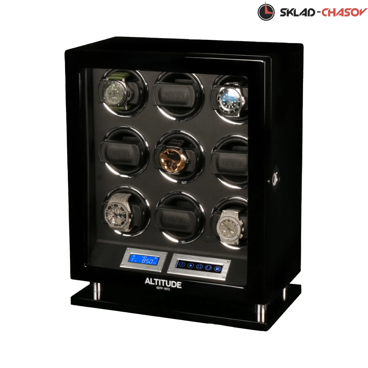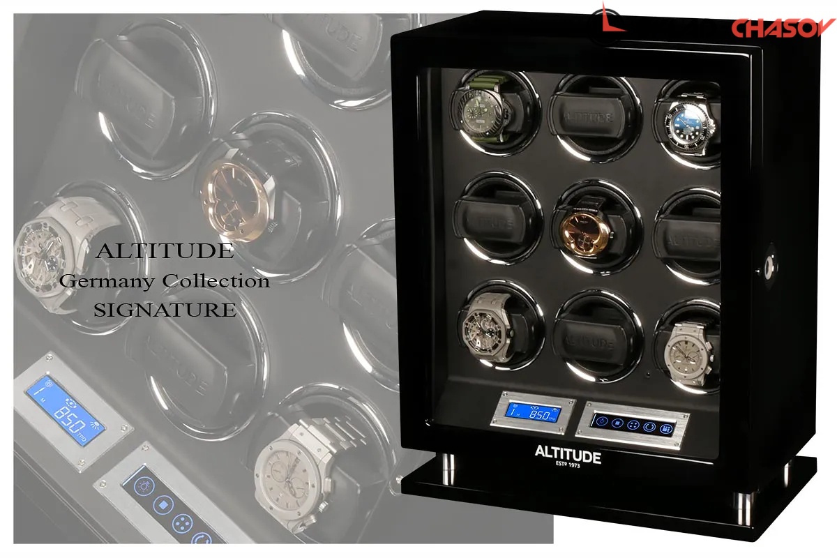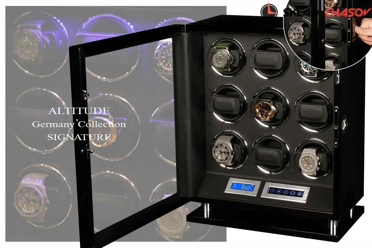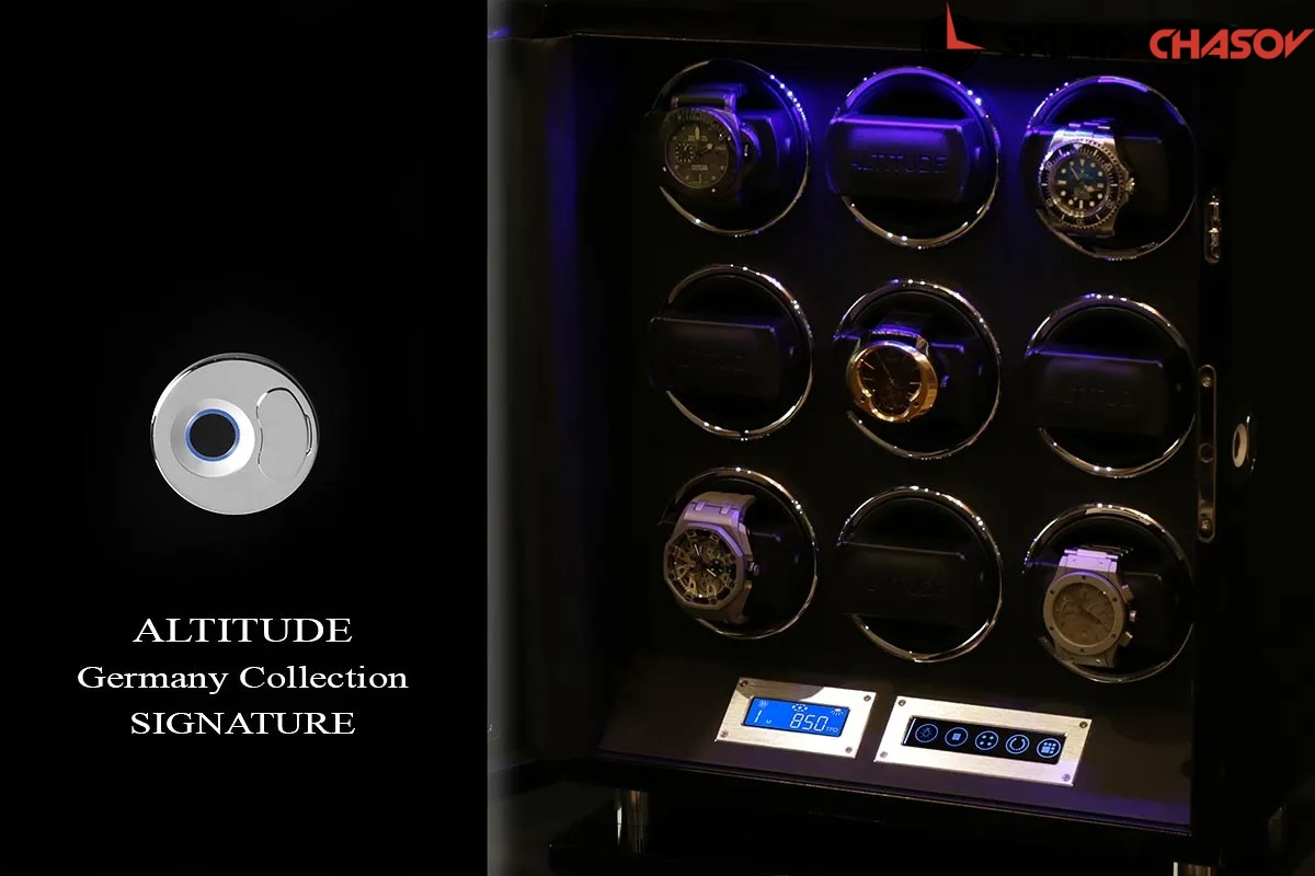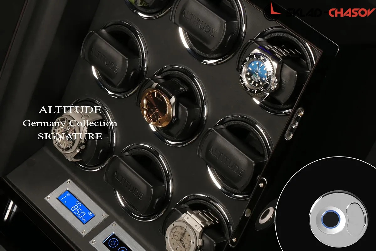 Новая серия шкатулок "Signature“ с отпечатком пальца по очень привлекательным ценам для наших дорогих клиентов, независимый подзавод 9 часов, удобно и просто настроить и пользоваться этим инновационным решением от немецких дизайнеров (настроить можно много отпечатков), чёрное дерево венге покрыто лаком, внутри выстлано чёрной кожей, два дисплея тачскрин позволяют выставить любое направление вращения механизма, а также количество оборотов в сутки 650/750/850/1000/1950. Включение и выключение светодиодной подсветки на дисплеи. Подзавод 9 часов. Удобные телескопические держатели идеально подходят для больших и любых запястьев. Фирменная гарантия 1 год.
