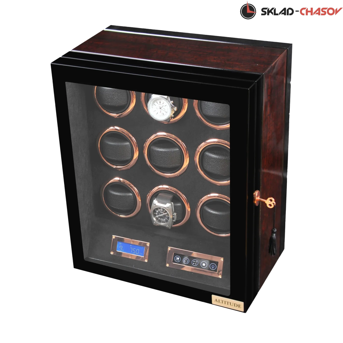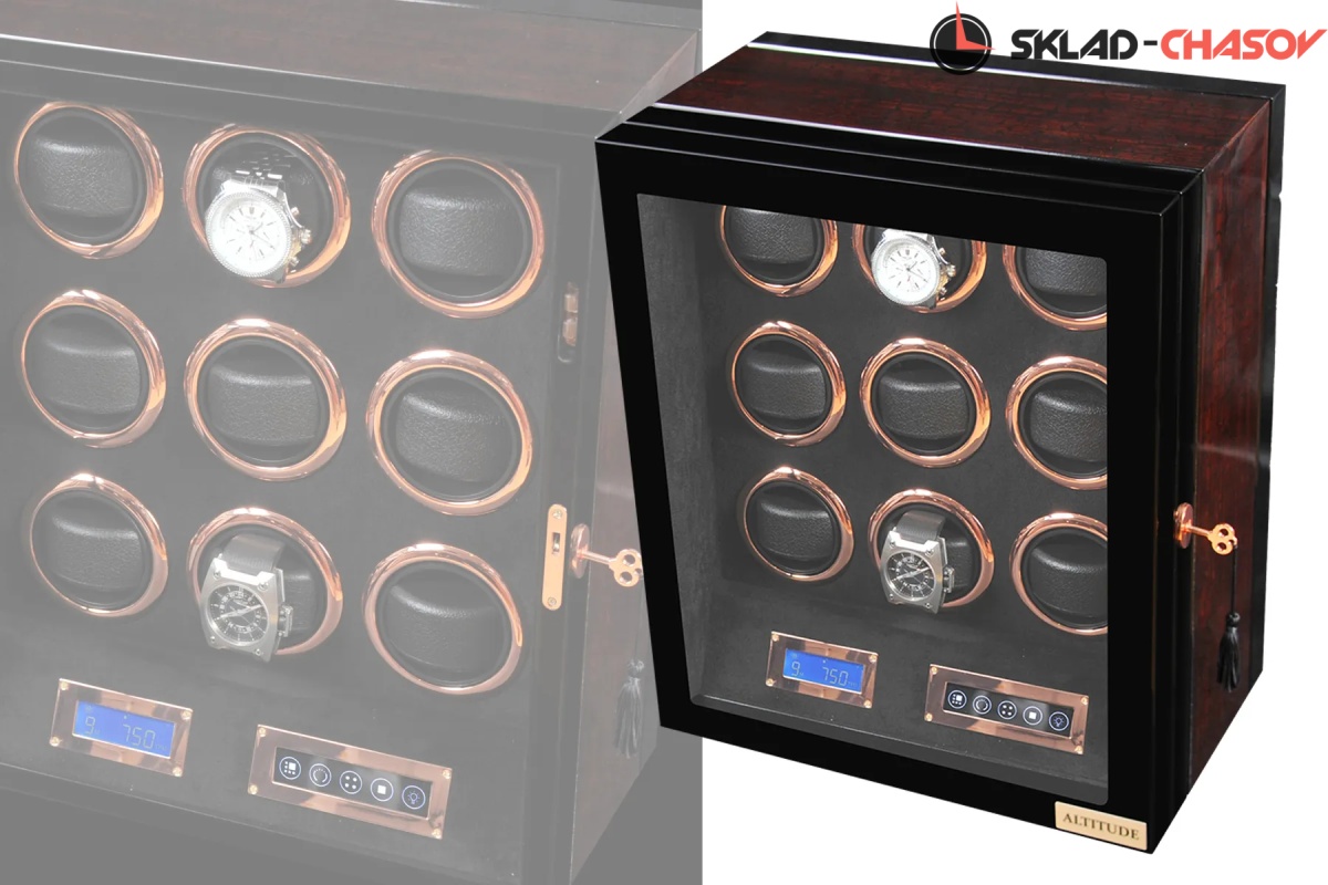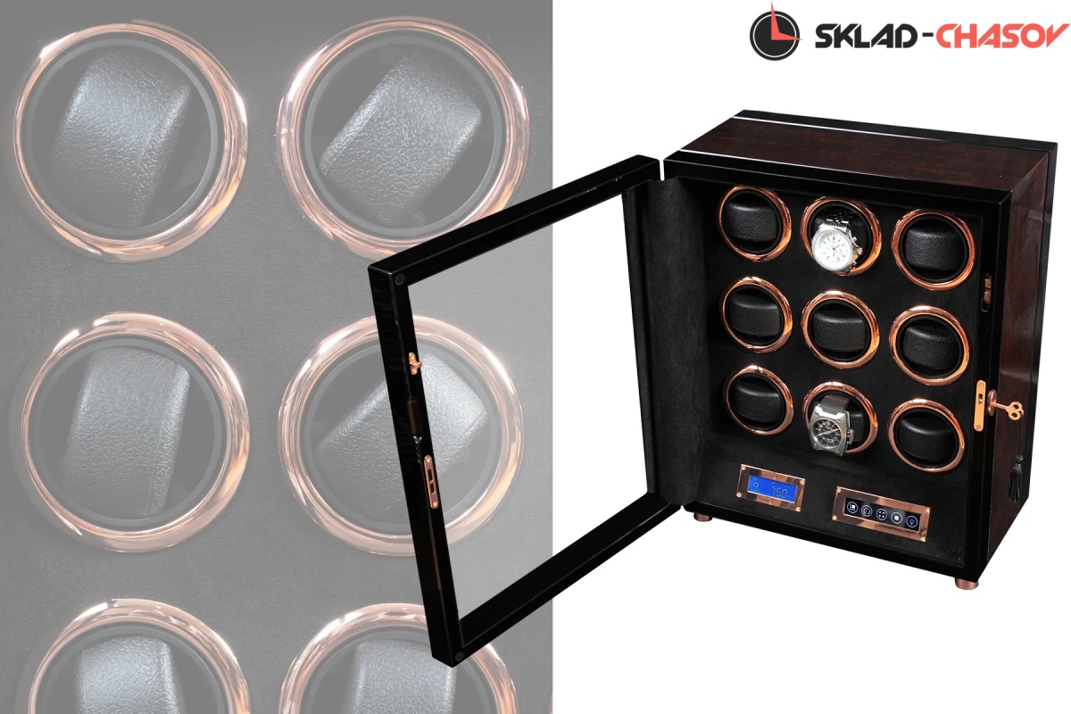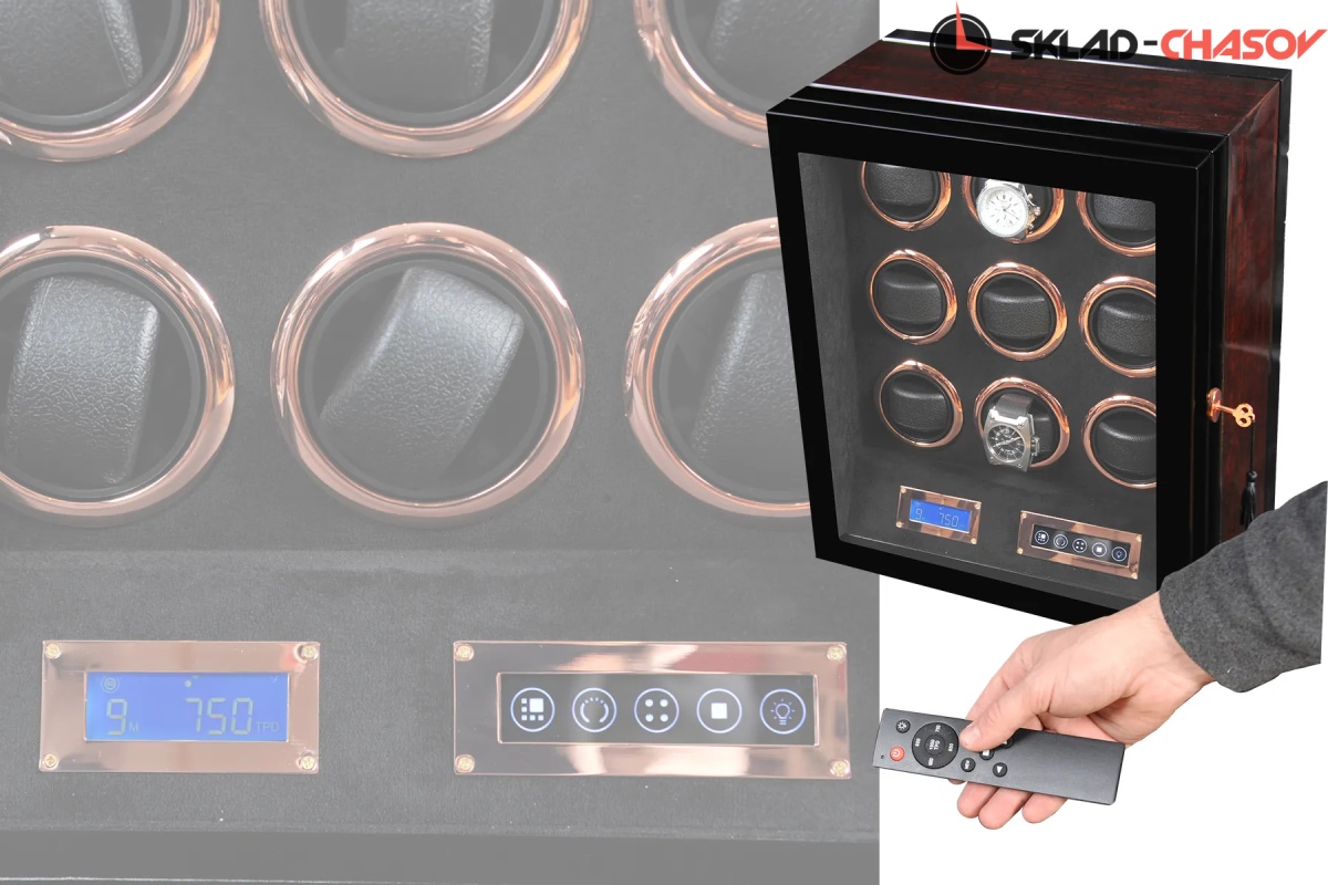 Новая модель "Vector9" .Шкатулка выполнена из чёрного дерева венге в сочетании с деревом макасар. Внутри выстлана чёрной кожей. Электронное табло позволяет подзаводить любые часы. Закрывается на ключик. Мягкие подушечки для часов.