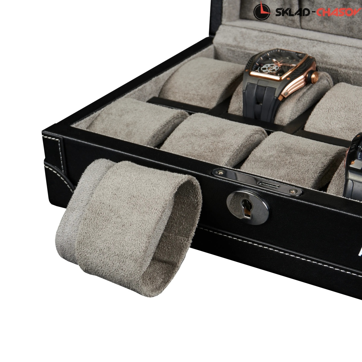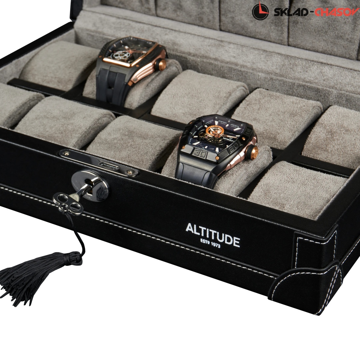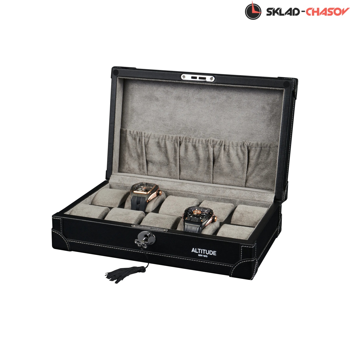 Шкатулка от компании Altitude создана для любителей кожаных изделий. Экстерьер выполнен из мягчайшей экологичной кожи черного цвета. В дополнении по всему корпусу присутствует ровная строчка белоснежного цвета. Приятный интерьер шкатулки из серого велюра будет радовать глаз и подарит тактильное наслаждение при установке 10-ти часов на подушки для хранения. Для сохранности ваших часов на торцевой части есть замок, который закрывается на металлический ключ.