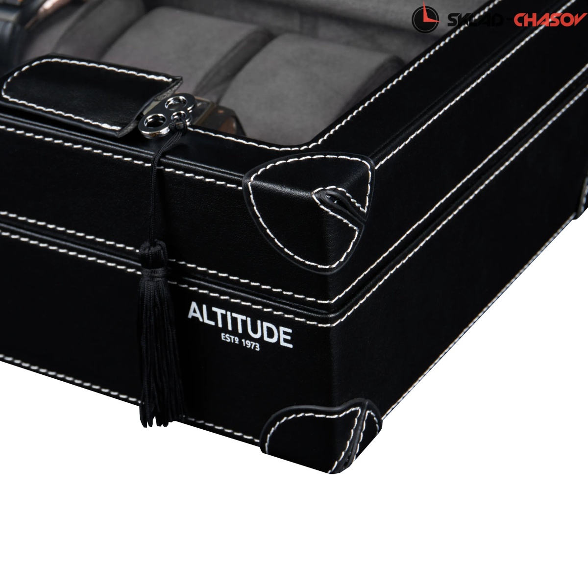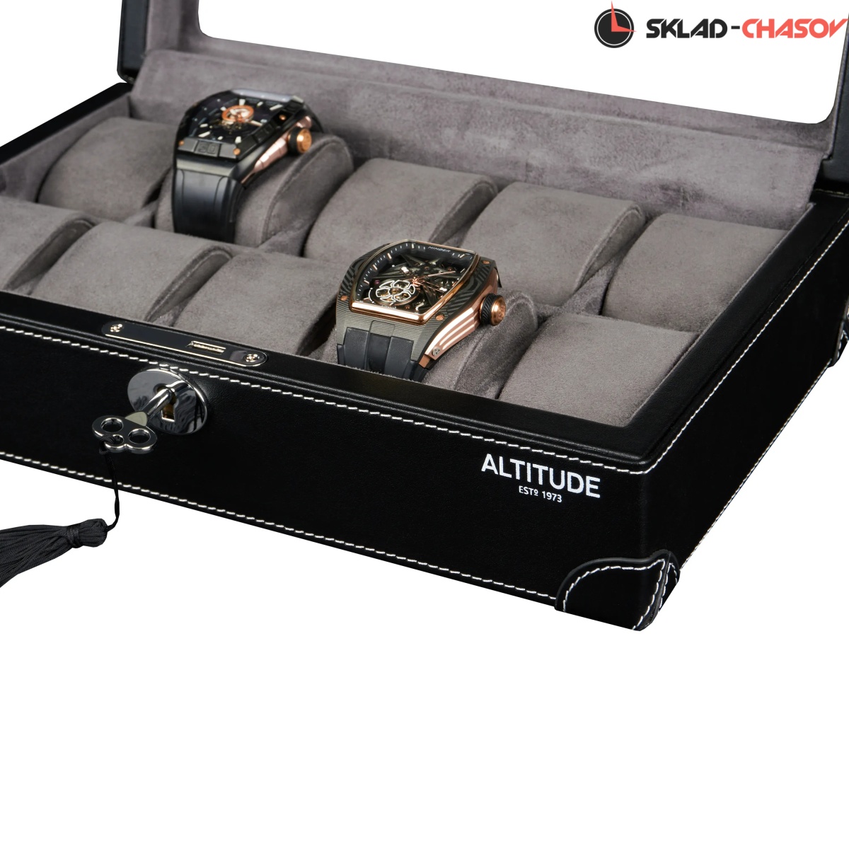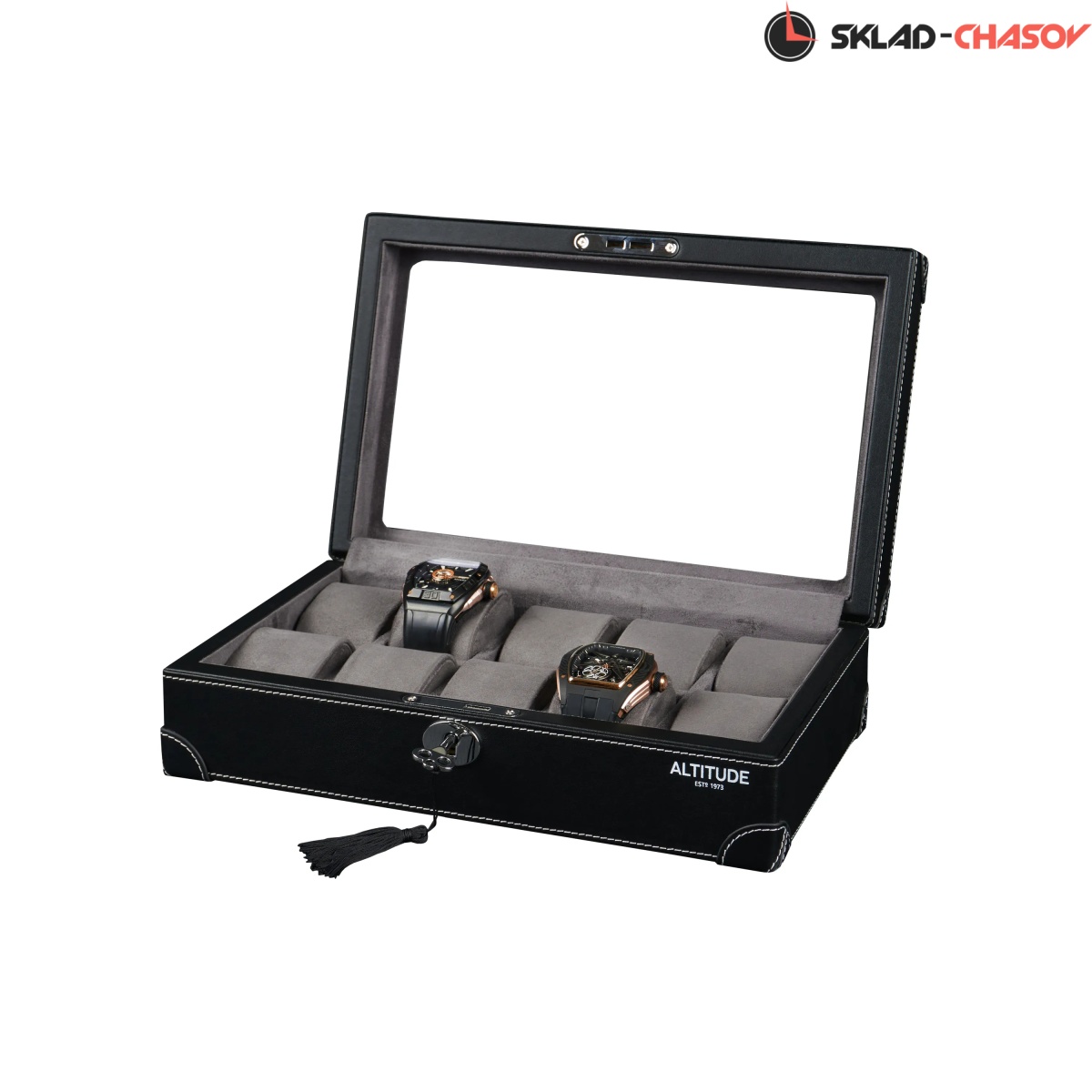 Шкатулка от компании Altitude создана для любителей кожаных изделий. Экстерьер выполнен из мягчайшей экологичной кожи черного цвета. В дополнении по всему корпусу присутствует ровная строчка белоснежного цвета. Приятный интерьер шкатулки из серого велюра будет радовать глаз и подарит тактильное наслаждение при установке 10-ти часов на подушки для хранения. Для сохранности ваших часов на торцевой части есть замок, который закрывается на металлический ключ.