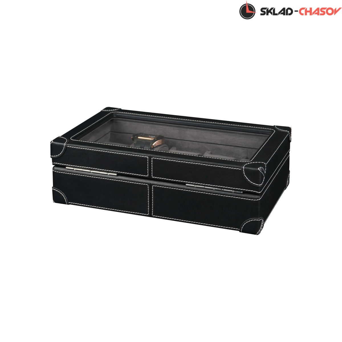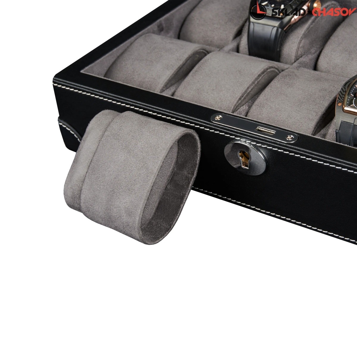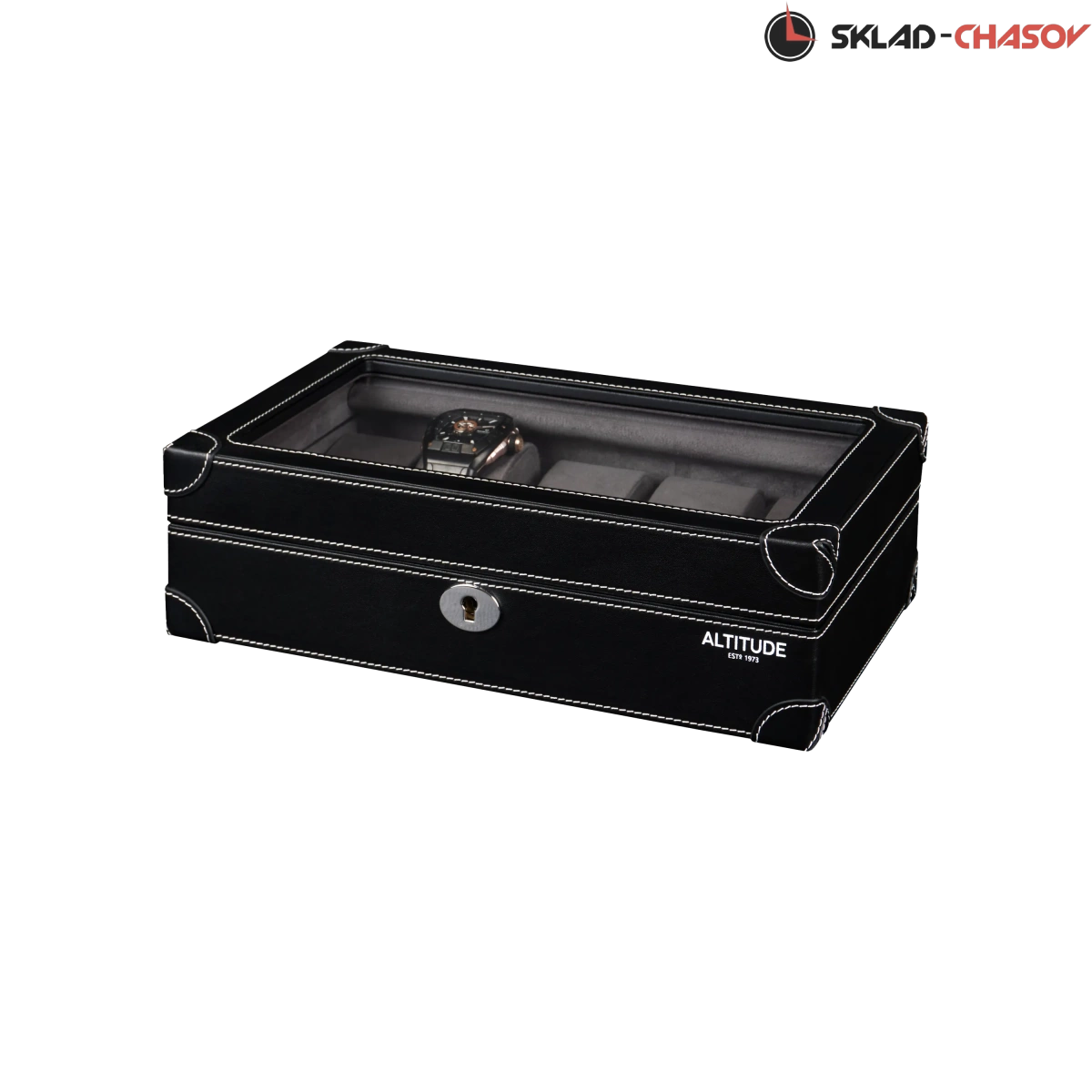 Шкатулка от компании Altitude создана для любителей кожаных изделий. Экстерьер выполнен из мягчайшей экологичной кожи черного цвета. В дополнении по всему корпусу присутствует ровная строчка белоснежного цвета. Приятный интерьер шкатулки из серого велюра будет радовать глаз и подарит тактильное наслаждение при установке 10-ти часов на подушки для хранения. Для сохранности ваших часов на торцевой части есть замок, который закрывается на металлический ключ.