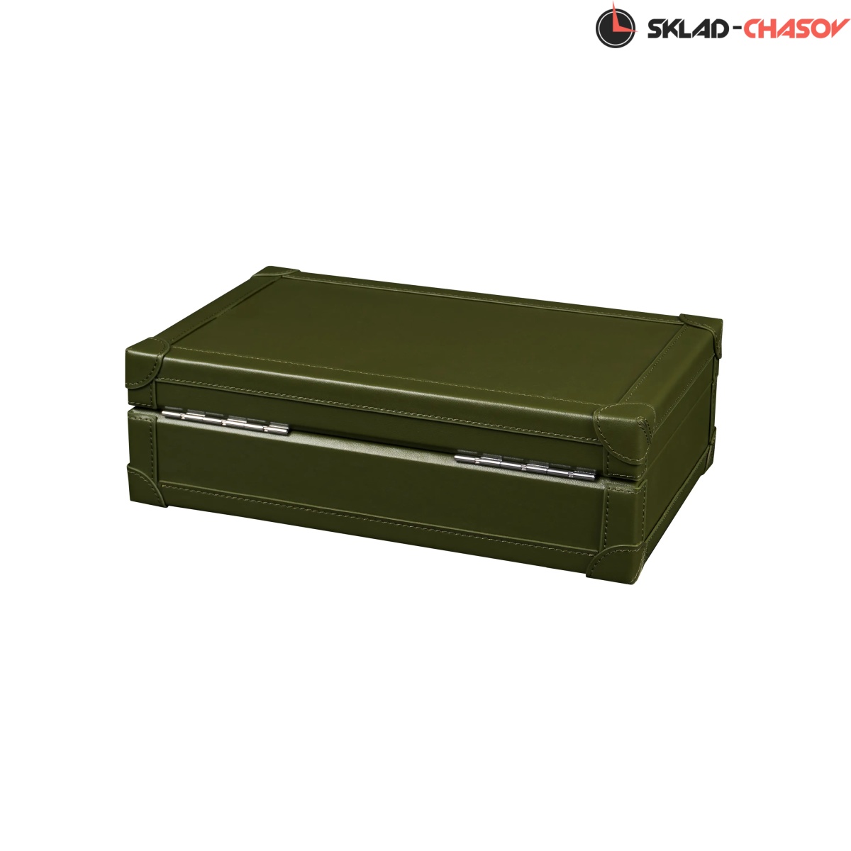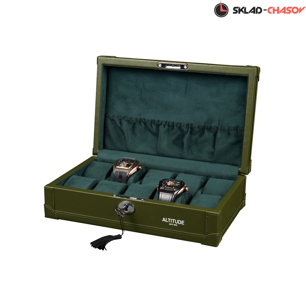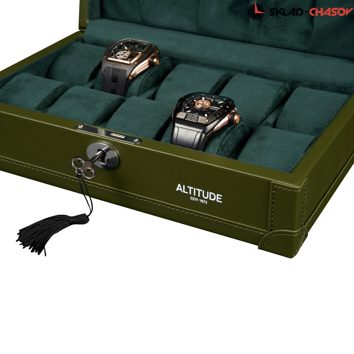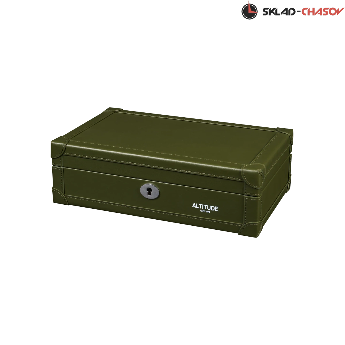 Шкатулка от компании Altitude создана для любителей кожаных изделий. Экстерьер выполнен из мягчайшей экологичной кожи темно-зеленого цвета. В дополнении по всему корпусу присутствует ровная строчка аналогичного цвета. Приятный интерьер шкатулки из серого велюра будет радовать глаз и подарит тактильное наслаждение при установке 10-ти часов на подушки для хранения. Для сохранности ваших часов на торцевой части есть замок, который закрывается на металлический ключ.