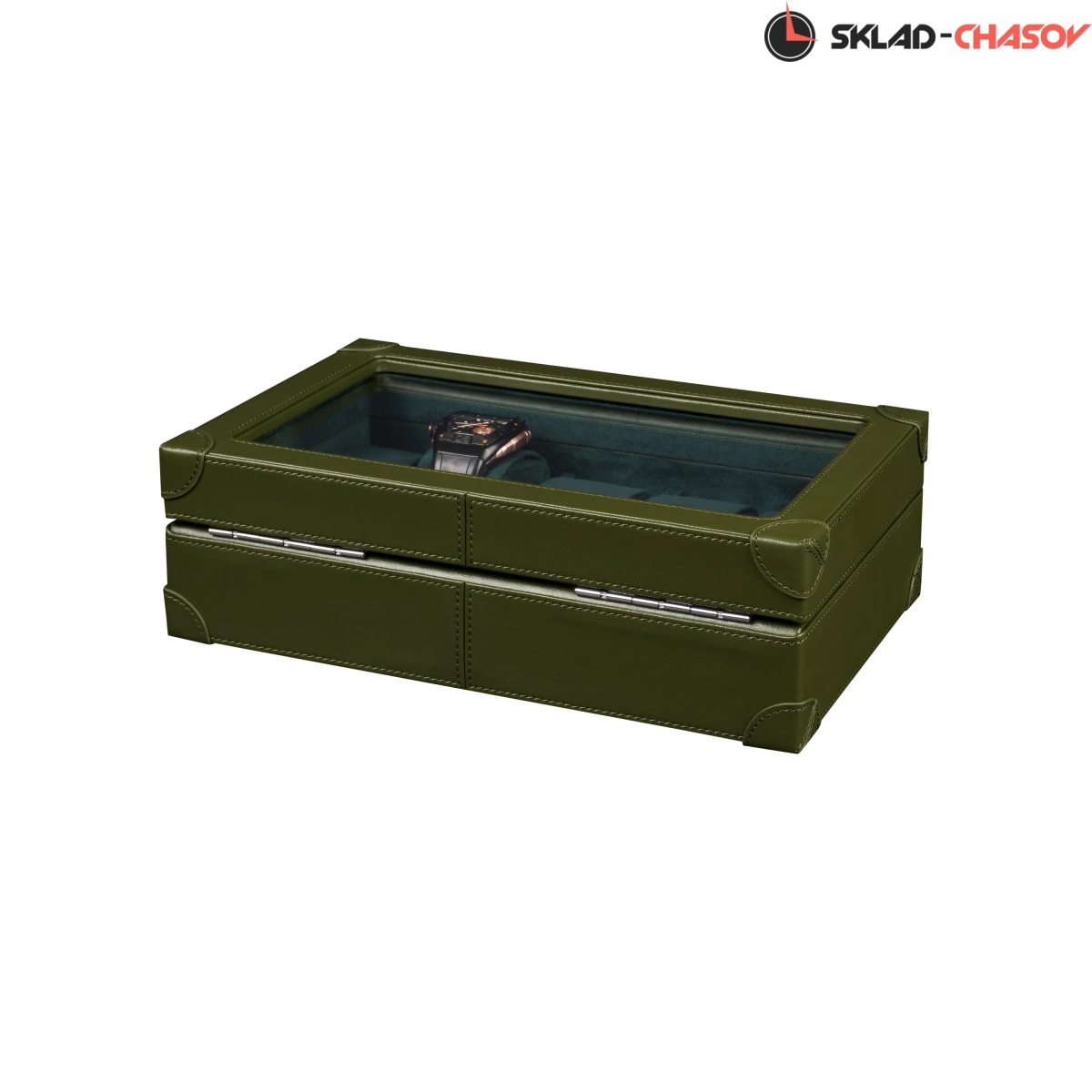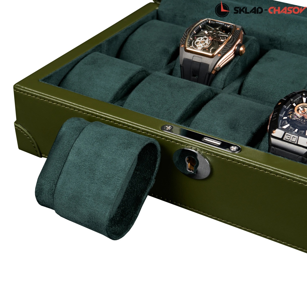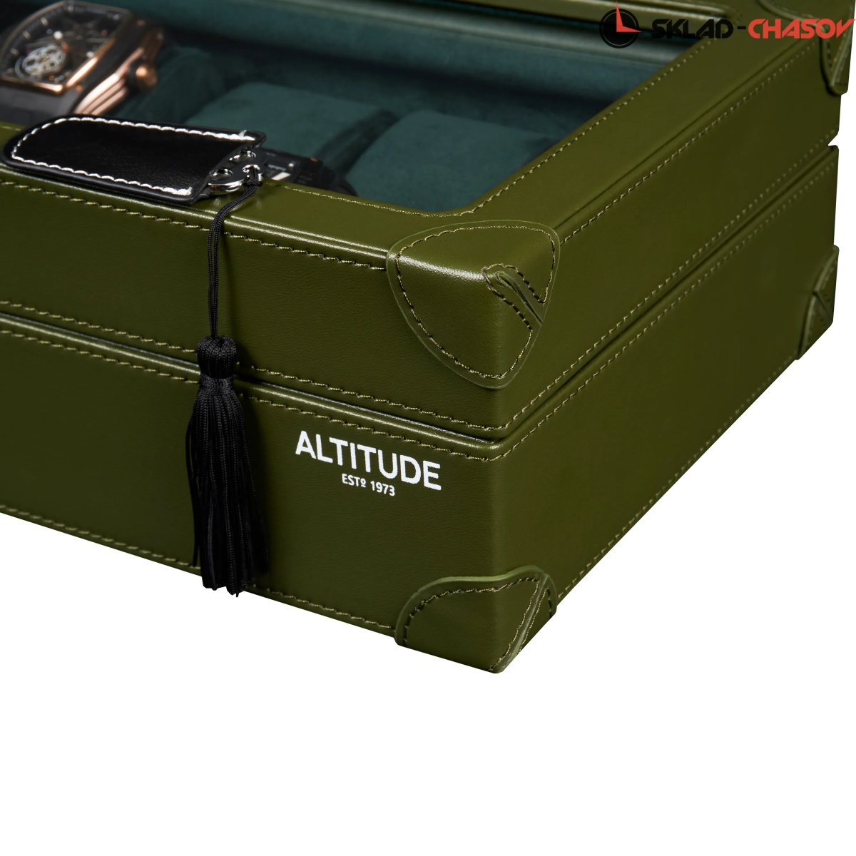 Шкатулка от компании Altitude создана для любителей кожаных изделий. Экстерьер выполнен из мягчайшей экологичной кожи темно-зеленого цвета. В дополнении по всему корпусу присутствует ровная строчка аналогичного цвета. Приятный интерьер шкатулки из серого велюра будет радовать глаз и подарит тактильное наслаждение при установке 10-ти часов на подушки для хранения. Для сохранности ваших часов на торцевой части есть замок, который закрывается на металлический ключ.
