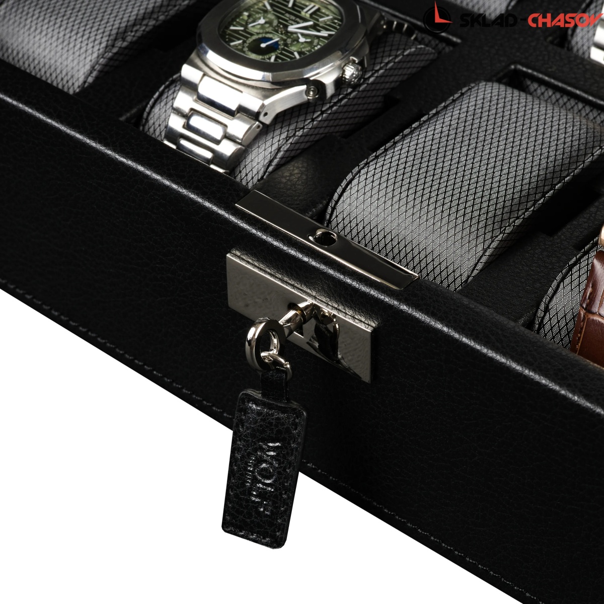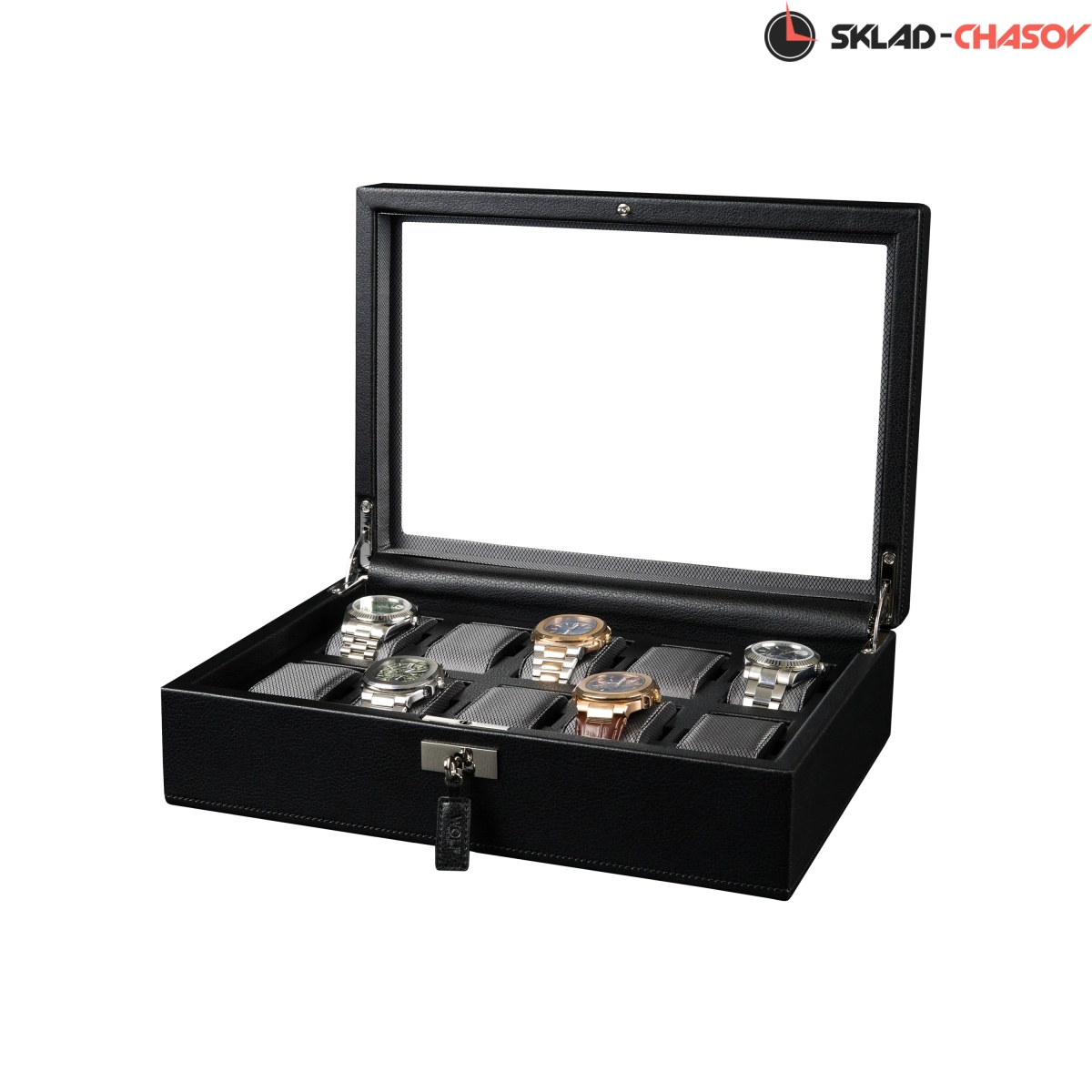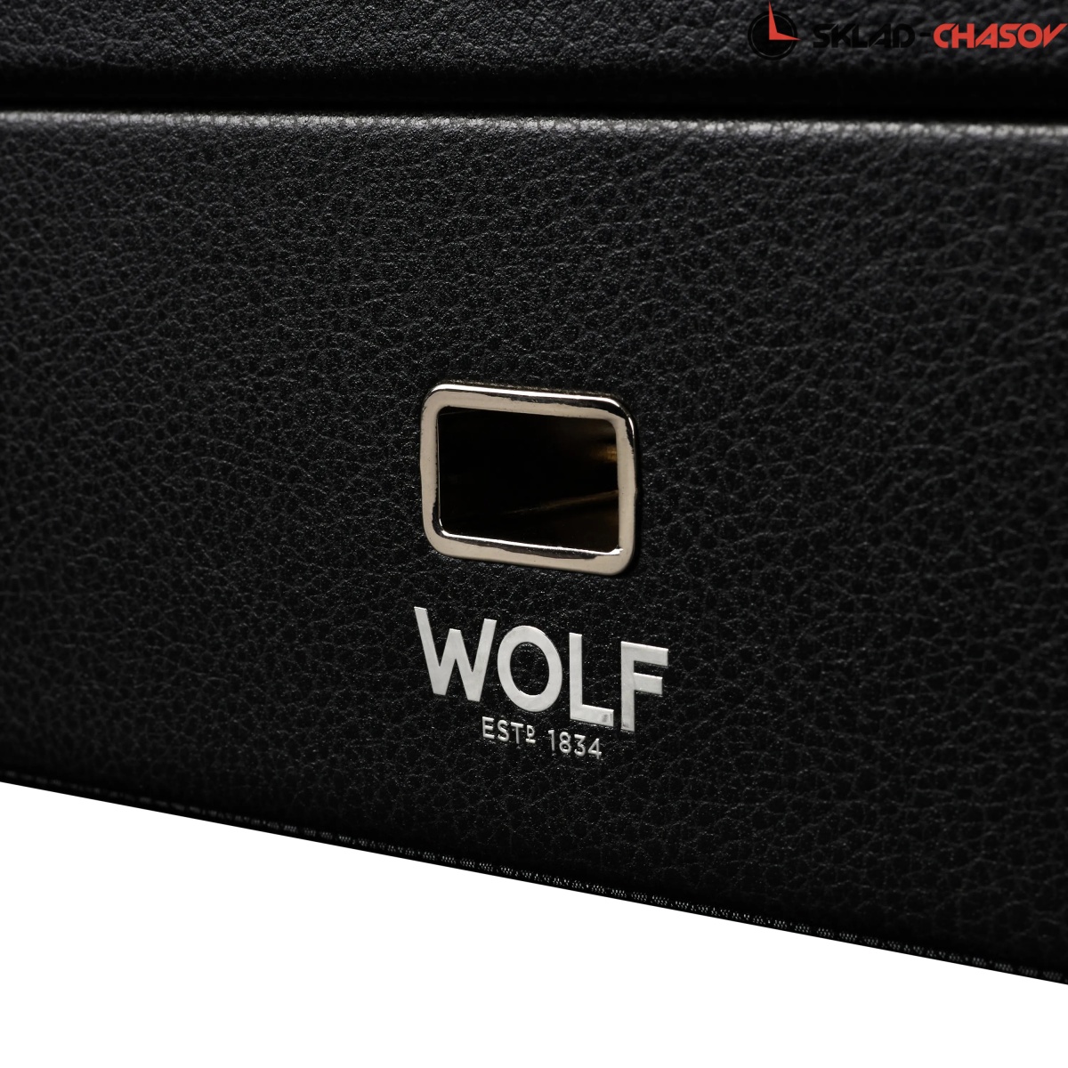 Классика от самого известного английского бренда Wolf поражает воображение своим видом и используемыми материалами. Шкатулка создана для хранения ваших часов в безопасности под металлическим ключиком. Изящность модели прослеживается в каждой детали, в каждой линии. Экстерьер выполнен из мягкой экологичной кожи высшего сорта, плавно переходящий в современный интерьер с использованием аналогичной кожи и дизайнерской микрофибры. Абсолютно каждый элемент фурнитуры покрыт глянцевой краской. Через натуральное стекло можно созерцать коллекцию из 10-ти наручных часов на подвесных подушечках. Для ценителей смарт-часов продуман специальный сквозной туннель для провода зарядки. Важно отметить, что вся продукция премиального бренда Wolf изготавливается вручную с использованием экологически чистых материалов.