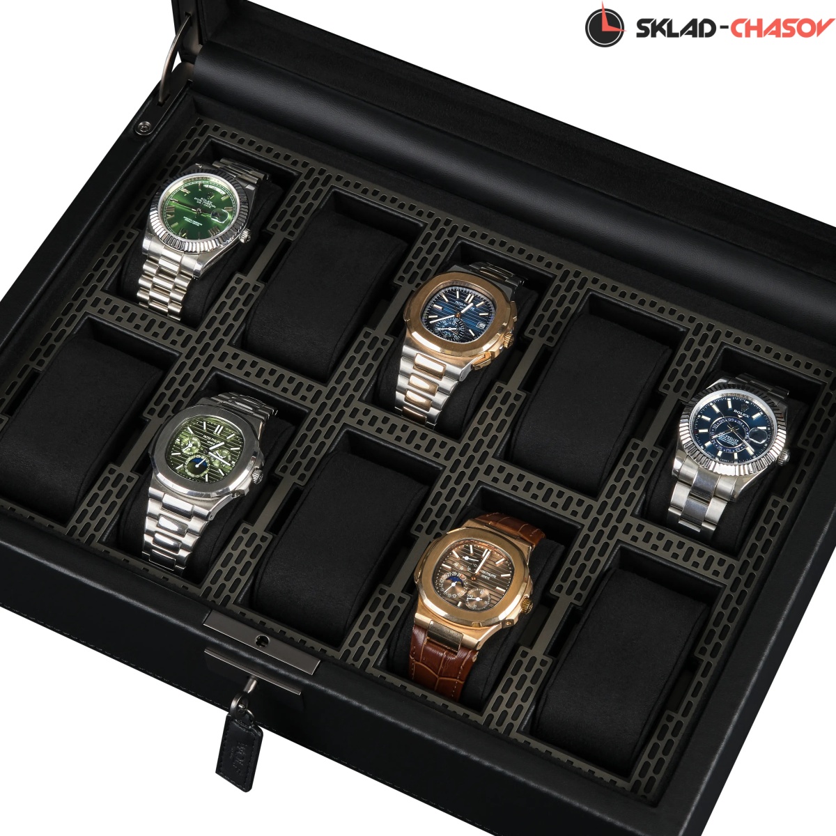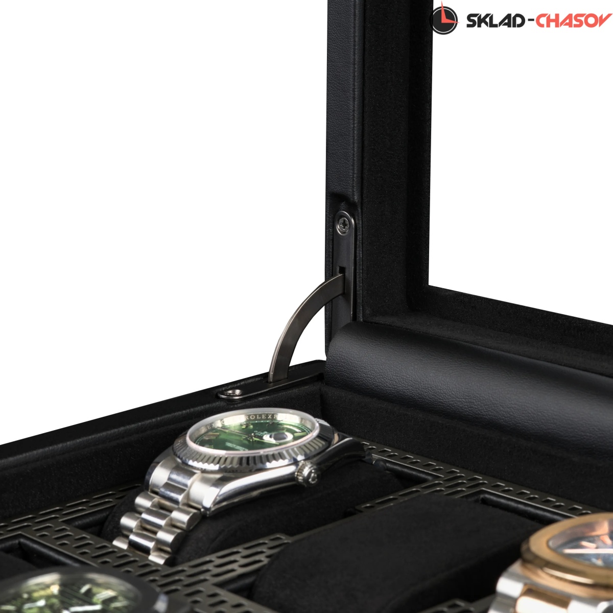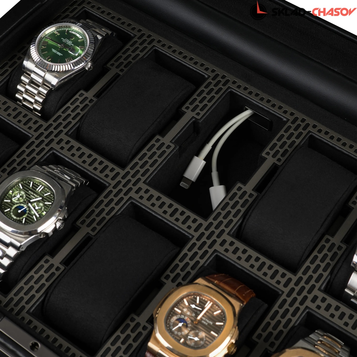 Коллекция Axis от самого известного английского бренда Wolf поражает воображение своим видом и используемыми материалами. Шкатулка создана для хранения ваших часов в безопасности под металлическим ключиком. Экстерьер выполнен из мягкой экологичной кожи высшего сорта, плавно переходящий в современный интерьер с использованием матовой перфорированной стали и необычайно мягкого велюра. Абсолютно каждый элемент фурнитуры покрыт порошковой краской. Через натуральное стекло можно созерцать коллекцию из 10-ти наручных часов на подвесных подушечках. Для ценителей смарт-часов продуман специальный сквозной туннель для провода зарядки. Важно отметить, что вся продукция премиального бренда Wolf изготавливается вручную с использованием экологически чистых материалов.