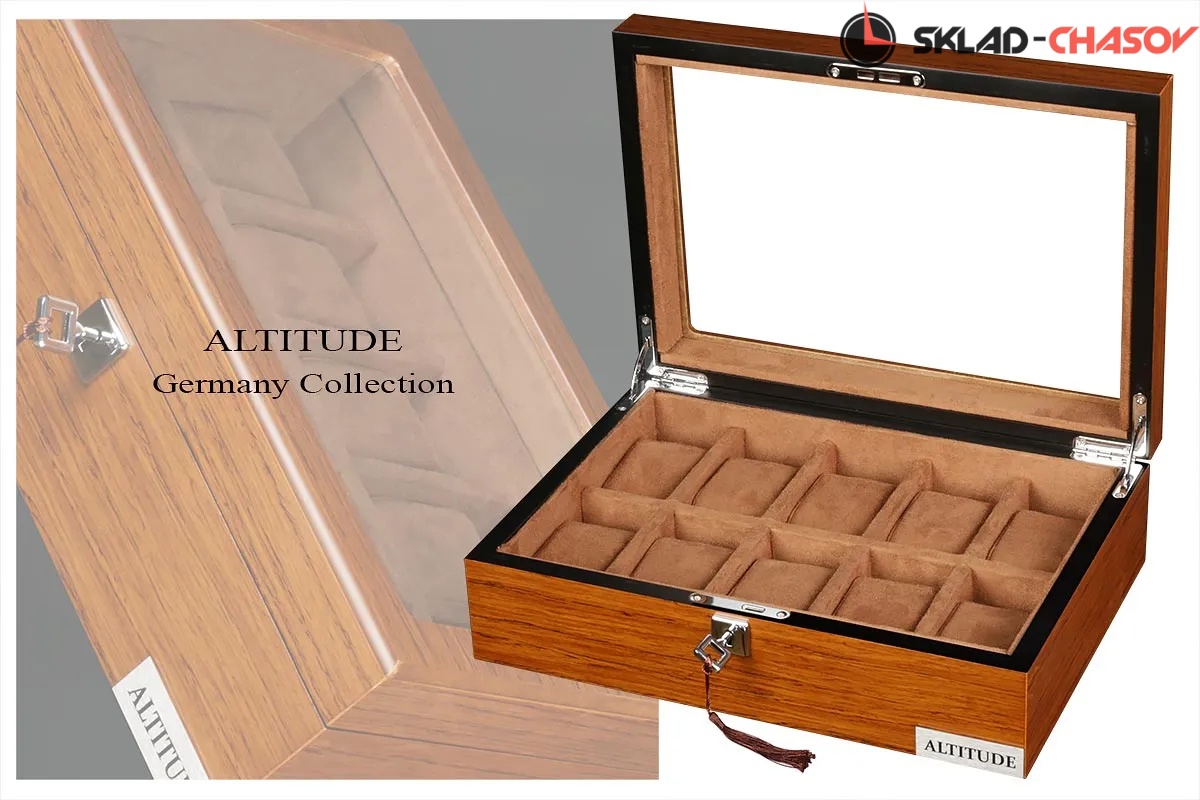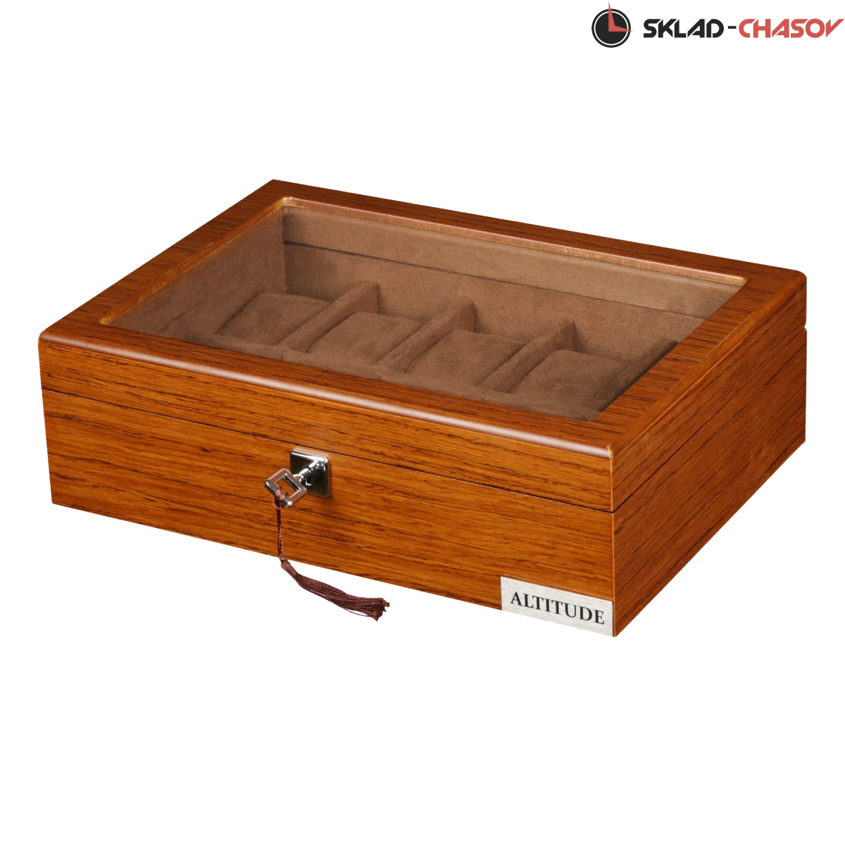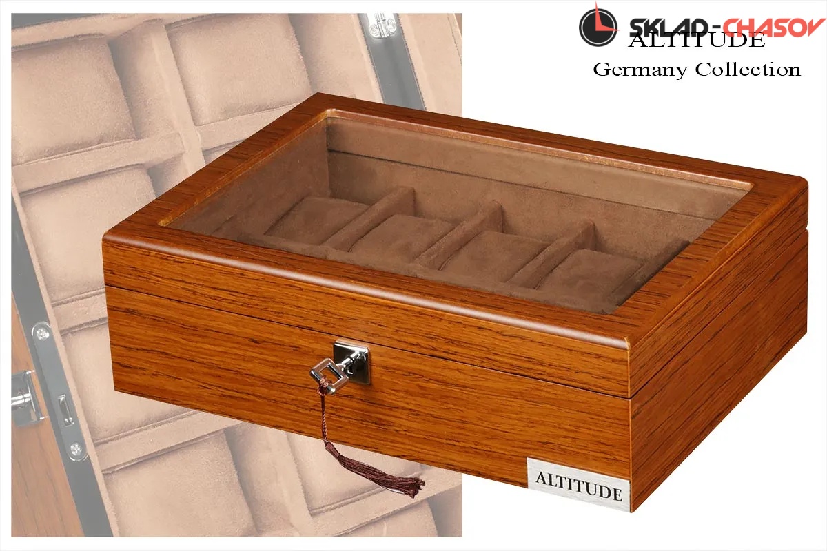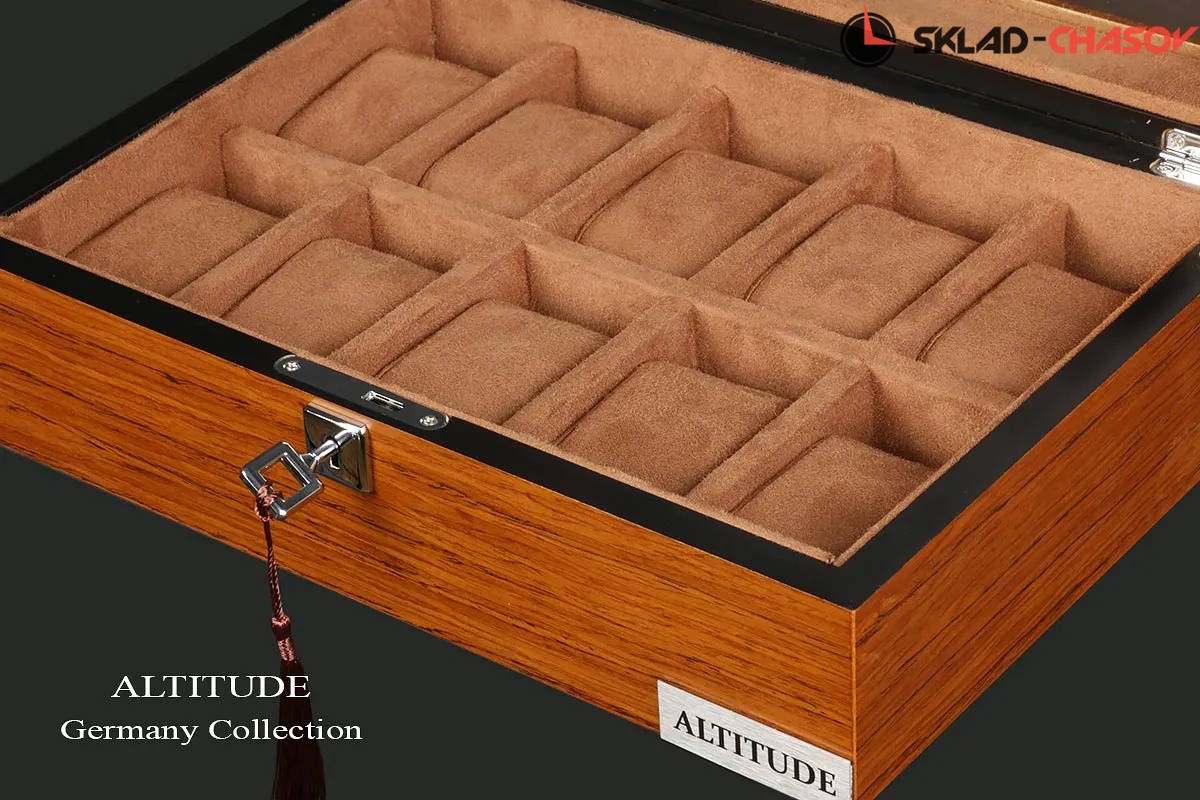 Новая серия шкатулок для хранения часов “BoxTradition", выполнена из благородного дерева “Сандал" и предназначена для бережного хранения 10 часов, внутри отделка из микрофибры в цвет дерева, подушечки для часов универсальны и подходят для большинства часов. Снаружи стекло для видимости ваших часов, закрывается на удобный ключик с фирменным кожаным футляром. Отличное сочетание качества и цены — это девиз этой серии для хранения часов от Altitude.