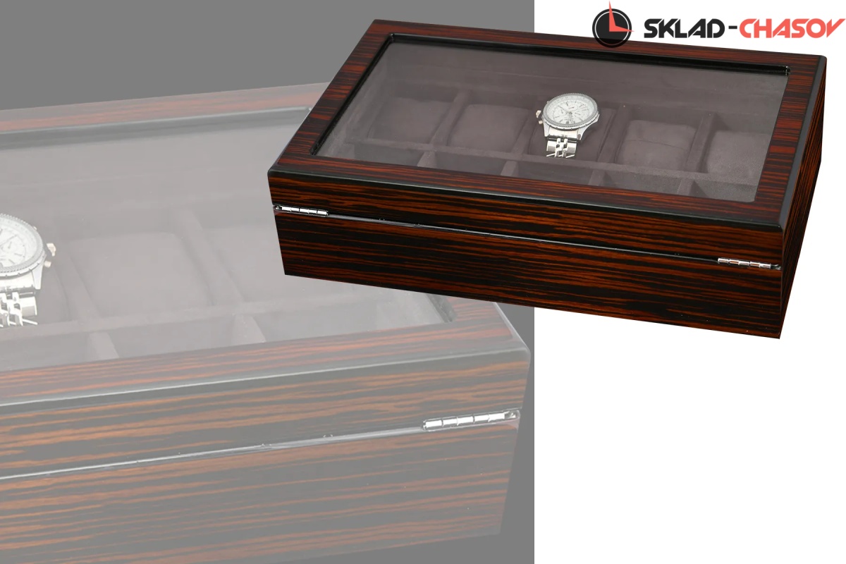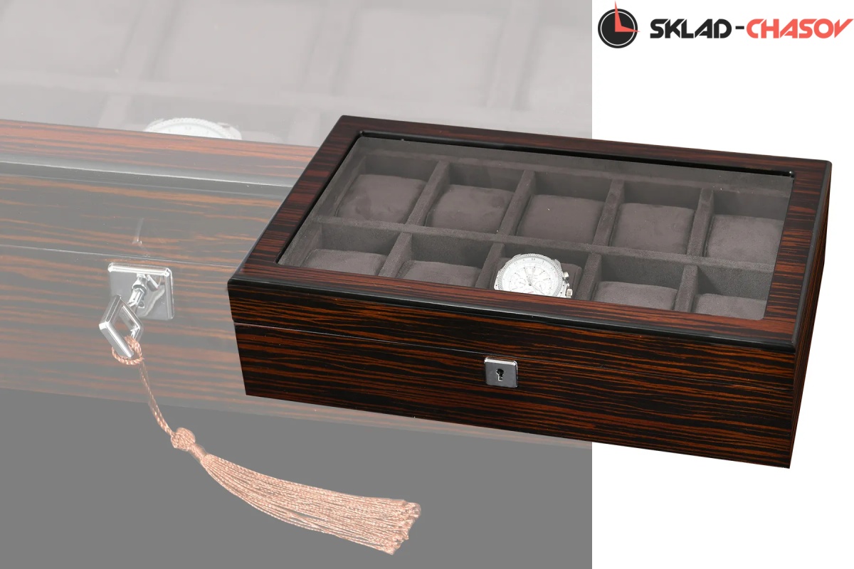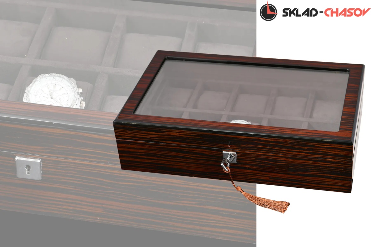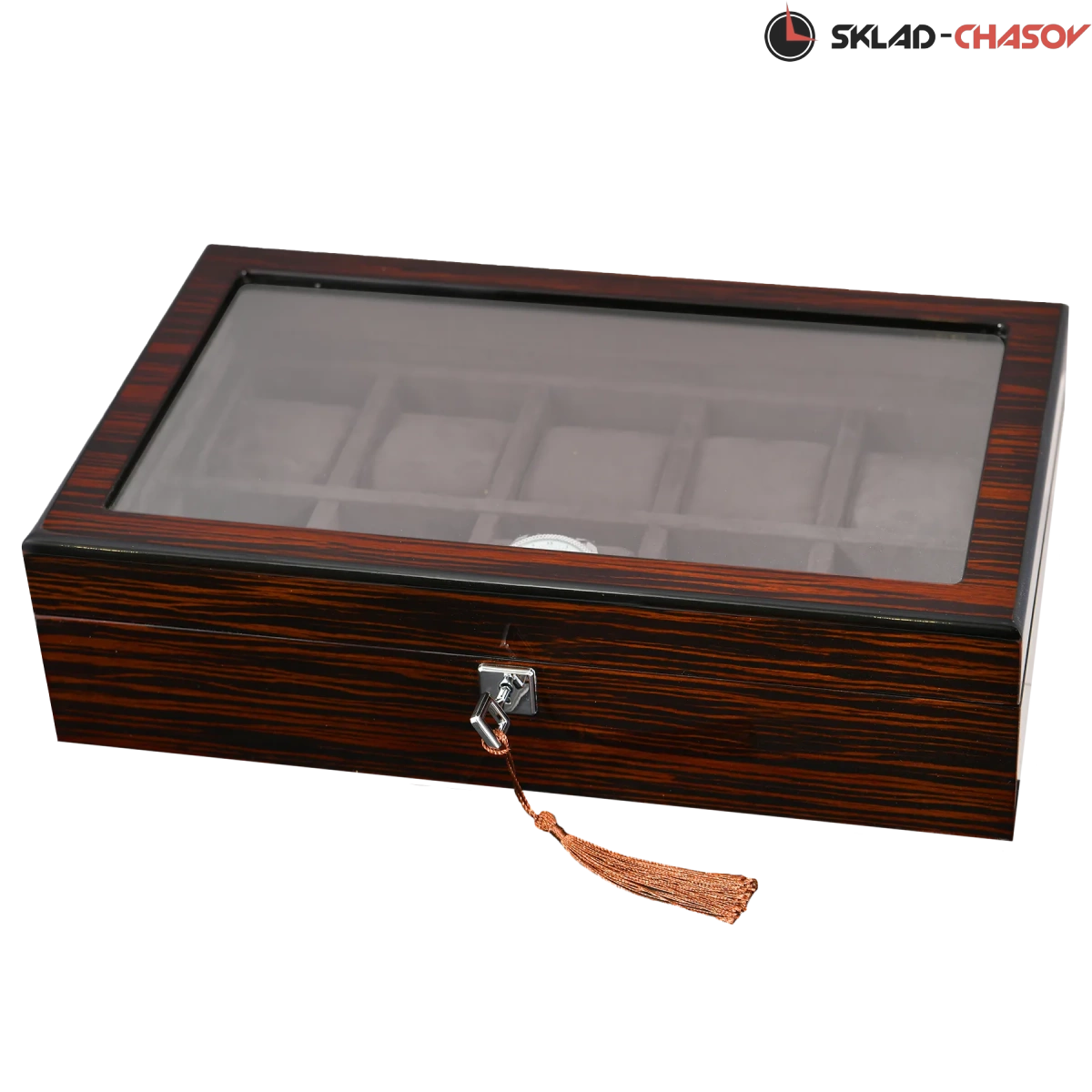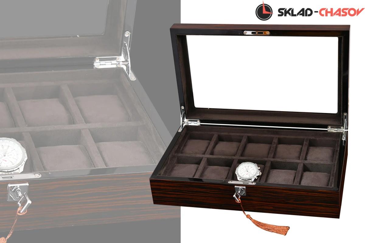 Шкатулка для бережного хранения 10 часов из серии "BoxTradition" от известного бренда Altitude. Корпус шкатулки выполнен из благородного дерева "венге" внутри отделка из высококачественной микрофибры в цвет корпуса. Стеклянная дверца снаружи, закрываемая на ключик. Универсальные подушечки для часов.