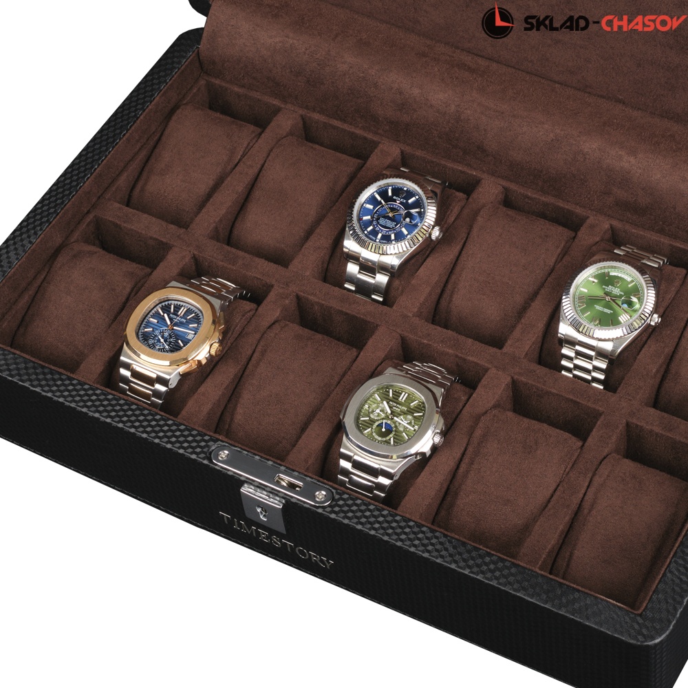 Открывая крышку шкатулки легким движением руки можно любоваться коллекцией из 12-ти часов. Сочетание цветов всех деталей и внутреннего темного мягкого бархата является превосходным для ценителей шедевров и страстных коллекционеров часов.