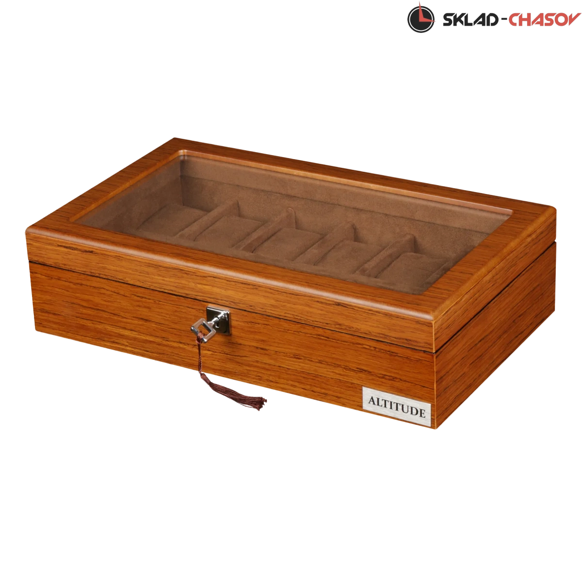 Шкатулка для бережного хранения 12 часов из серии “BoxTradition” от известного бренда Altitude. Корпус шкатулки выполнен из благородного дерева "Сандал", внутри отделка из высококачественной микрофибры в цвет корпуса. Стеклянная дверца снаружи, закрываемая на ключик. Универсальные подушечки для часов.
