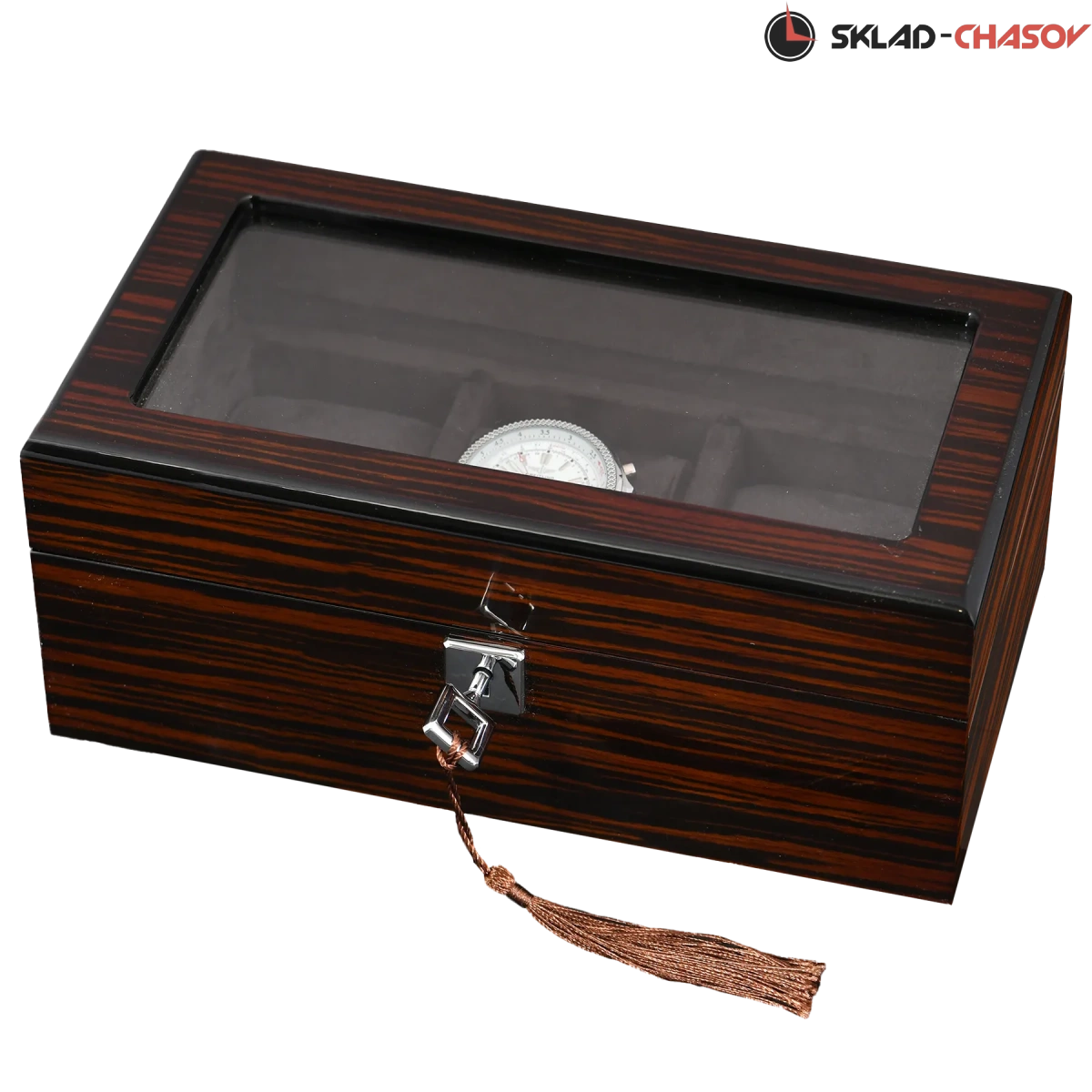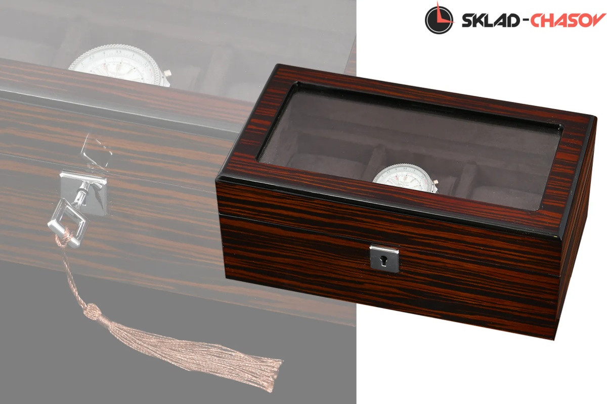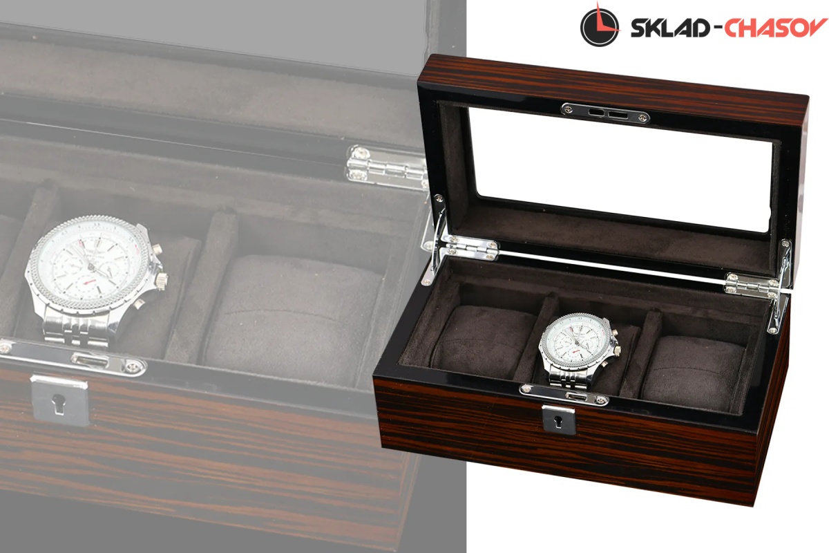 Шкатулка для бережного хранения 3 часов из серии “BoxTraditionM” от известного бренда Altitude. Корпус шкатулки выполнен из благородного дерева "венге» внутри отделка из высококачественной микрофибры в цвет корпуса чёрного цвета .Стеклянная дверца снаружи, закрываемая на ключик. Универсальные подушечки для часов.