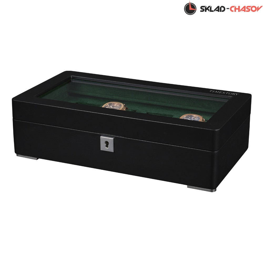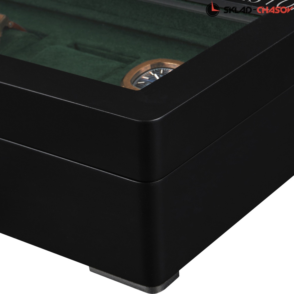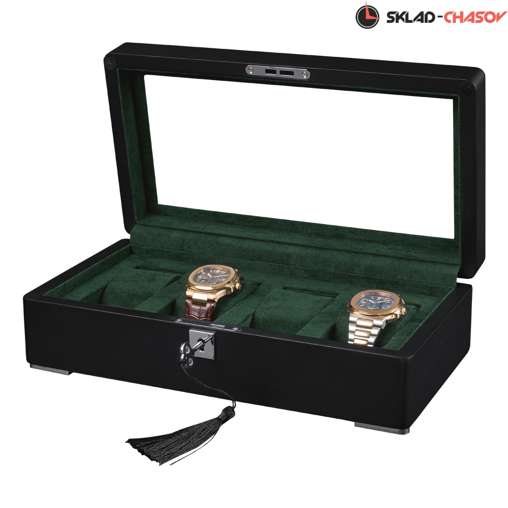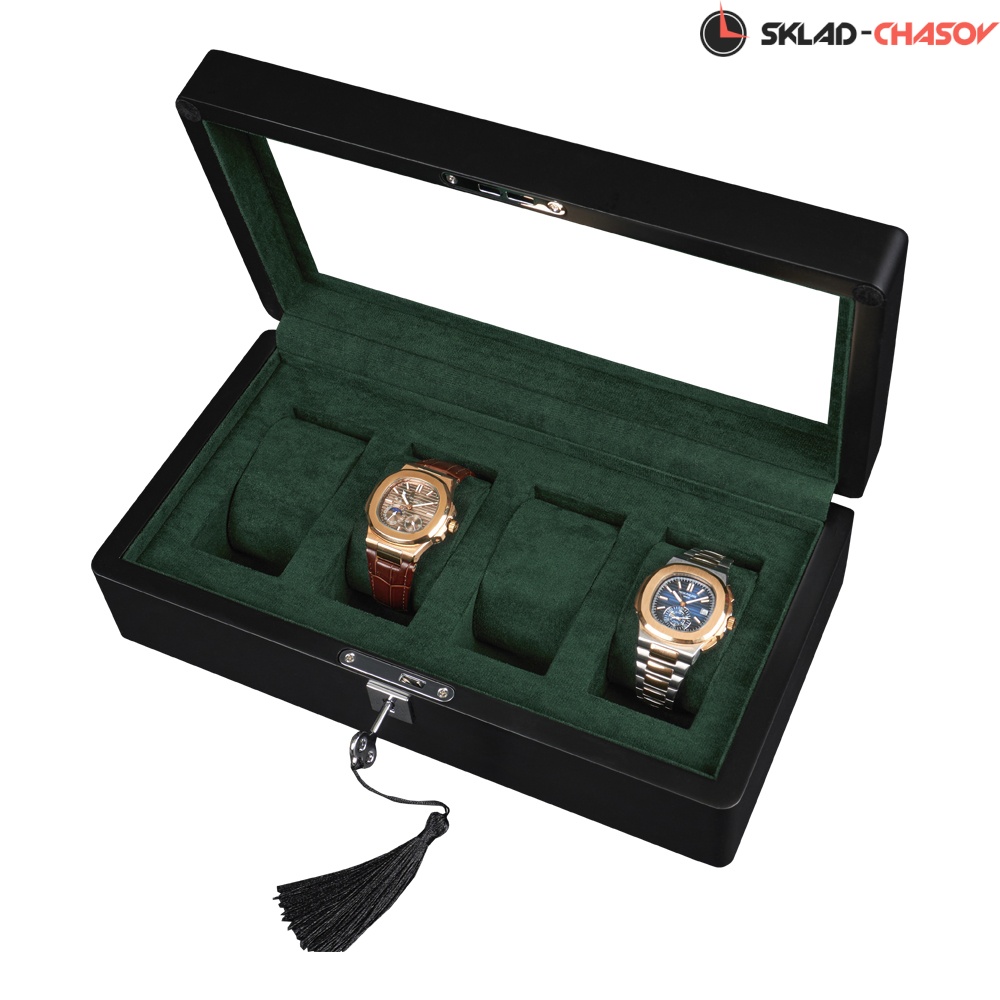 Открывая крышку шкатулки легким движением руки, можно любоваться коллекцией из 4-ёх часов. Неповторимое исполнение экстерьера в темном дереве, покрытом матовым лаком черного цвета, придает изящность. Демонстрируя свои часы через крышку, нужно не забывать про их сохранность. Обеспечить ее позволяет небольшой квадратный замочек на торцевой части, закрывающийся на ключ.