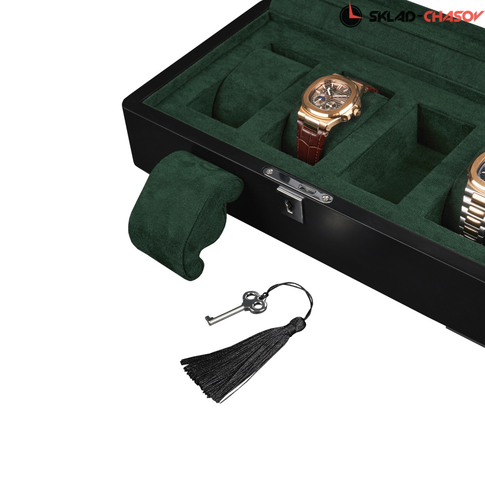 Элегантность в интерьере дополняет приятный бархат изумрудного оттенка. Эргономичные подушки позволят с максимальным комфортом и удобством застегнуть на них часы любых размеров.