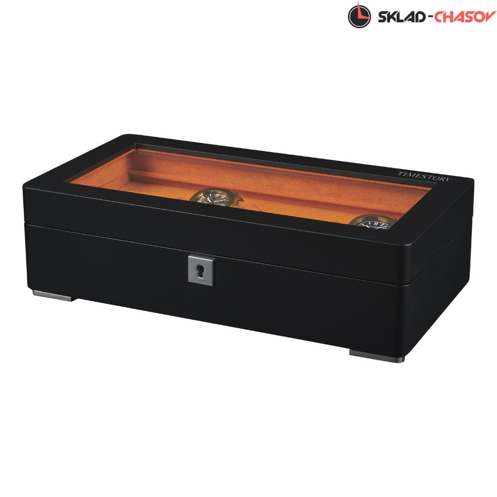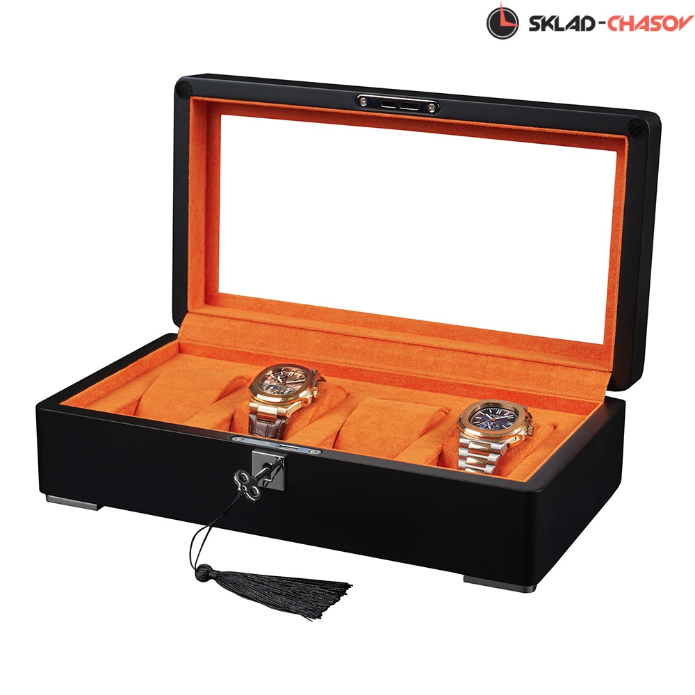 Открывая крышку шкатулки легким движением руки, можно любоваться коллекцией из 4-ёх часов. Неповторимое исполнение экстерьера в темном дереве, покрытом матовым лаком черного цвета, придает изящность. Демонстрируя свои часы через крышку, нужно не забывать про их сохранность. Обеспечить ее позволяет небольшой квадратный замочек на торцевой части, закрывающийся на ключ.