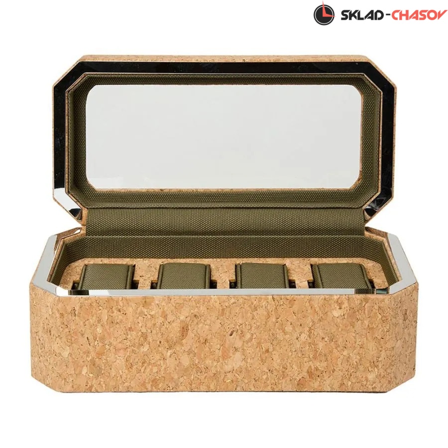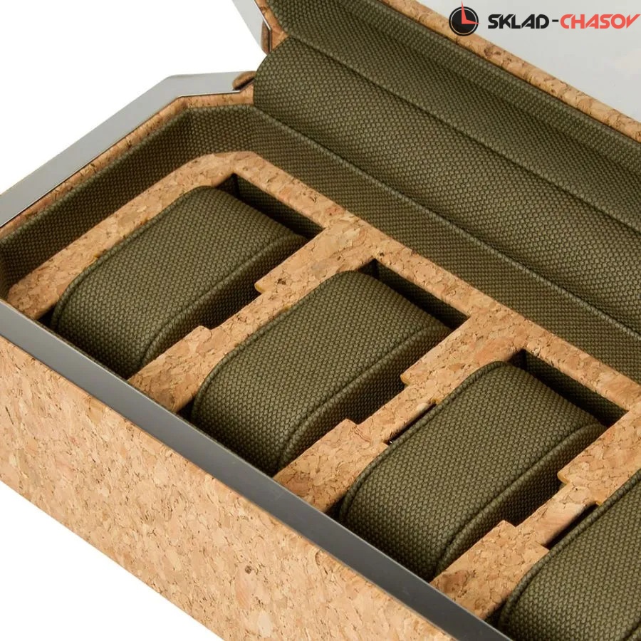 Модель Cortiсa сочетает в себе природную эстетику, архитектурную точность форм и современную утончённость, вдохновлённую классическими часовыми шкатулками. Корпус шкатулки выполнен вручную из экологически чистой португальской пробки, выращенной устойчивым способом, а восьмиугольная форма с металлическими акцентами придаёт изделию характерный стиль, идеально сочетающийся с любыми моделями часов. Прозрачная крышка из закалённого стекла позволяет демонстрировать коллекцию, не нарушая её безопасности и защищённости. Внутри расположены четыре подвешенные подушечки, обеспечивающие бережное хранение без давления на браслеты — они подходят для любых размеров и типов часов. Эта модель станет утончённым решением для тех, кто ценит не только надёжную организацию хранения, но и эстетически выверенный облик аксессуаров.