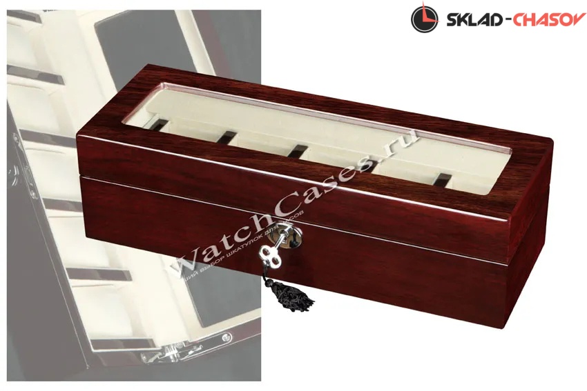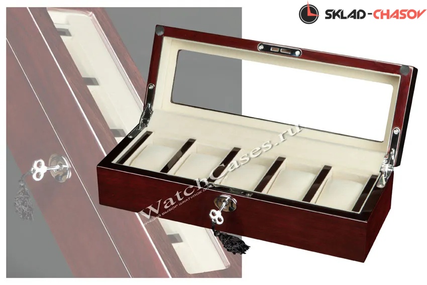 Шкатулка для бережного и удобного хранения 5-ти механических часов от фирмы TWING-PAK. Очень популярная, удачная модель из натурального дерева,, покрытое множественными слоями глянцевого лака. Внутри шкатулка отделана высококачественным бархатом белого цвета. Пять отсеков для часов, оснащеные разборными универсальными двухкольцевыми подушечками, предназначенными для ремешков разной длины. Фурнитура - хромированный металл. Закрывается на ключик - в комплекте 2 шт. Детальное описание: Длина окружности основного кольца подушки 20 см. Длина окружности внутреннего кольца подушки 17 см. Размер ячейки без подушки 4,5х8,0х4,5 см.