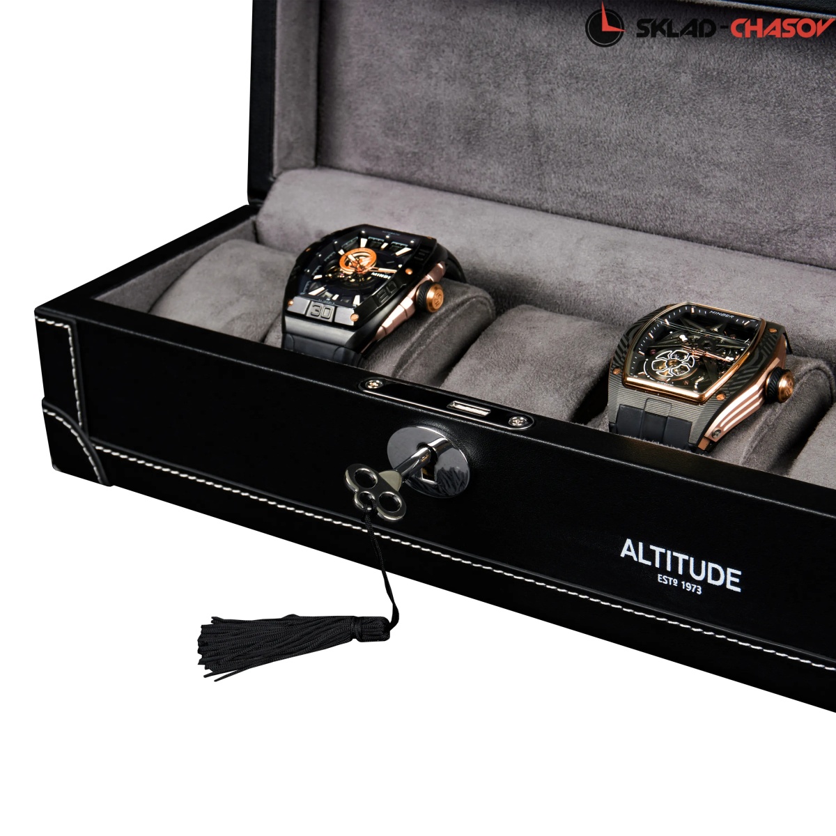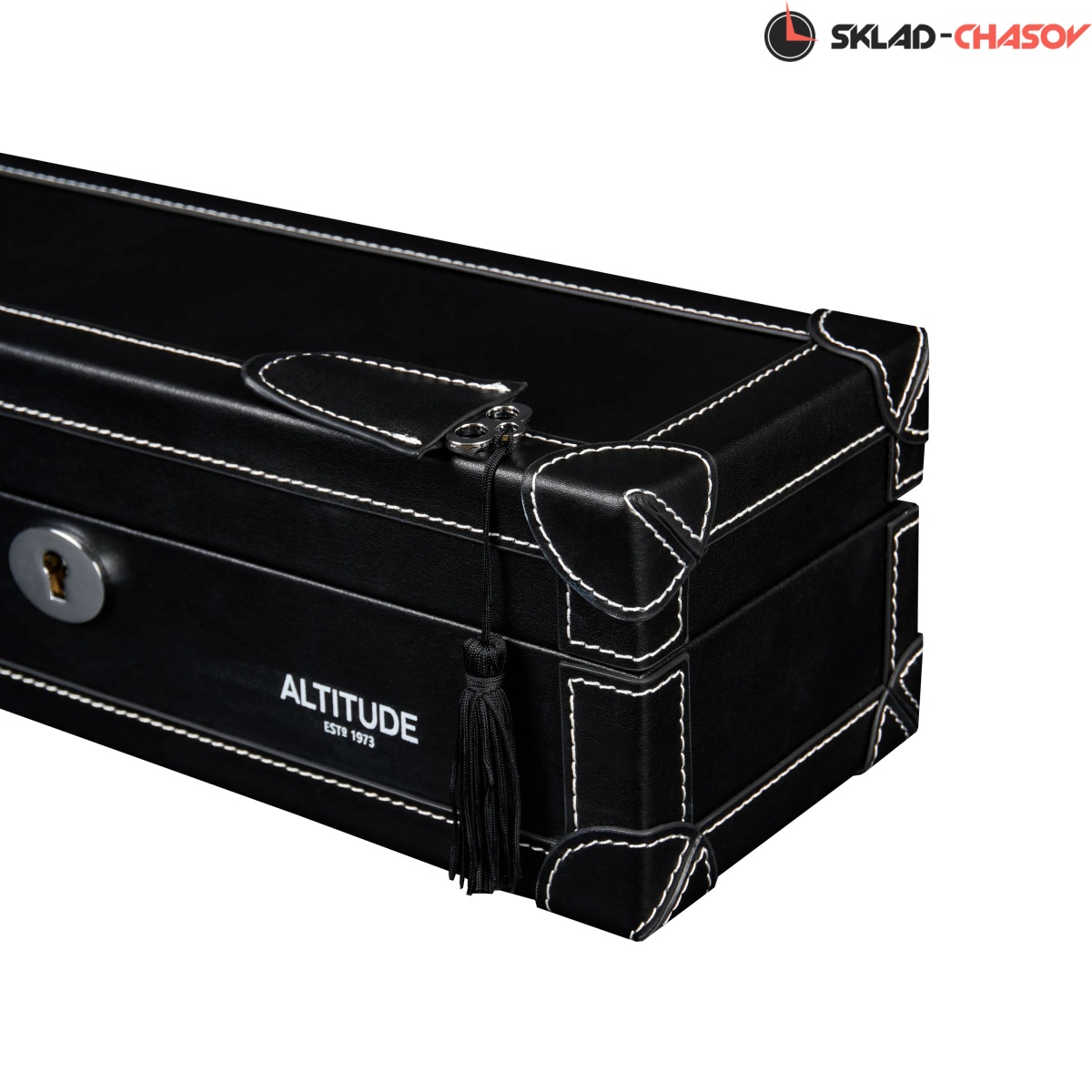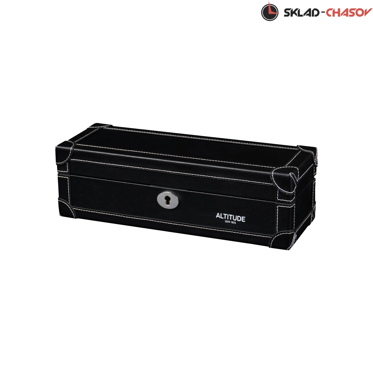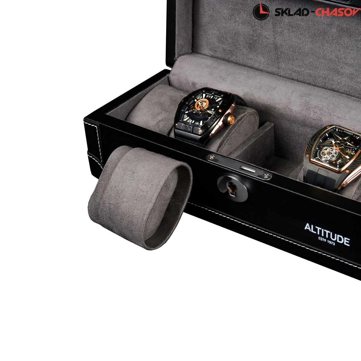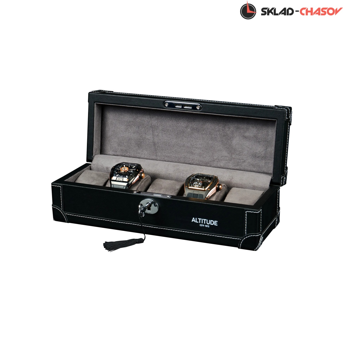Шкатулка от компании Altitude создана для любителей кожаных изделий. Экстерьер выполнен из мягчайшей экологичной кожи черного цвета. В дополнении по всему корпусу присутствует ровная строчка белоснежного цвета. Приятный интерьер шкатулки из серого велюра будет радовать глаз и подарит тактильное наслаждение при установке 5-ти часов на подушки для хранения. Для сохранности ваших часов на торцевой части есть замок, который закрывается на металлический ключ.