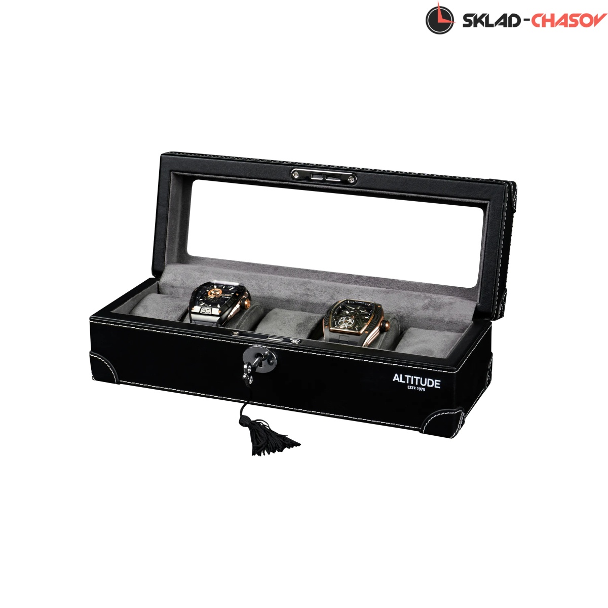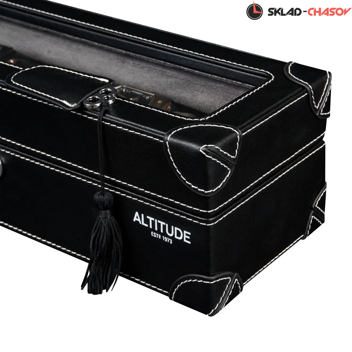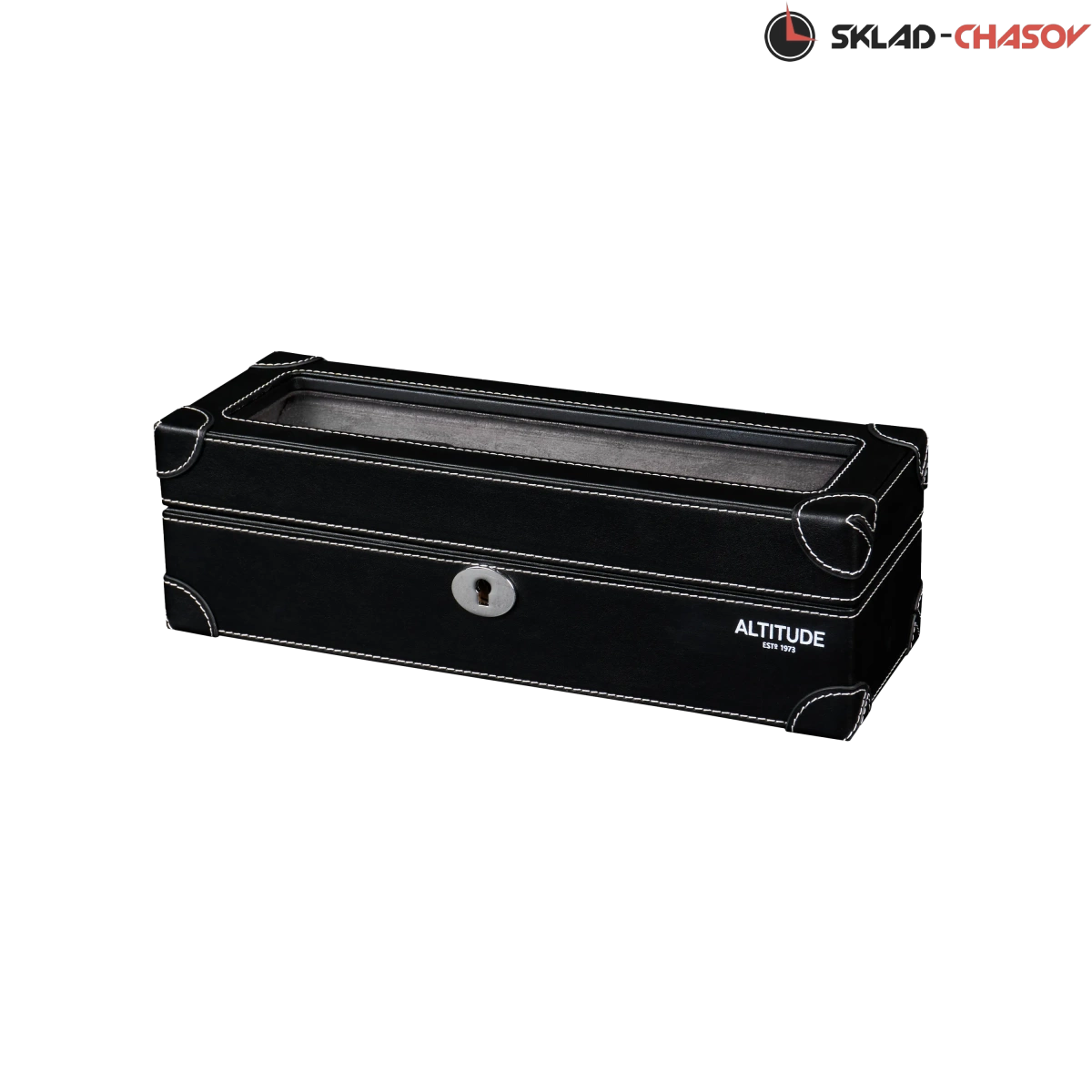 Шкатулка от компании Altitude создана для любителей кожаных изделий. Экстерьер выполнен из мягчайшей экологичной кожи черного цвета. В дополнении по всему корпусу присутствует ровная строчка белоснежного цвета. Приятный интерьер шкатулки из серого велюра будет радовать глаз и подарит тактильное наслаждение при установке 5-ти часов на подушки для хранения. Для сохранности ваших часов на торцевой части есть замок, который закрывается на металлический ключ.