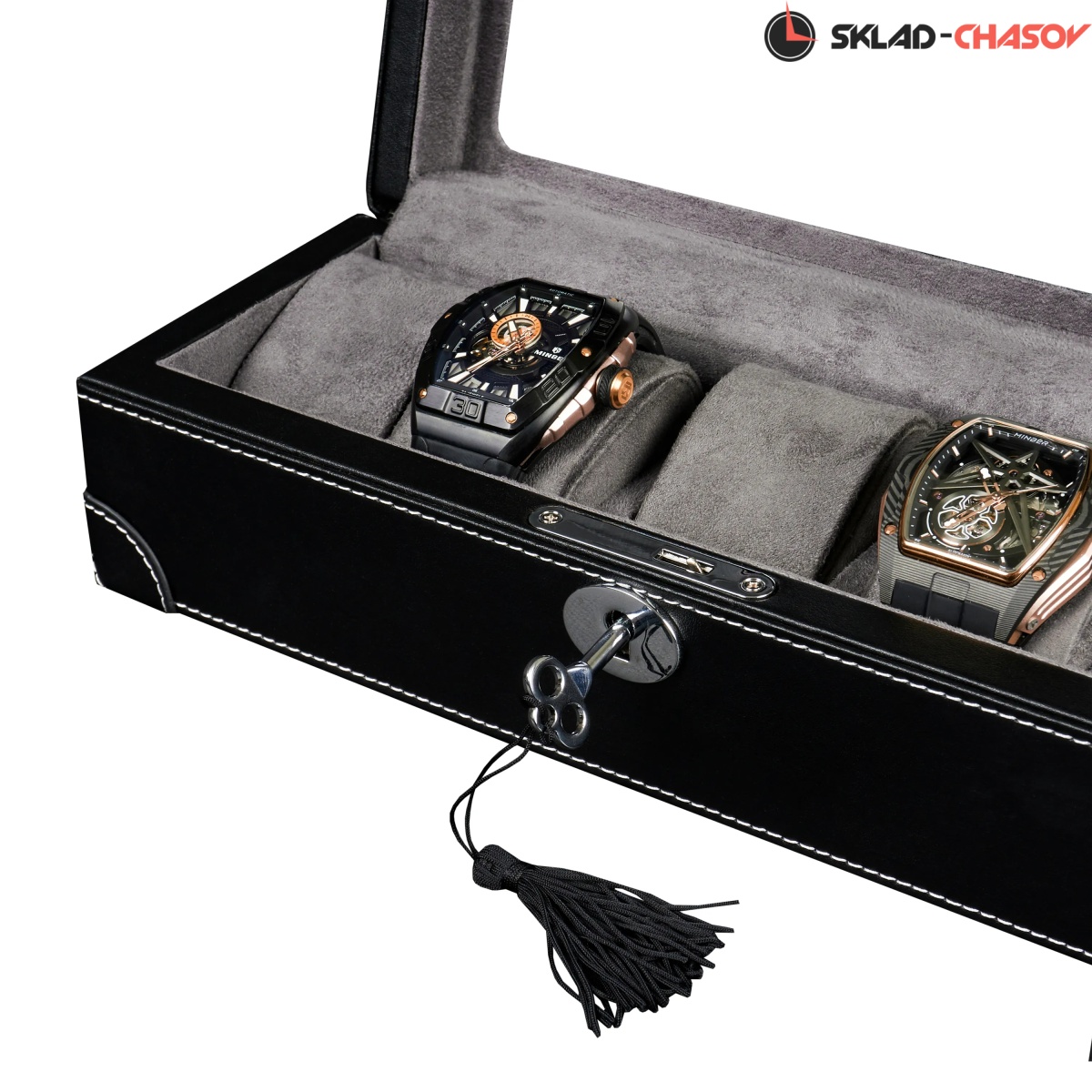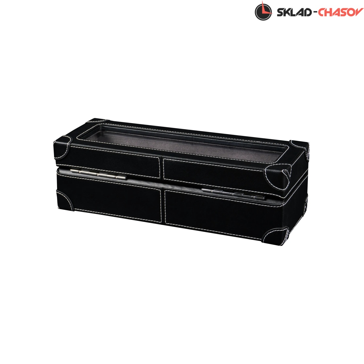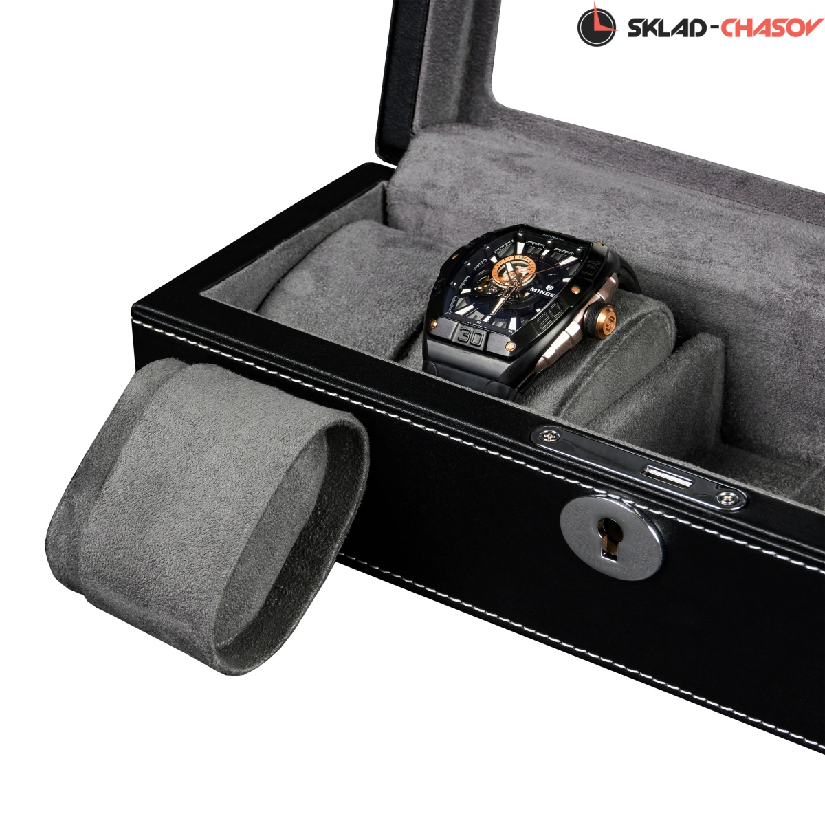 Шкатулка от компании Altitude создана для любителей кожаных изделий. Экстерьер выполнен из мягчайшей экологичной кожи черного цвета. В дополнении по всему корпусу присутствует ровная строчка белоснежного цвета. Приятный интерьер шкатулки из серого велюра будет радовать глаз и подарит тактильное наслаждение при установке 5-ти часов на подушки для хранения. Для сохранности ваших часов на торцевой части есть замок, который закрывается на металлический ключ.