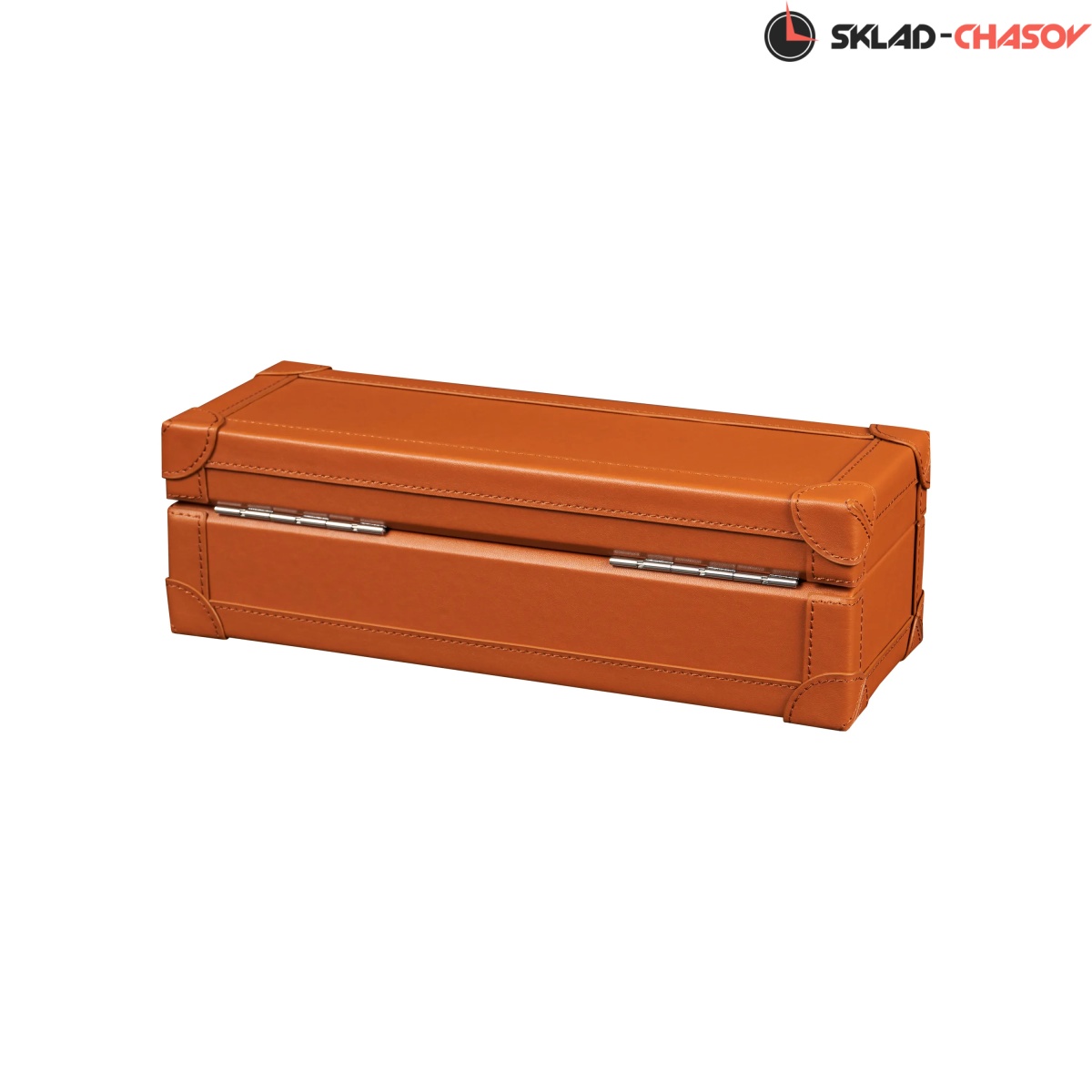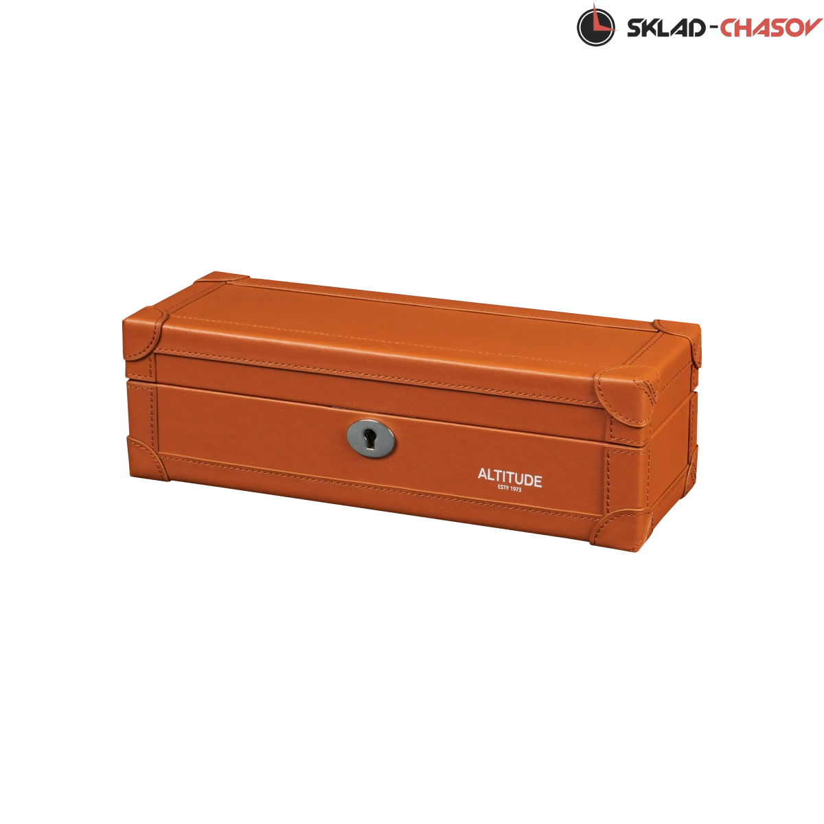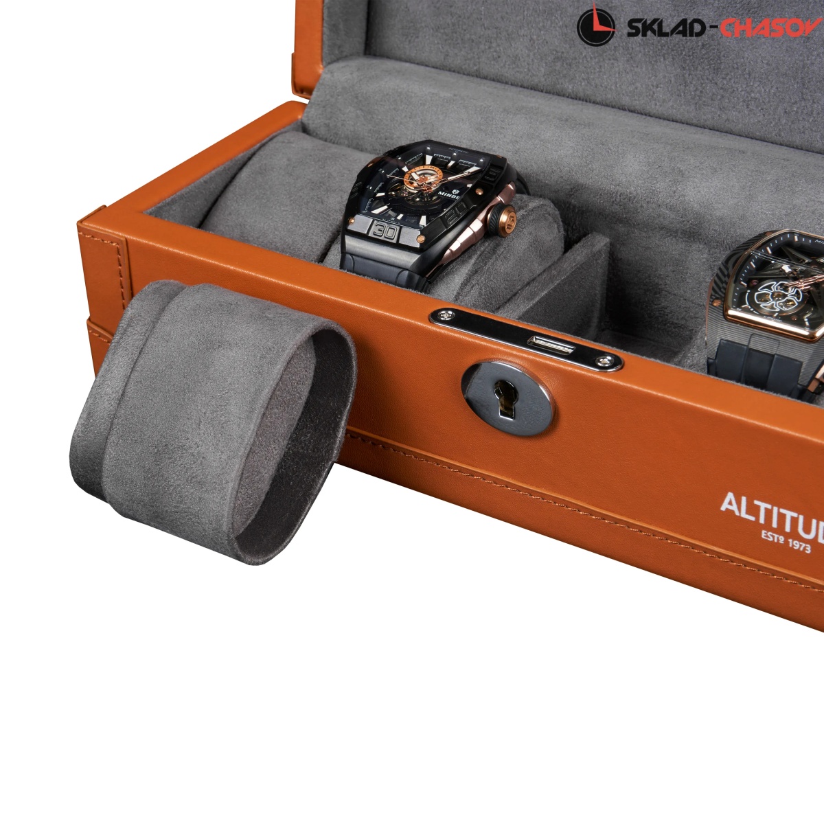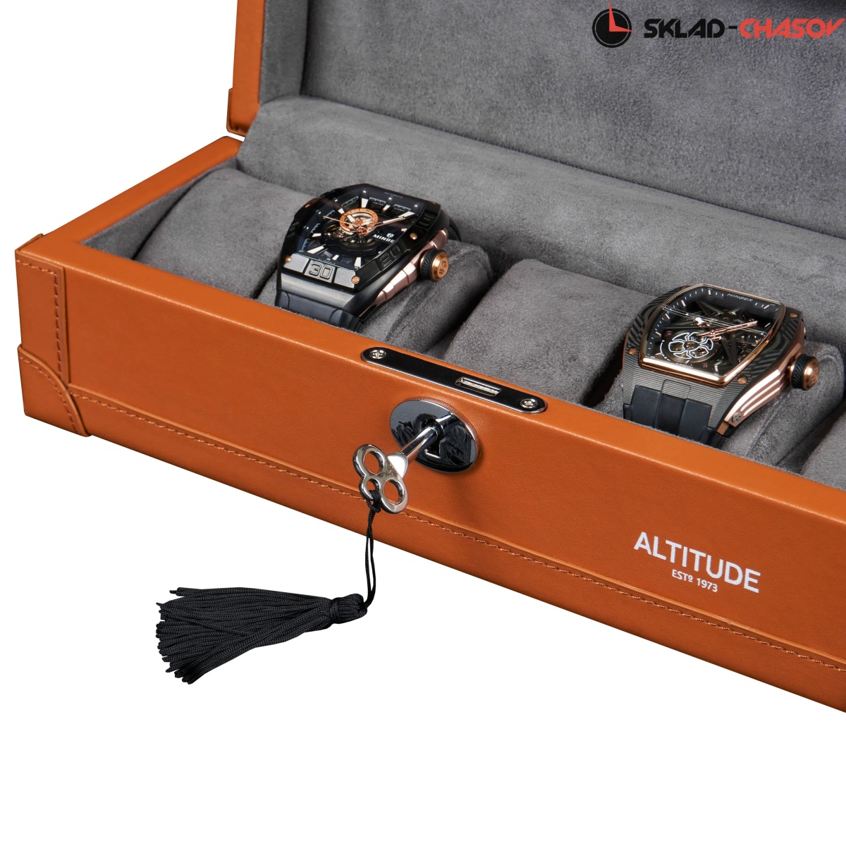 Шкатулка от компании Altitude создана для любителей кожаных изделий. Экстерьер выполнен из мягчайшей экологичной кожи коричнево-рыжего цвета. В дополнении по всему корпусу присутствует ровная строчка аналогичного цвета. Приятный интерьер шкатулки из серого велюра будет радовать глаз и подарит тактильное наслаждение при установке 5-ти часов на подушки для хранения. Для сохранности ваших часов на торцевой части есть замок, который закрывается на металлический ключ.