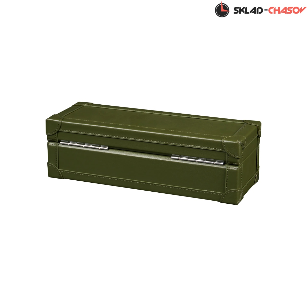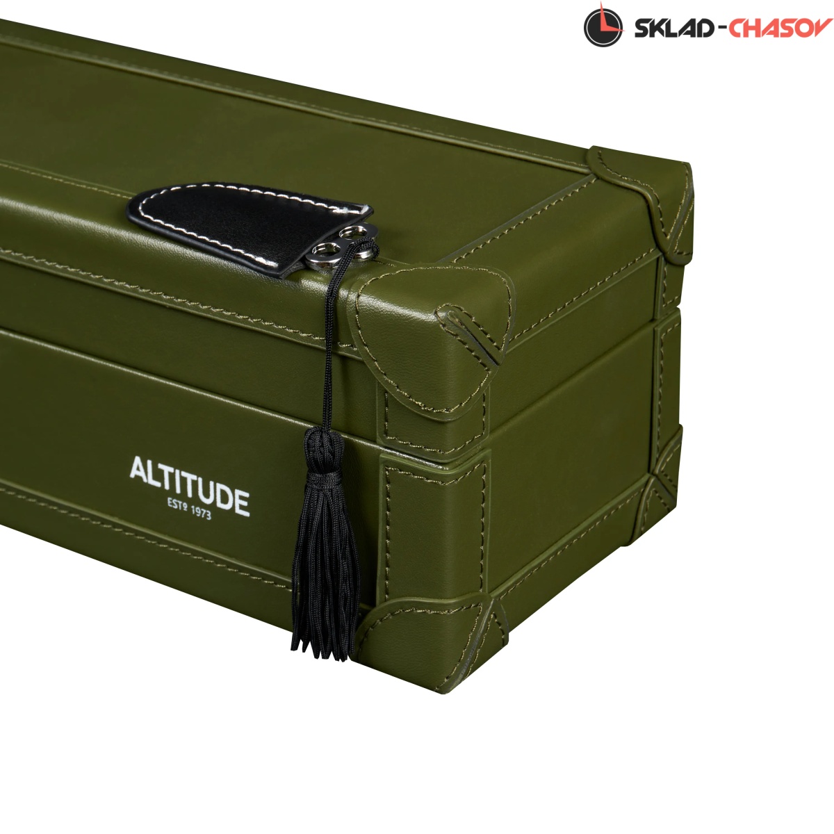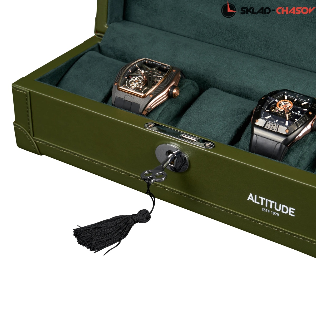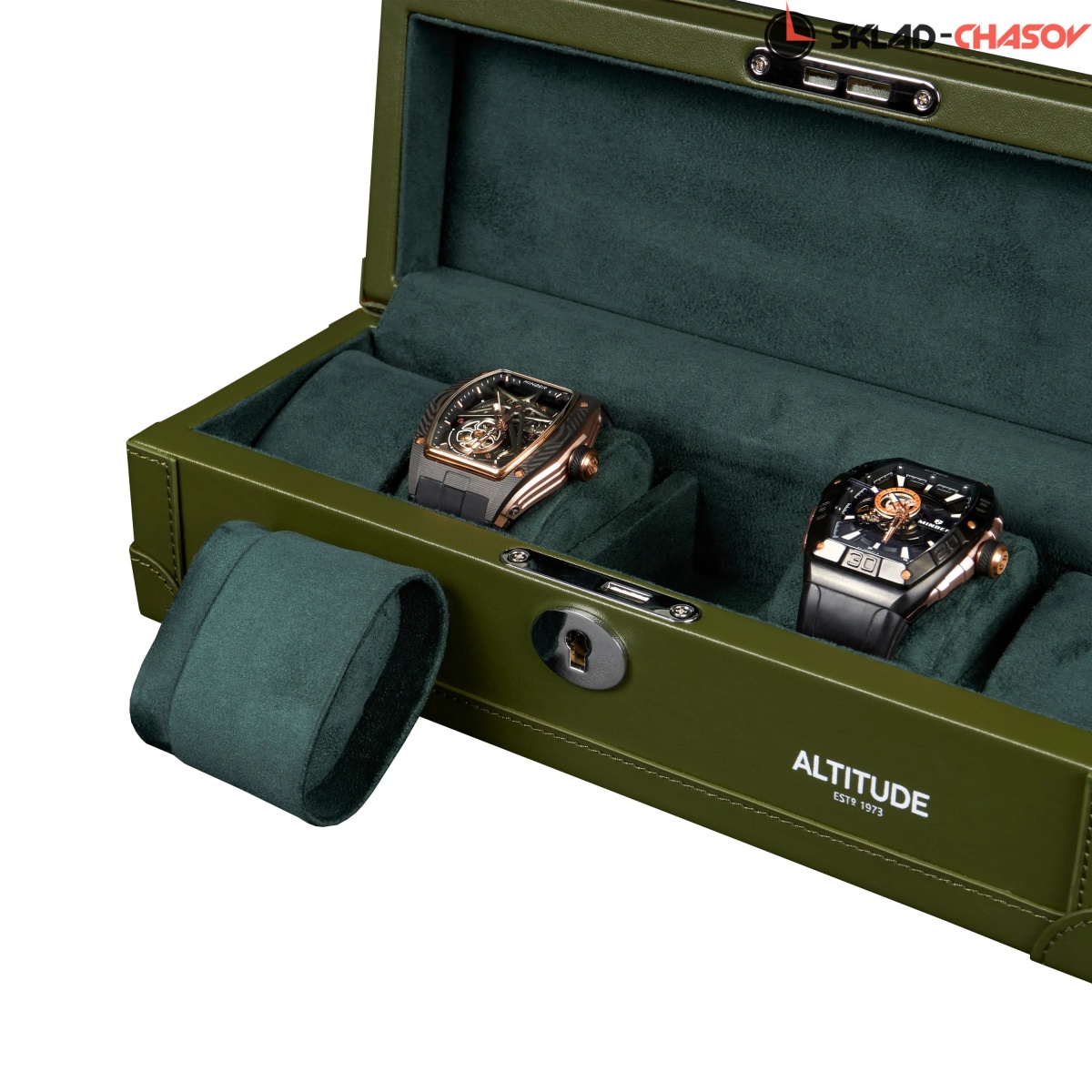 Шкатулка от компании Altitude создана для любителей кожаных изделий. Экстерьер выполнен из мягчайшей экологичной кожи темно-зеленого цвета. В дополнении по всему корпусу присутствует ровная строчка аналогичного цвета. Приятный интерьер шкатулки из серого велюра будет радовать глаз и подарит тактильное наслаждение при установке 5-ти часов на подушки для хранения. Для сохранности ваших часов на торцевой части есть замок, который закрывается на металлический ключ.