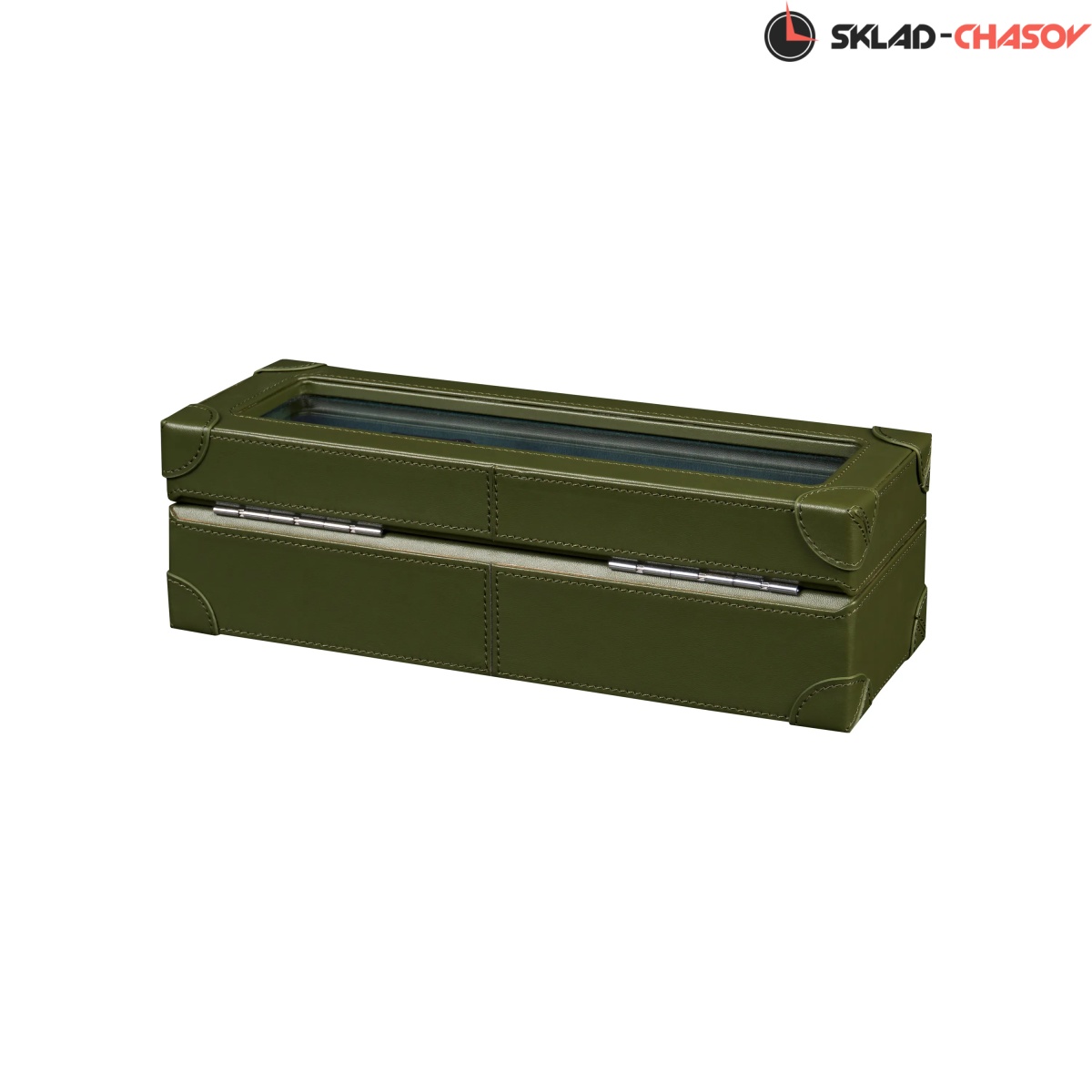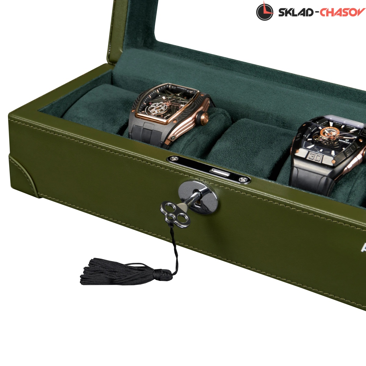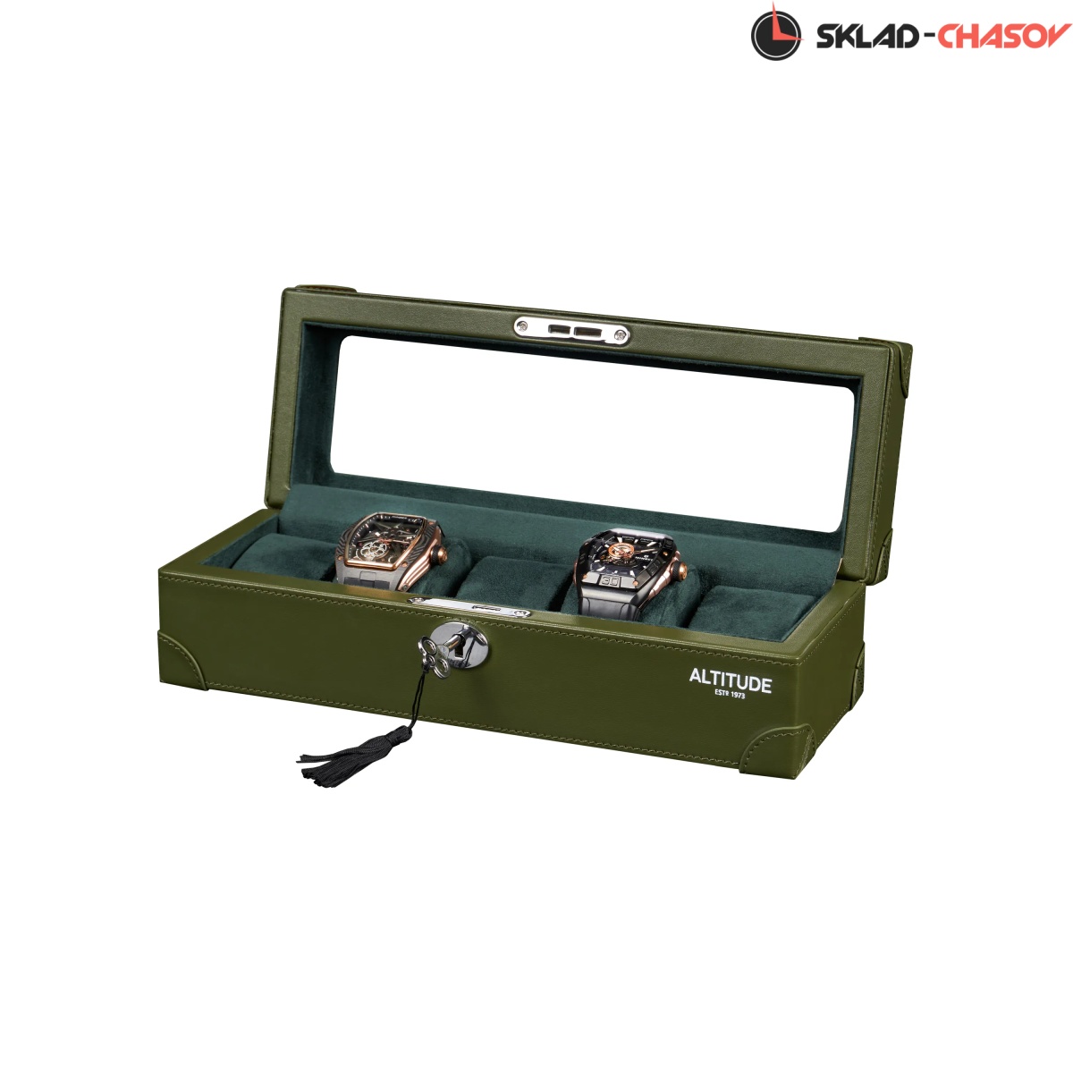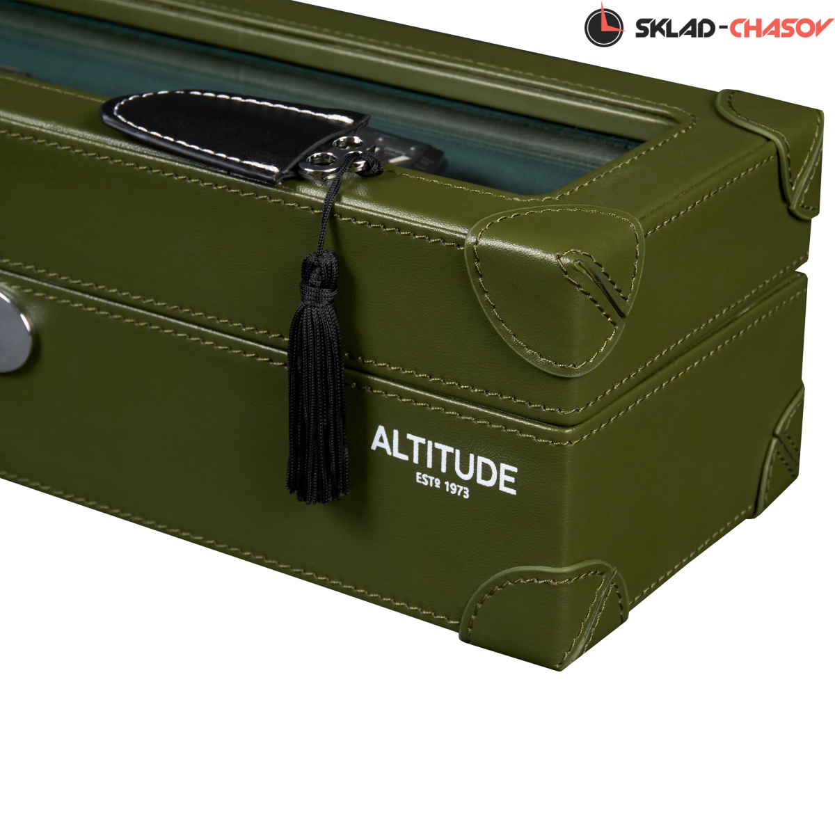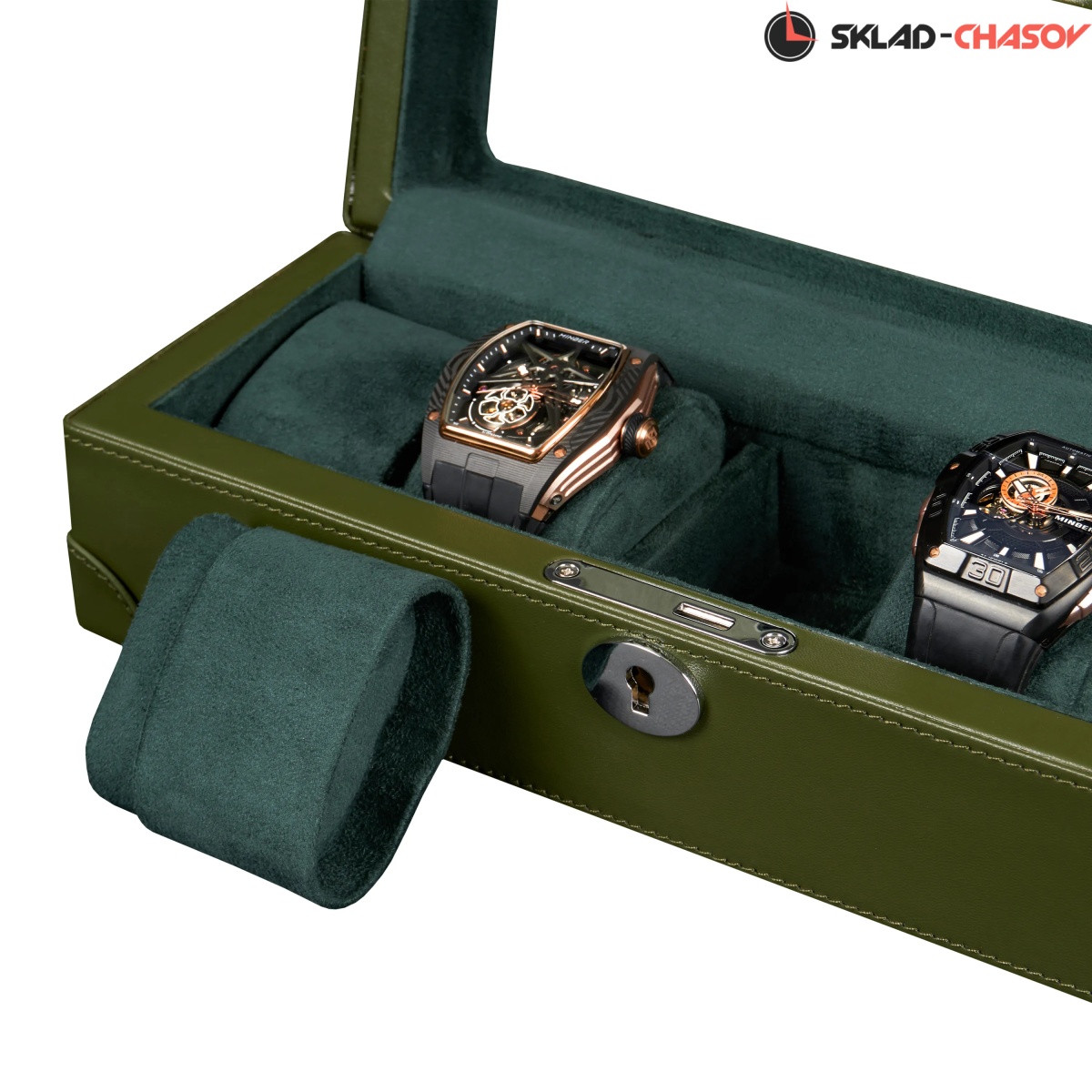 Шкатулка от компании Altitude создана для любителей кожаных изделий. Экстерьер выполнен из мягчайшей экологичной кожи темно-зеленого цвета. В дополнении по всему корпусу присутствует ровная строчка аналогичного цвета. Приятный интерьер шкатулки из серого велюра будет радовать глаз и подарит тактильное наслаждение при установке 5-ти часов на подушки для хранения. Для сохранности ваших часов на торцевой части есть замок, который закрывается на металлический ключ.