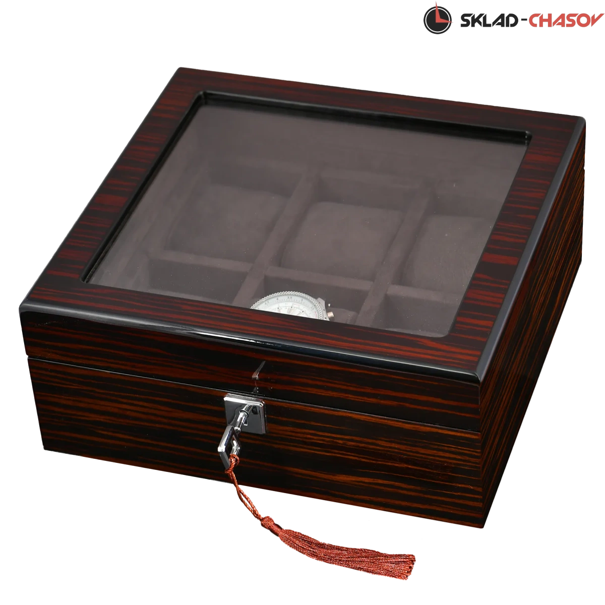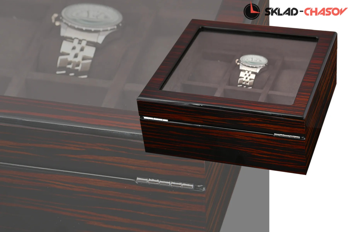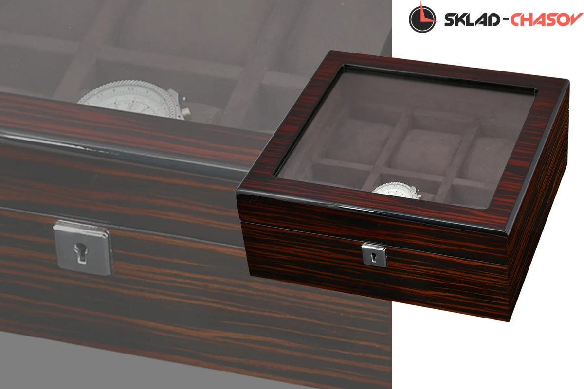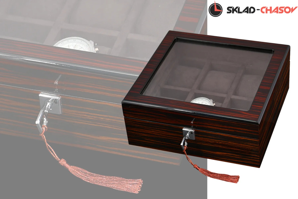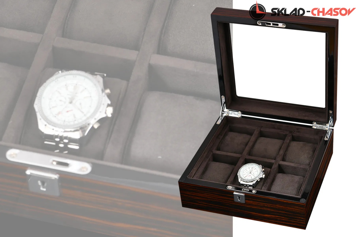 Шкатулка для бережного хранения 6 часов из серии "BoxTradition" от известного бренда Altitude. Корпус шкатулки выполнен из благородного дерева "венге", внутри отделка из высококачественной микрофибры в цвет корпуса. Стеклянная дверца снаружи, закрываемая на ключик. Универсальные подушечки для часов.