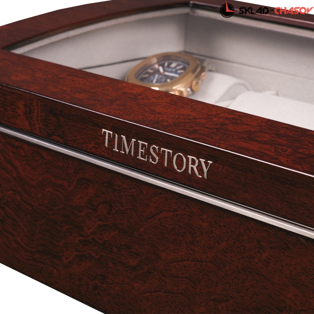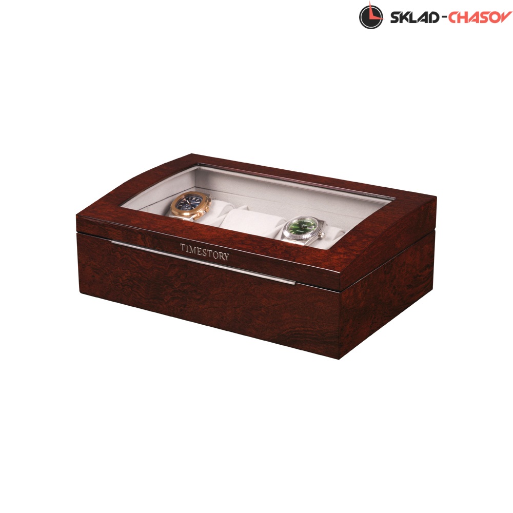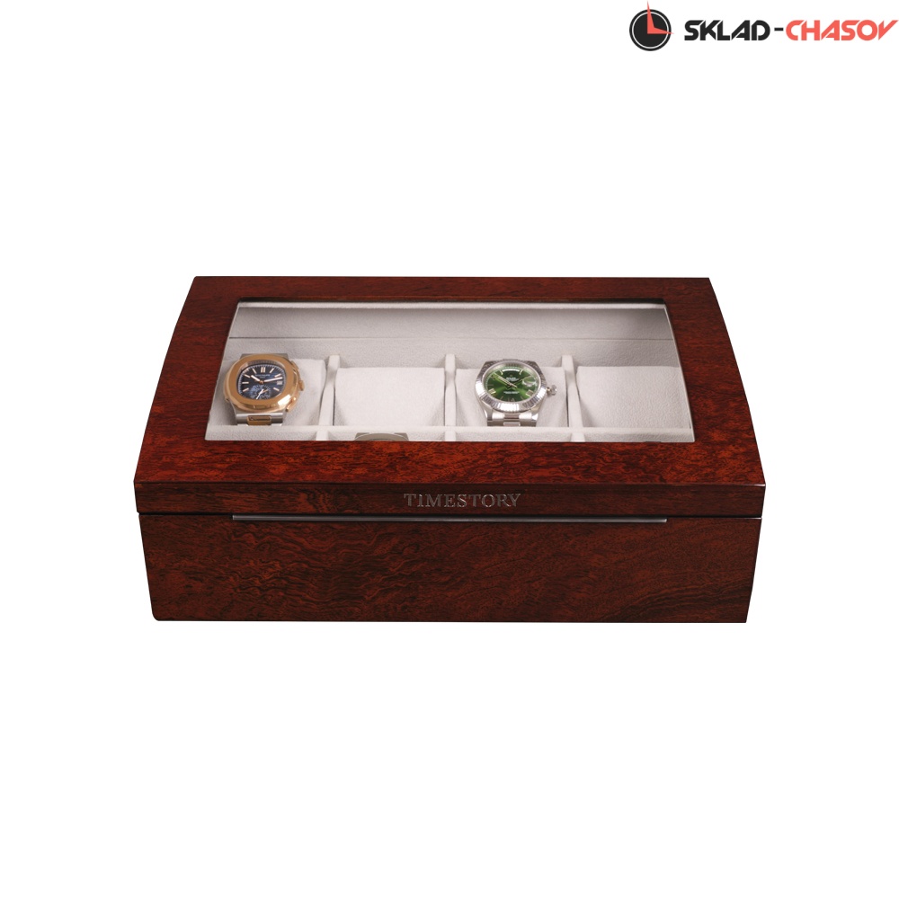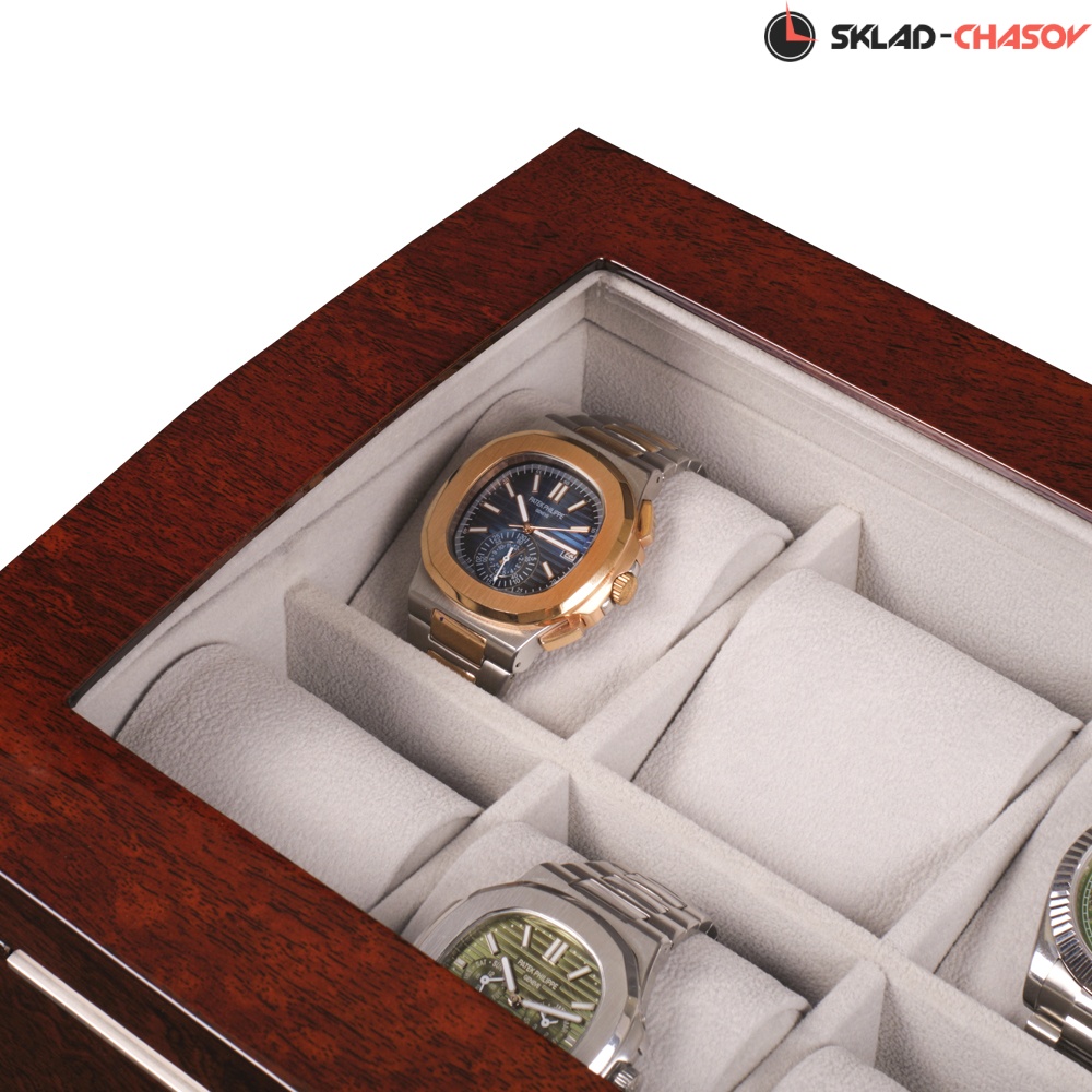 Открывая крышку шкатулки легким движением руки, можно любоваться коллекцией из 8-ми часов. Неповторимое исполнение экстерьера в дереве Умнина и покрытие множественными слоями высококачественного глянцевого лака придает изящность. Элегантность в интерьере дополняет приятный бархат светлого оттенка. Эргономичные подушки позволят с максимальным комфортом и удобством застегнуть на них часы любых размеров.