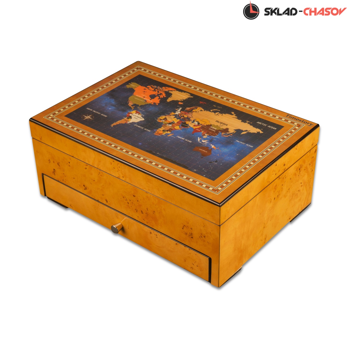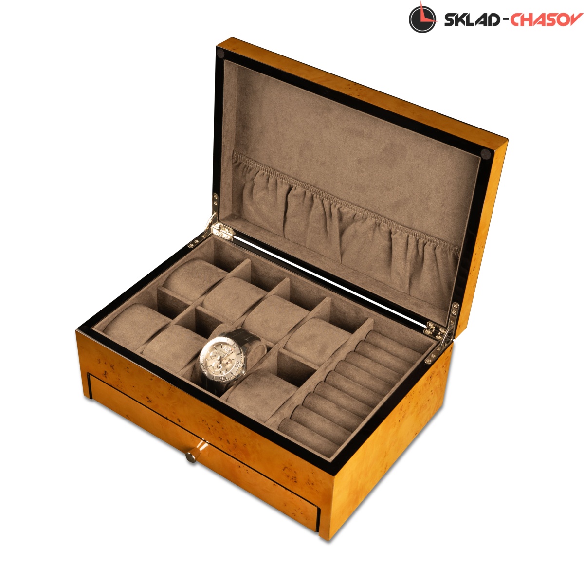 Исполнение шкатулки в цвете карельской березы придает ей элегантность и неповторимость. При создании данной коллекции было предусмотрено хранение для любых ваших аксессуаров. Все отделения выполнены из самого приятного на ощупь материала, а именно из бархата благородного светло-коричневого цвета.