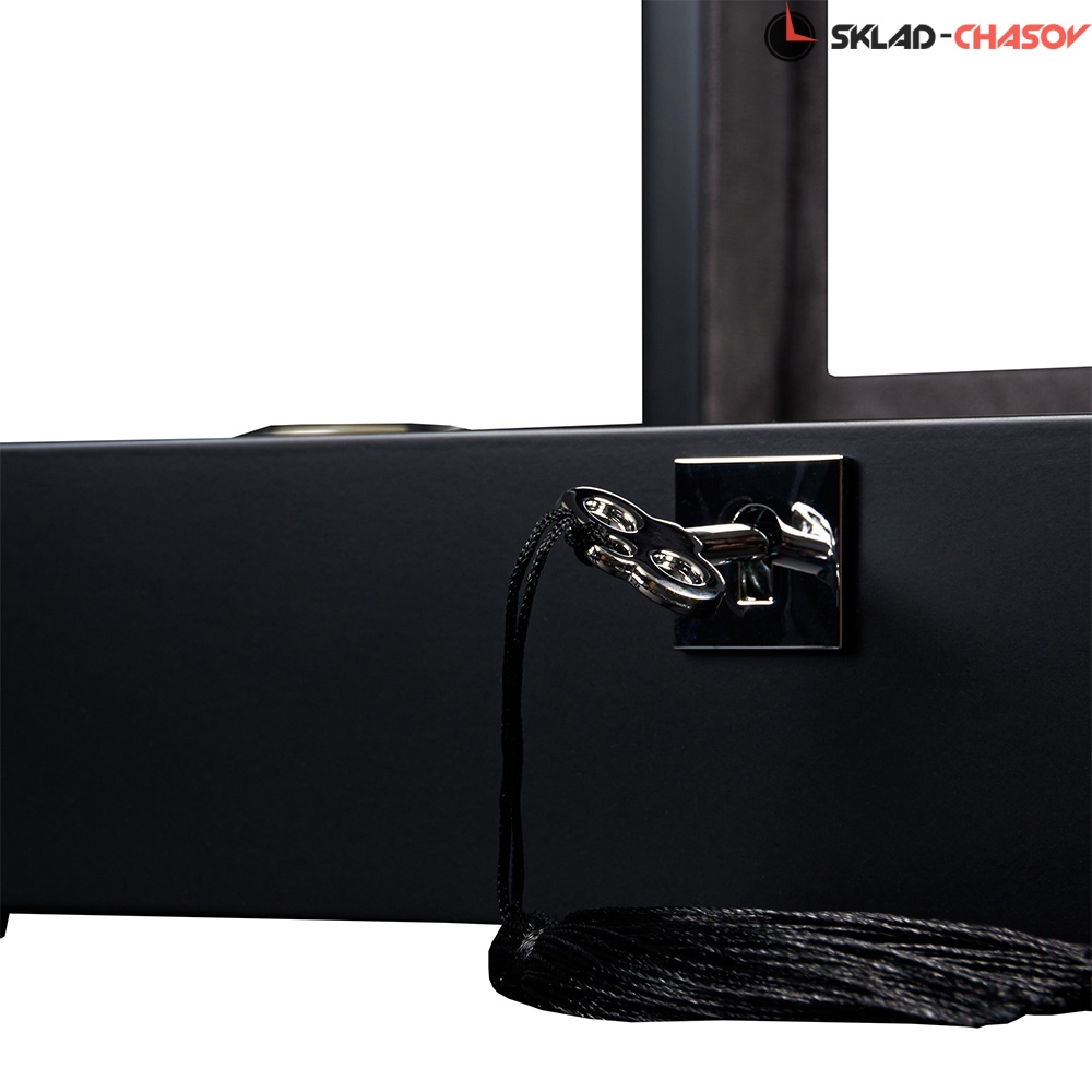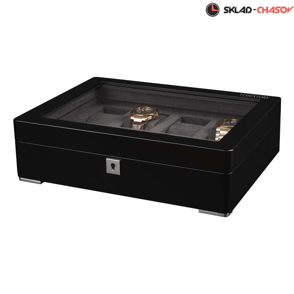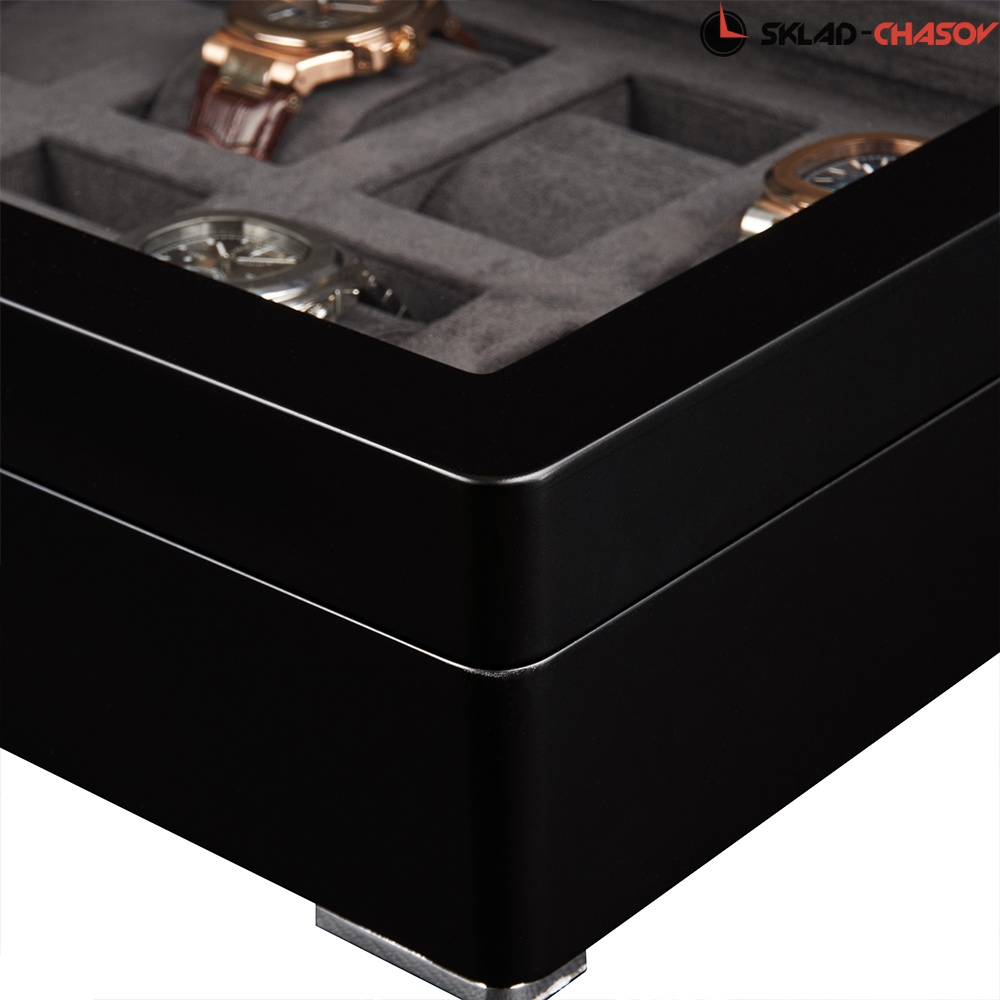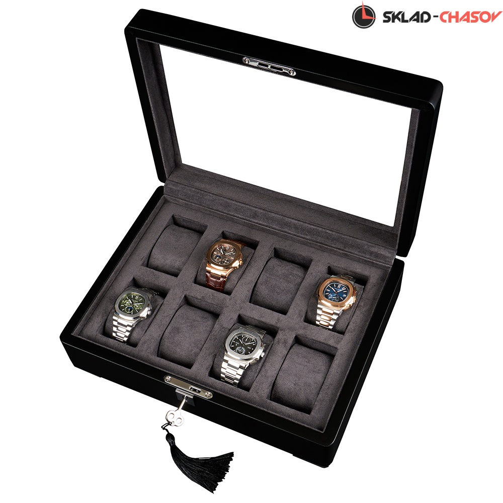 Открывая крышку шкатулки легким движением руки, можно любоваться коллекцией из 8-ми часов. Неповторимое исполнение экстерьера в темном дереве, покрытом матовым лаком черного цвета, придает изящность. Демонстрируя свои часы через крышку, нужно не забывать про их сохранность. Обеспечить ее позволяет небольшой квадратный замочек на торцевой части, закрывающийся на ключ.