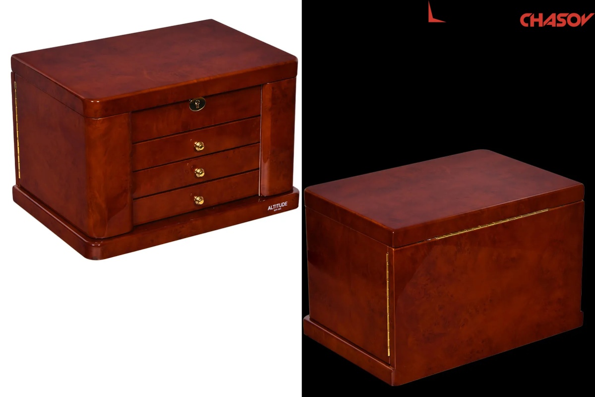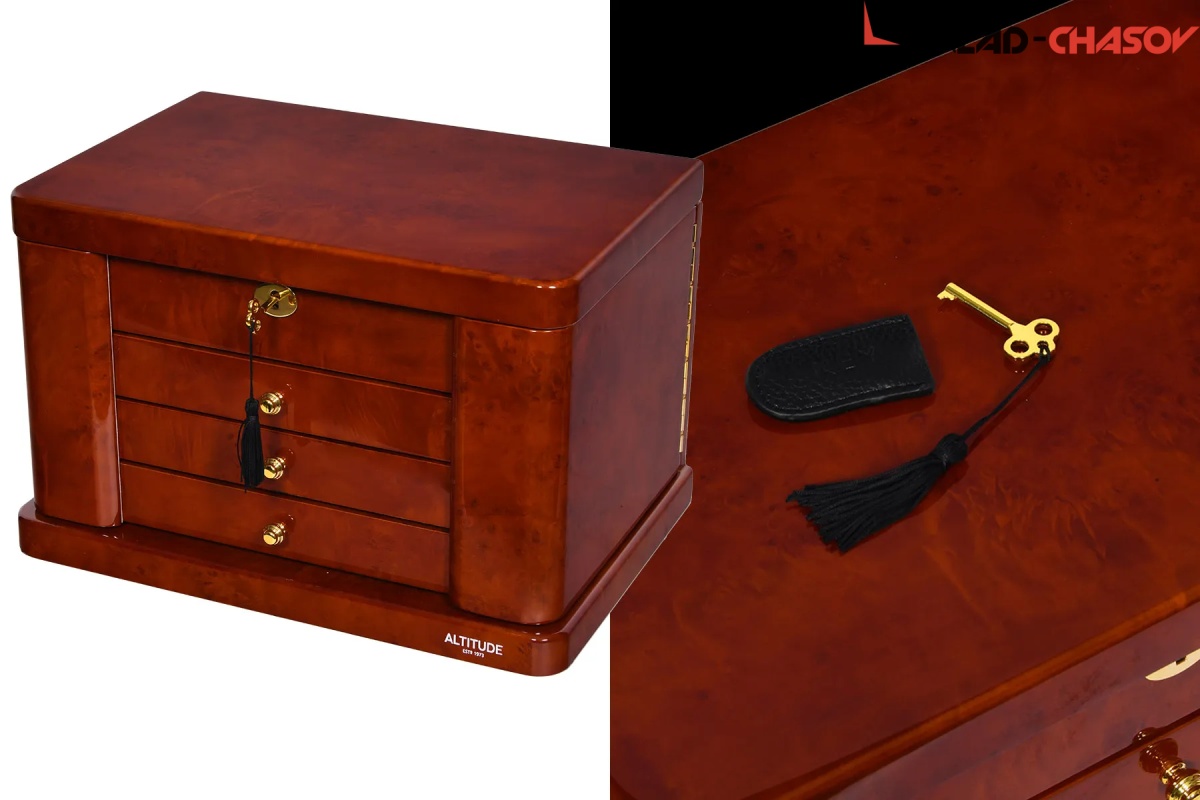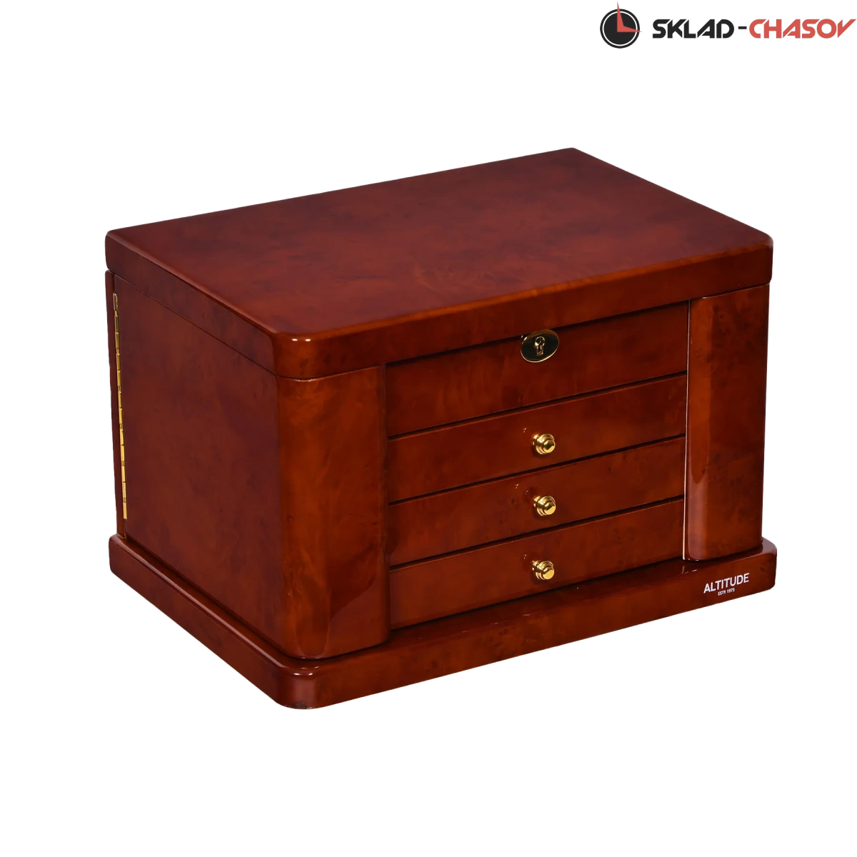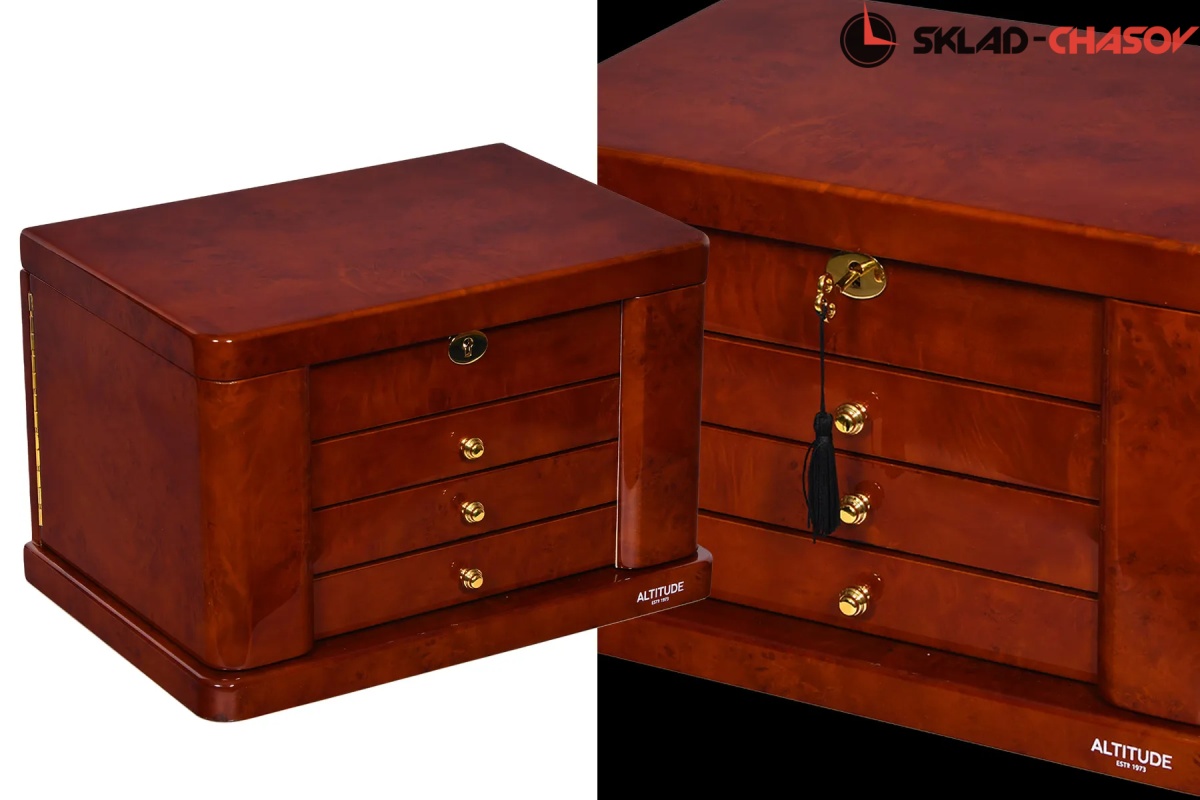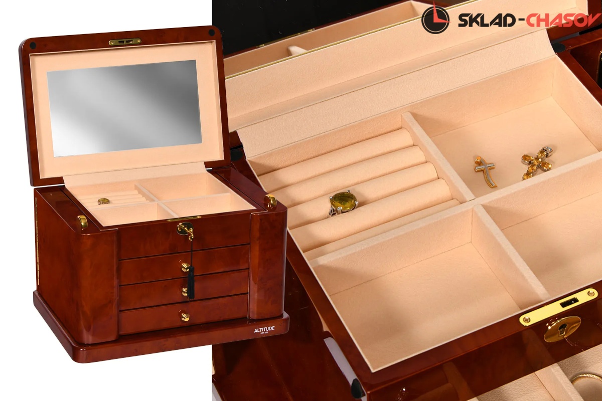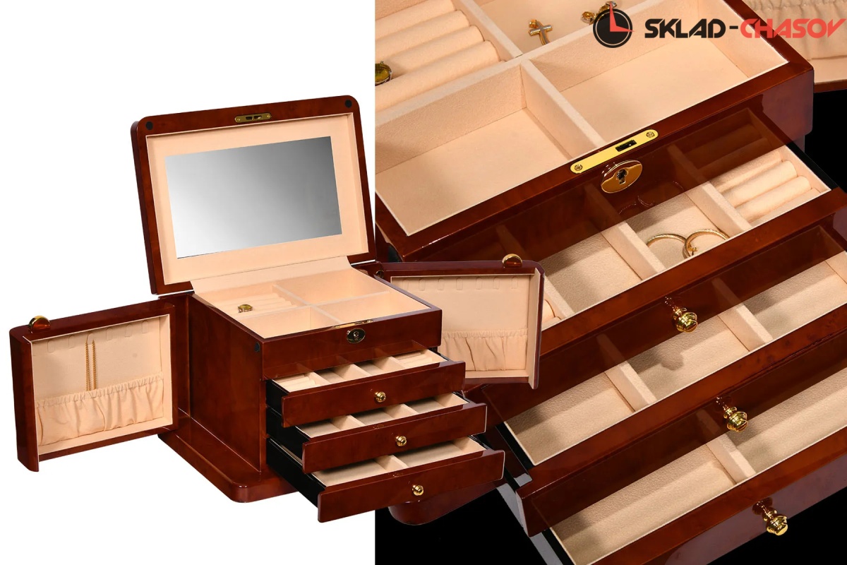 Модель «Liberty». Новая, большая, полноценно удобная шкатулочка для украшений выполнена в коричневом лакированном дереве «канадский клён», внутри выстлано светлой тканью (можно чистить щеточкой), множество отделений для разных украшений, на крышечке есть зеркальце, закрывается на ключик (хранение в кожаном чехольчике).