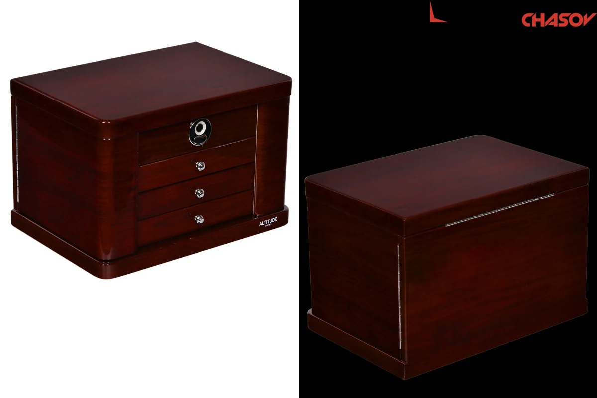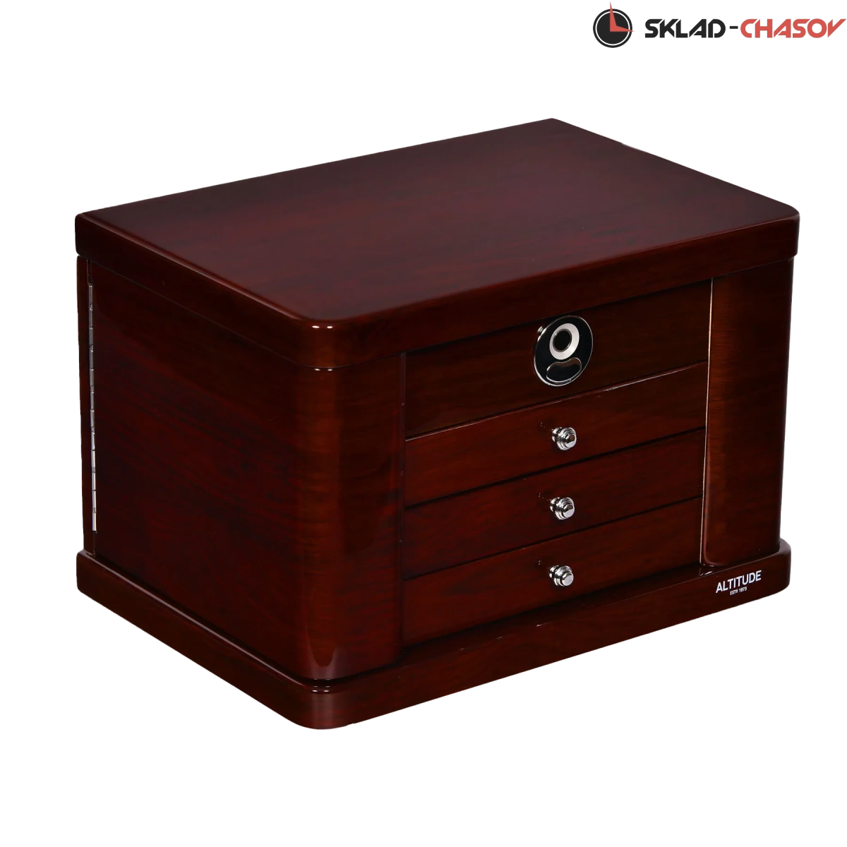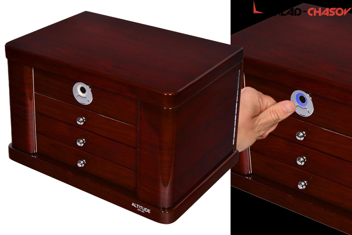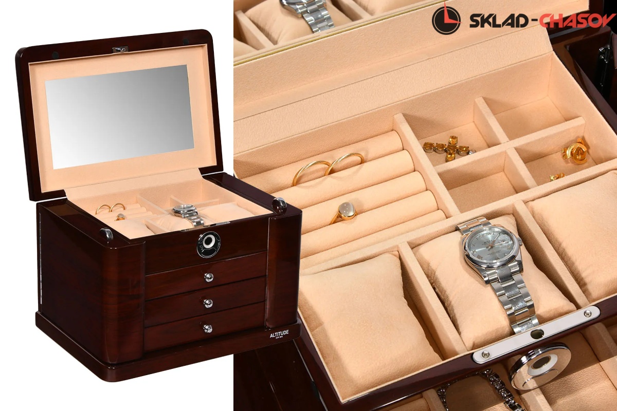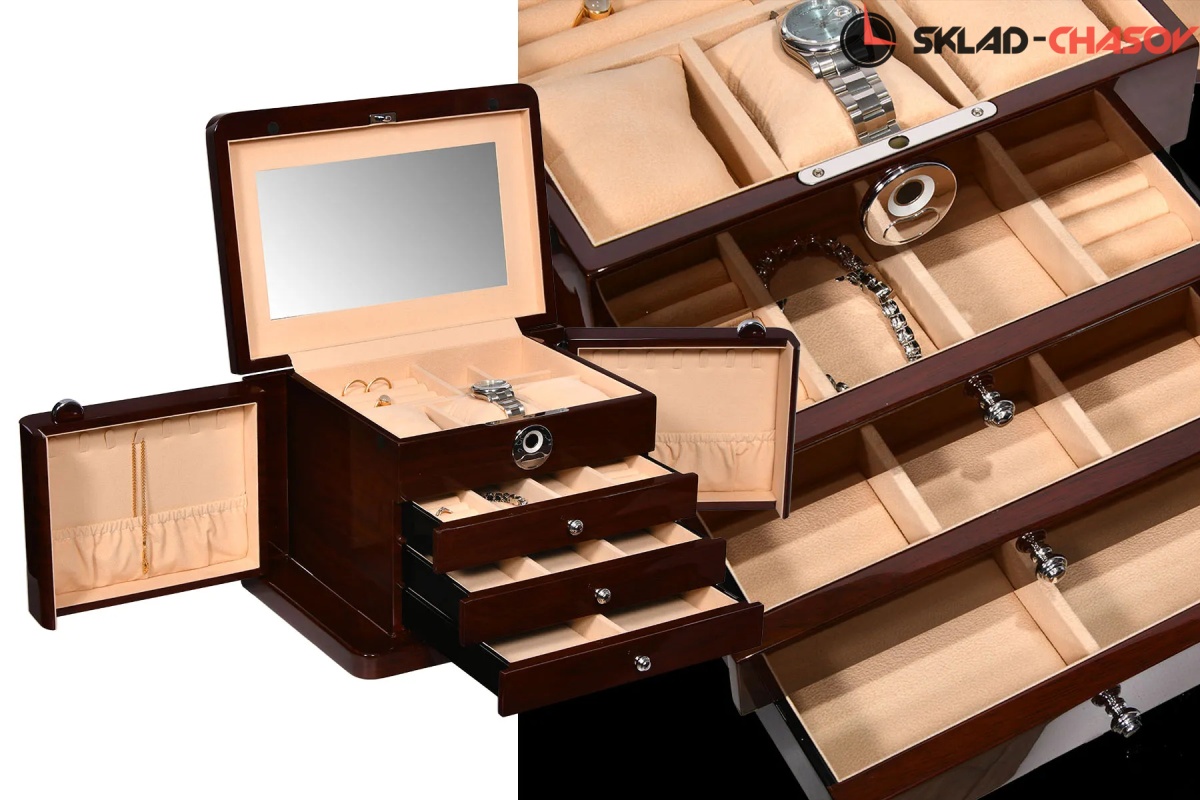 Модель «Liberty». Новая, большая, полноценно удобная шкатулочка для украшений выполнена в коричневом лакированном дереве «тополь», внутри выстлано светлой тканью (можно чистить щеточкой), множество отделений для разных украшений, на крышечке есть зеркальце, открывается с помощью современной технологии «отпечаток пальца».