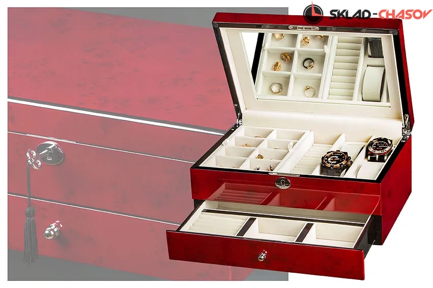 Шкатулка закрывается на механический замок, расположенный на лицевой панели. В нижней части находится выдвижной ящик с хромированной ручкой, который расширяет вместимость изделия.