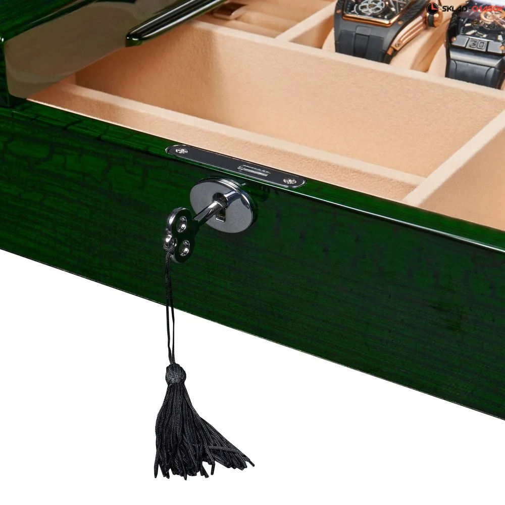 Корпус выполнен в модном зелёном лакированном дереве дуб, что придаёт изделию экстравагантный и природный характер. Верхняя панель оснащена зеркалом, что делает шкатулку не только практичным хранилищем, но и удобным аксессуаром для повседневного использования.