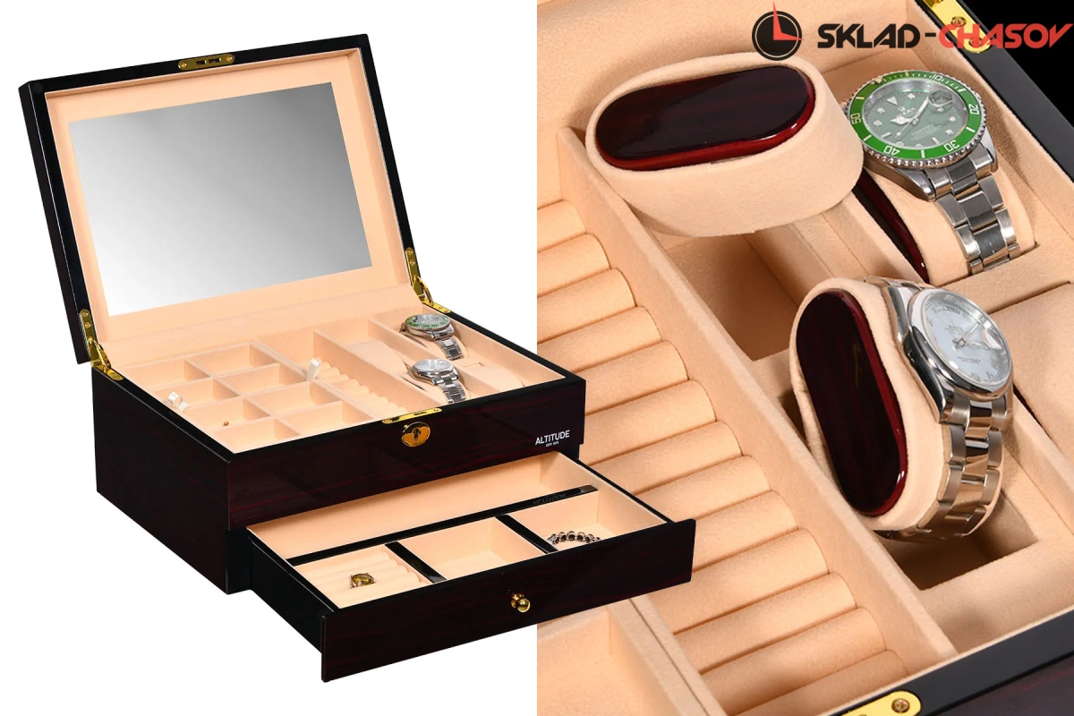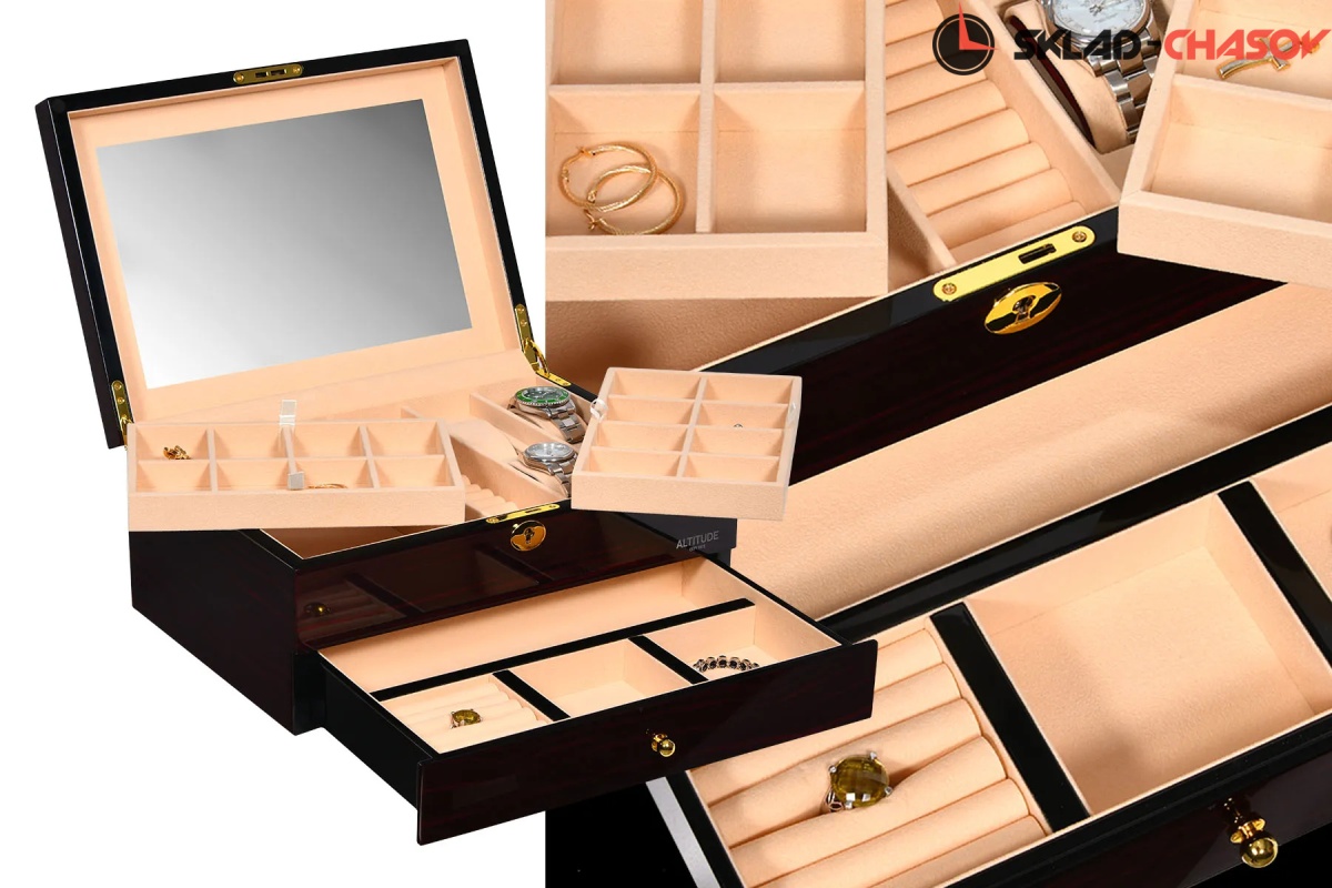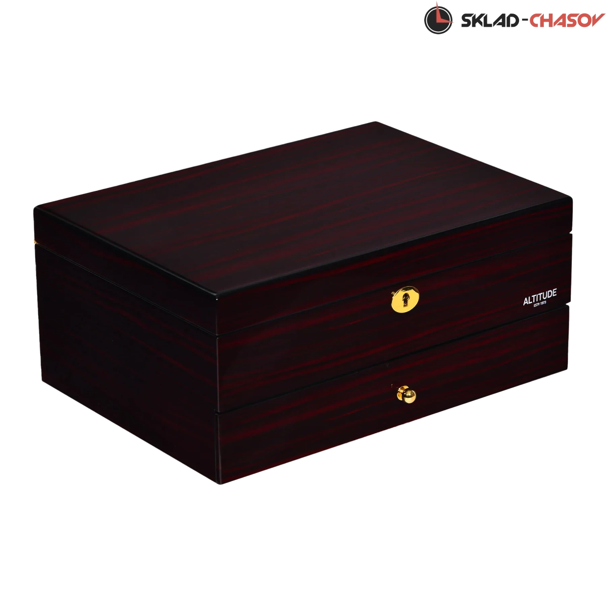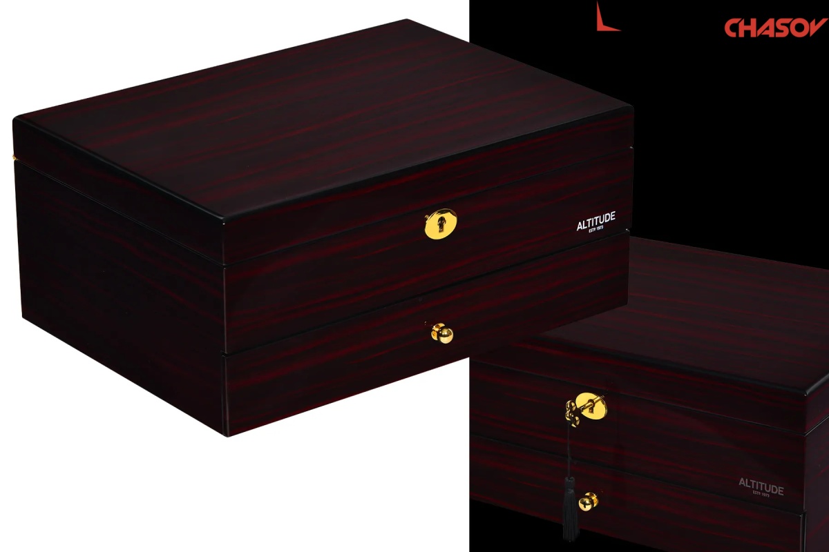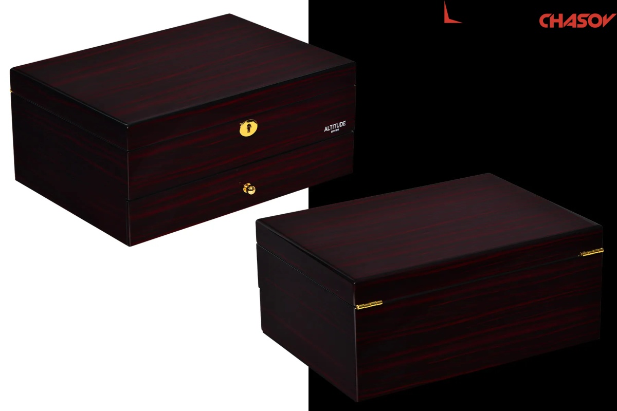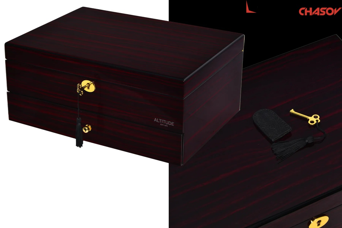 Шкатулка сделана из качественного дерева венге и имеет несколько слоев лака для защиты от повреждений. Внутри шкатулки имеется множество отделений для различных вещей, таких как часы, украшения и документы. Шкатулка позволяет хранить до четырёх часов. Для открывания используется ключик.
