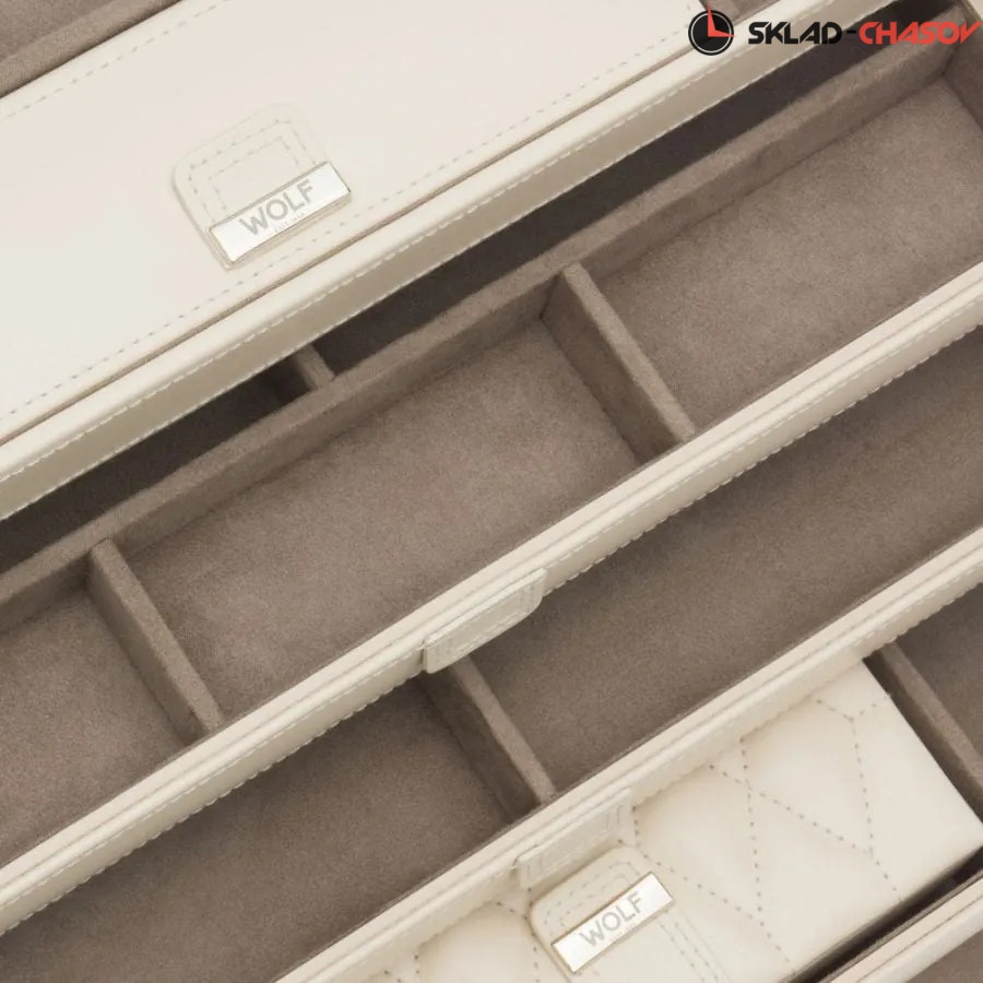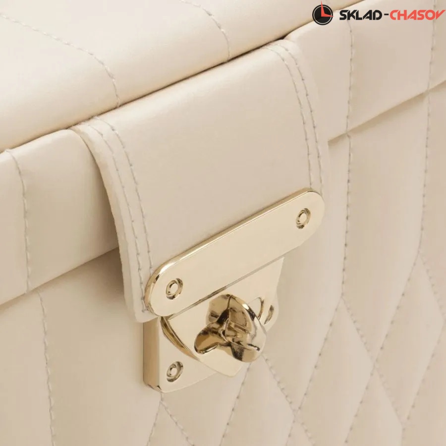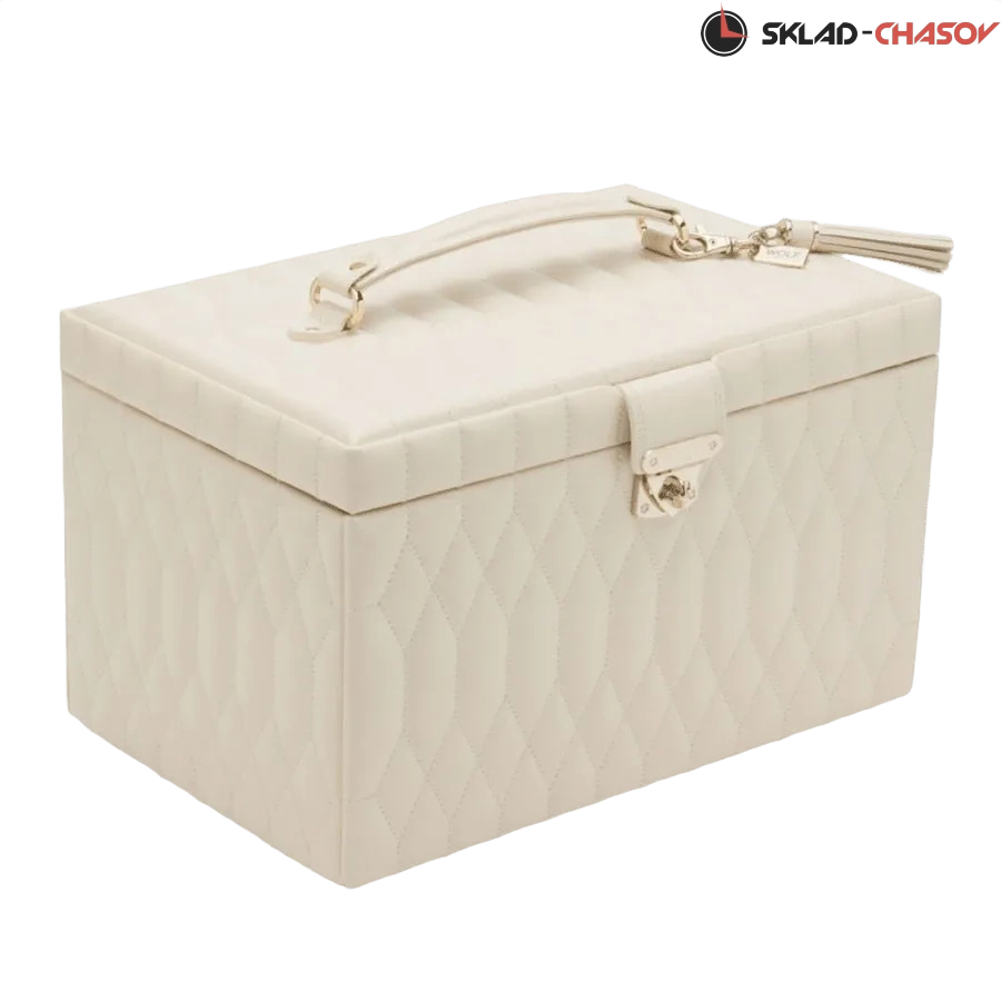 Неподвластная времени элегантность — коллекция Caroline от английского бренда Wolf воплощает гармонию классического дизайна и современного совершенства. Просторная ювелирная шкатулка создана для бережного хранения самых ценных украшений и фамильных реликвий. Экстерьер выполнен из мягкой кожи молочного цвета с фирменным ромбовидным стеганым узором, дополненной фурнитурой в золотистом тоне.