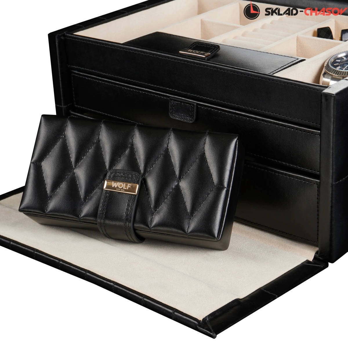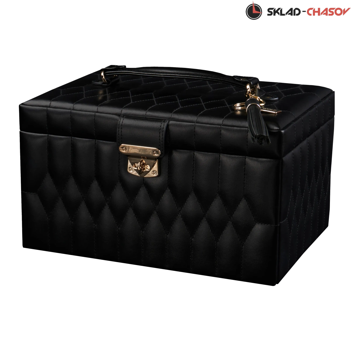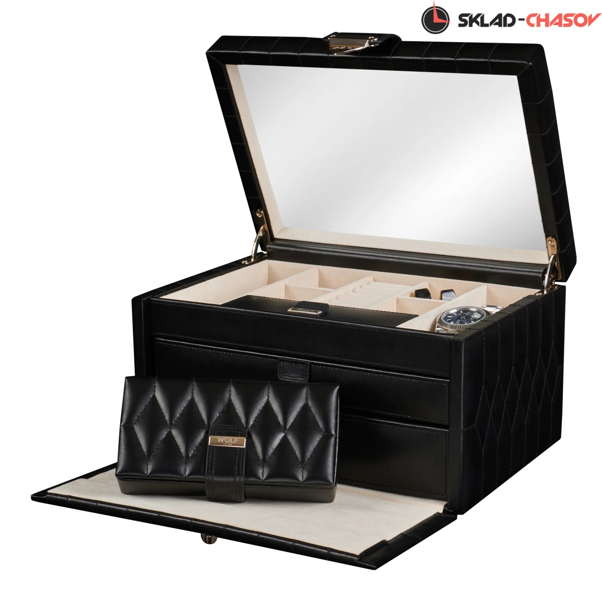 Неподвластная времени классика - коллекция Caroline от самого известного английского бренда Wolf поражает воображение своим классическим видом и используемыми материалами. Ювелирная шкатулка создана для хранения и перевозки ваших любимых украшений. Экстерьер выполнен из мягкой глянцевой кожи высшего сорта, плавно переходящий в классический интерьер с использованием бежевого велюра. Абсолютно каждый элемент фурнитуры выполнен в золотистом цвете. Элегантные линии 50-х годов прослеживаются во всём виде шкатулки. При открытой крышке можно подобрать необходимые украшения под ваш наряд благодаря внутреннему большому зеркалу. Для путешественниц внутри шкатулки лежит специальный тревел-бокс, который удобен свой внутренней эргономикой. Два выдвижных ящика подойдут для хранения различного типа украшений. Важно отметить, что вся продукция премиального бренда Wolf изготавливается вручную с использованием экологически чистых материалов.