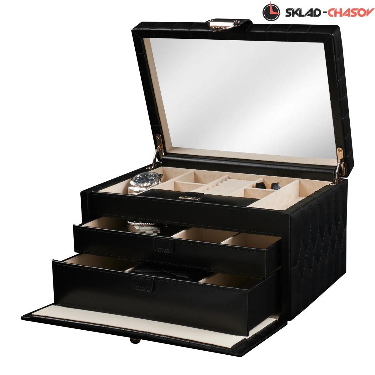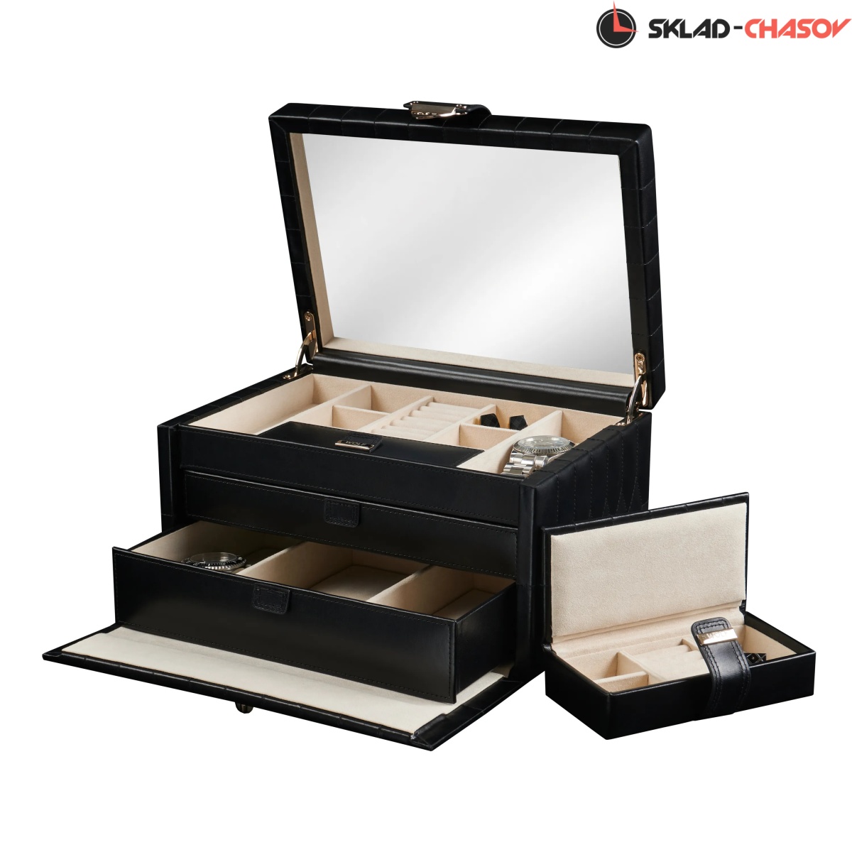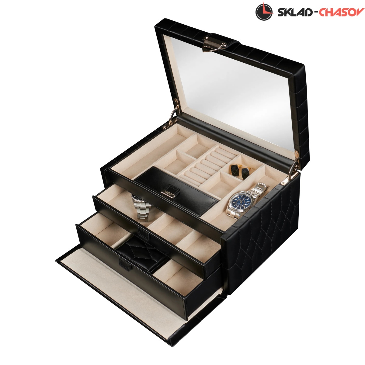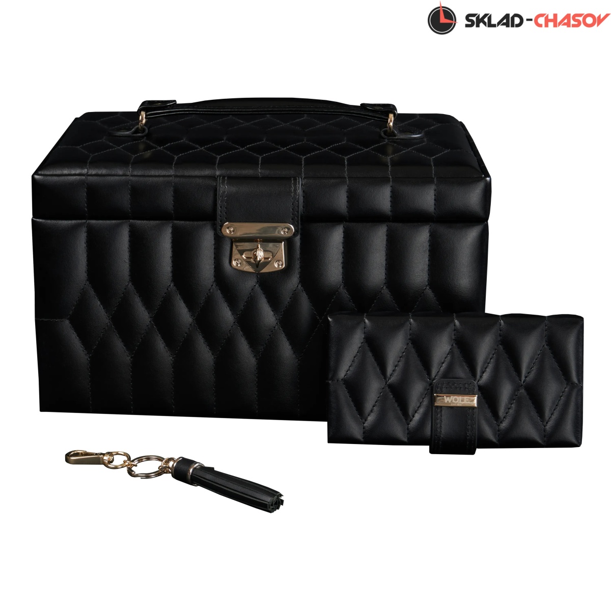 Неподвластная времени классика - коллекция Caroline от самого известного английского бренда Wolf поражает воображение своим классическим видом и используемыми материалами. Ювелирная шкатулка создана для хранения и перевозки ваших любимых украшений. Экстерьер выполнен из мягкой глянцевой кожи высшего сорта, плавно переходящий в классический интерьер с использованием бежевого велюра. Абсолютно каждый элемент фурнитуры выполнен в золотистом цвете. Элегантные линии 50-х годов прослеживаются во всём виде шкатулки. При открытой крышке можно подобрать необходимые украшения под ваш наряд благодаря внутреннему большому зеркалу. Для путешественниц внутри шкатулки лежит специальный тревел-бокс, который удобен свой внутренней эргономикой. Два выдвижных ящика подойдут для хранения различного типа украшений. Важно отметить, что вся продукция премиального бренда Wolf изготавливается вручную с использованием экологически чистых материалов.