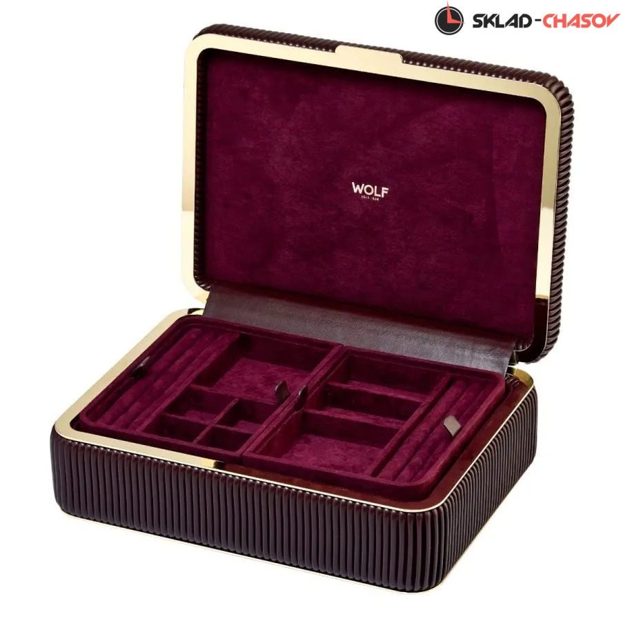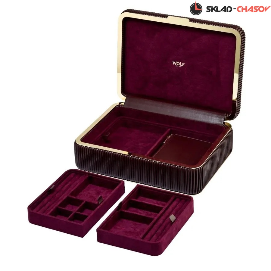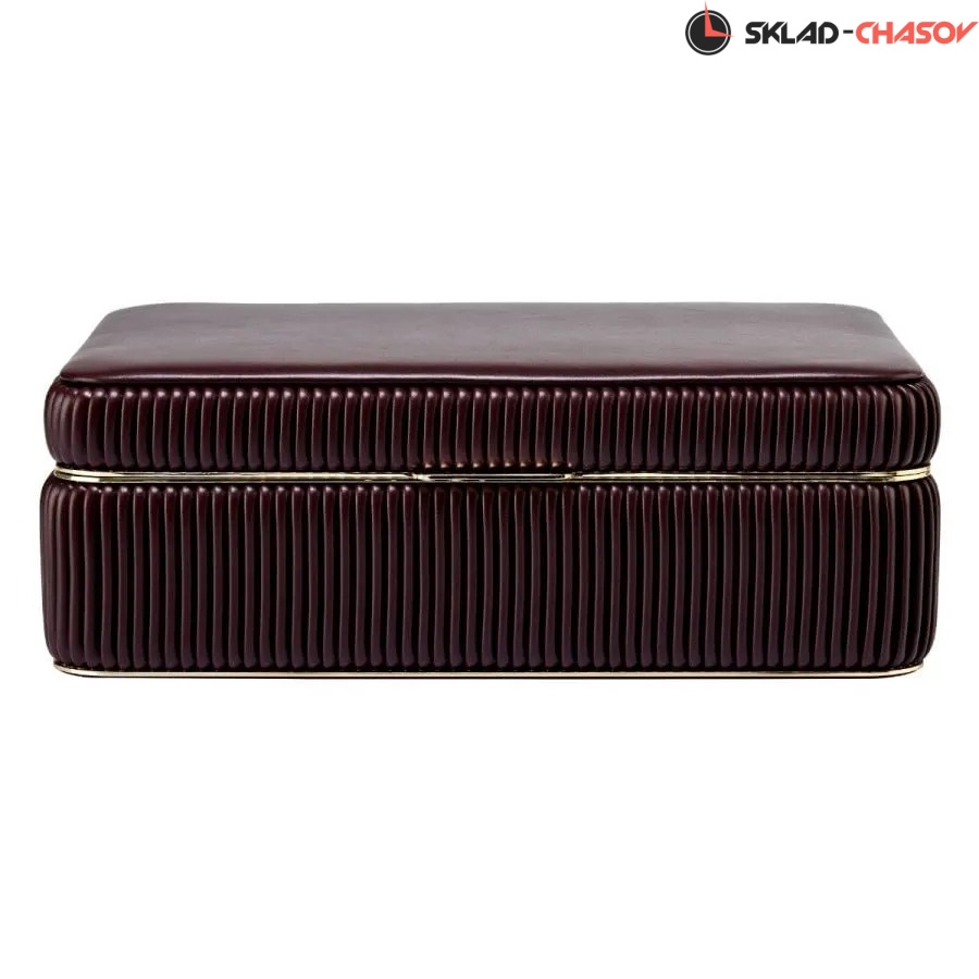 Элегантность и утончённость — ювелирная шкатулка Bella Medium от бренда Wolf поражает своим изысканным обликом. Лаконичная крышка из гладкой веганской кожи гармонично сочетается с изящными плиссированными боковыми сторонами глубокого цвета бордо, а золотистая рамка и фурнитура придают изделию особый блеск.