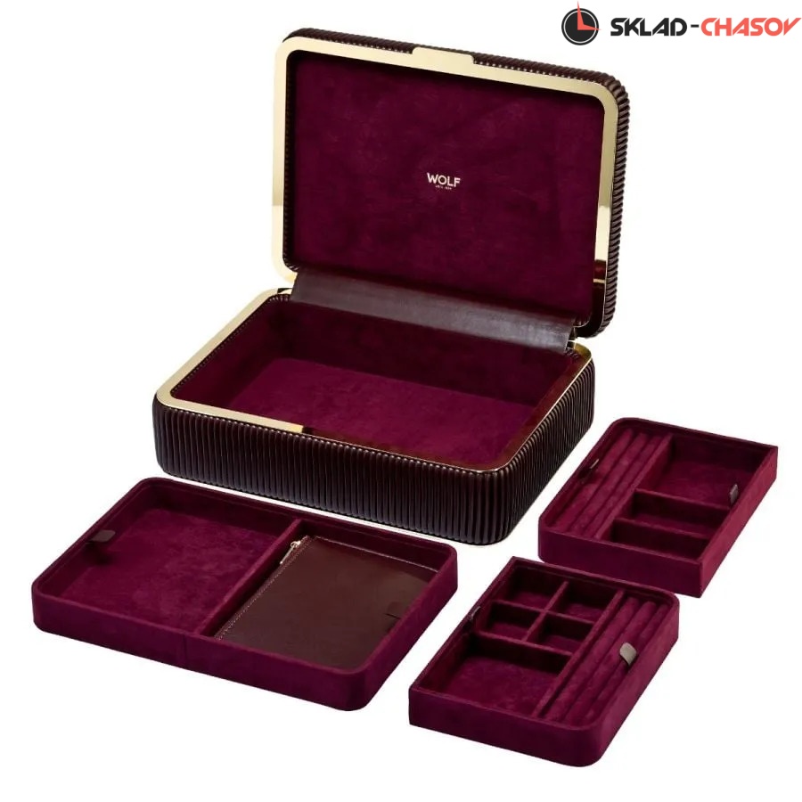 Внутри скрывается продуманная система хранения: три съёмных лотка, отделанных бархатом в тон экстерьера. Разработанная по технологии LusterLoc™ ткань предотвращает потемнение украшений и сохраняет их сияние на десятилетия. Первый лоток включает четыре небольших отделения и валик для колец, второй — пять отделений и валик, третий — два вместительных отсека, один из которых предназначен для удобного съёмного чехла на молнии с внутренним разделителем.