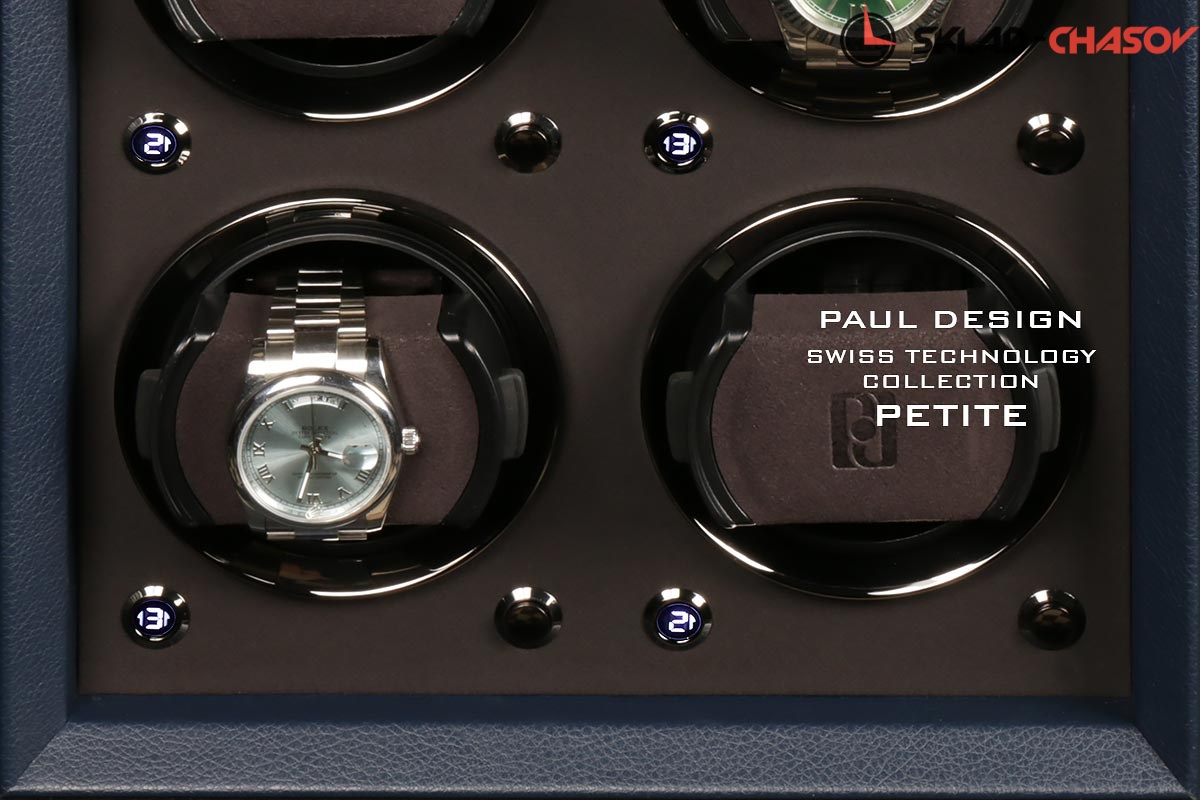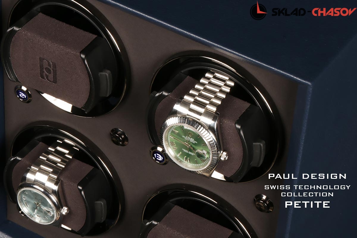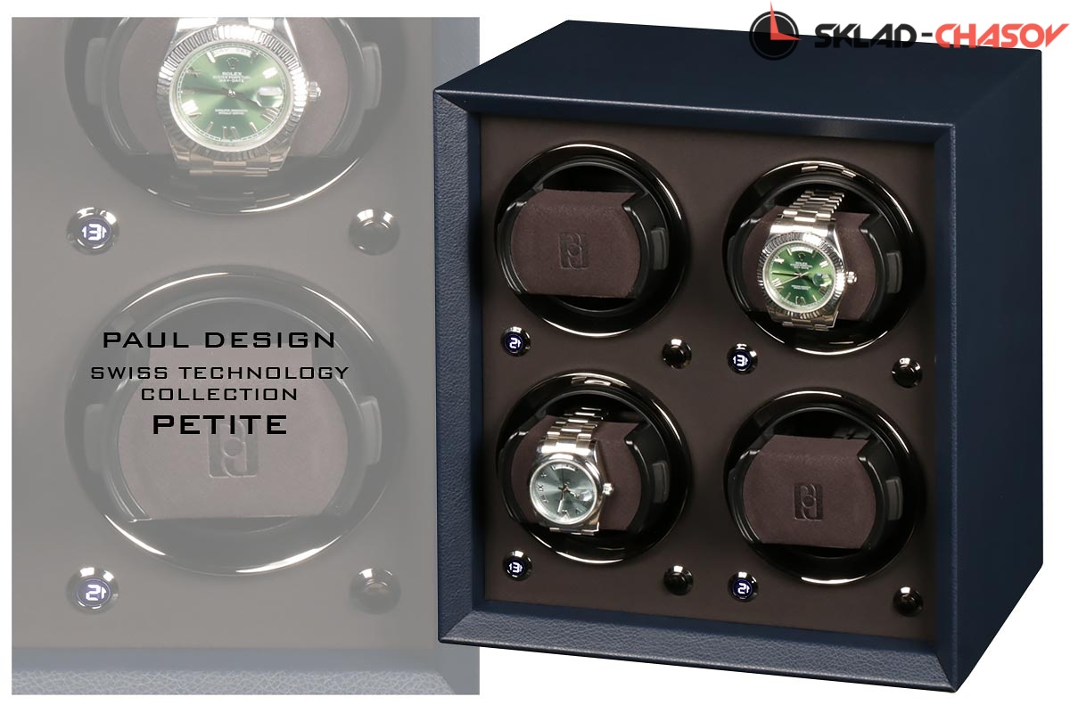 Шкатулка нового поколения, для бережного подзавода 4-х часов, не большого размера, для удобства использования и перемещения. Выполнена из синей элитной кожи, внутри выстлана чёрной микрофиброй (материал удобен для очистки от загрязнений), возможность встраиваемости в сейф или гардеробную, металлические колечки вокруг держателя последнего поколения, которые идеально регулируется под маленькие и большие браслеты а также фиксируются внутри стакана, держатель с каучуковой основой, независимые моторы с регулировкой 3-х направлений вращения и выбора количества оборотов 600,900,1200,1500,1800,2100 в сутки. Удобный и небольшой вариант для подзавода часов в вашей квартире или загородном доме. Фирменная - подарочная упаковка и комплект с карточкой прилагается.