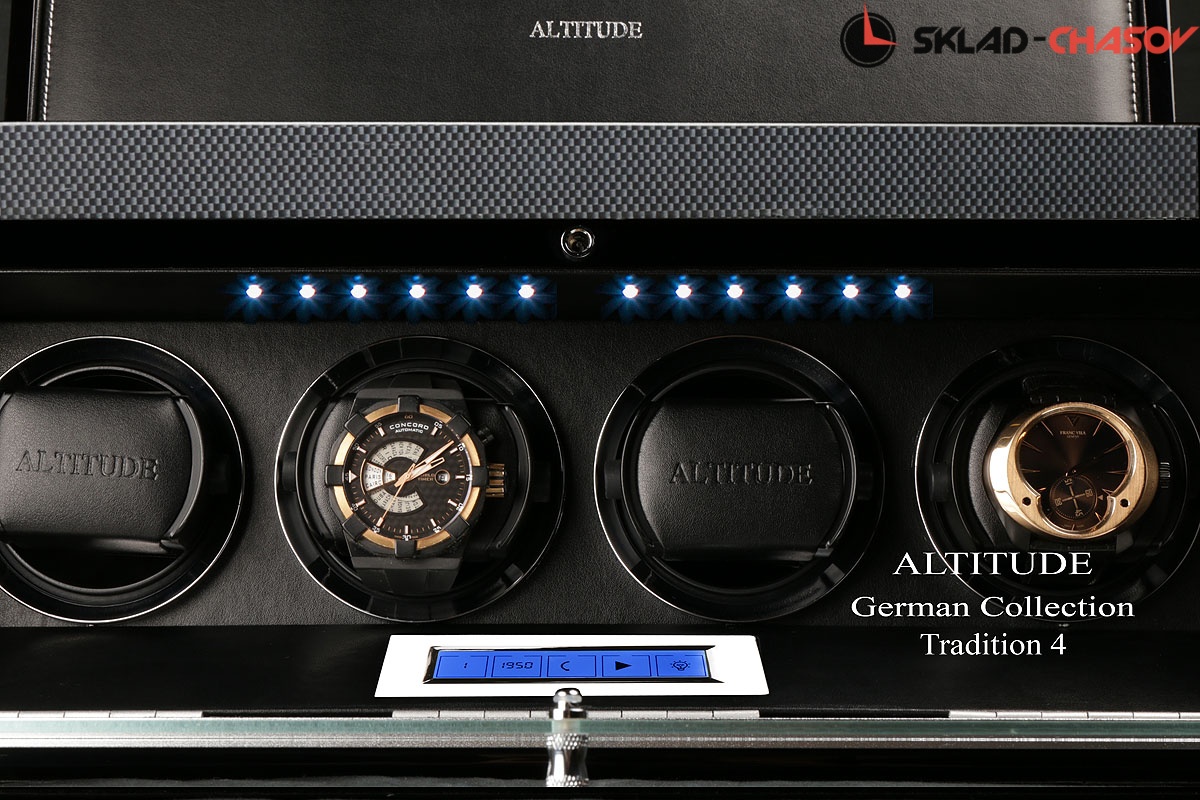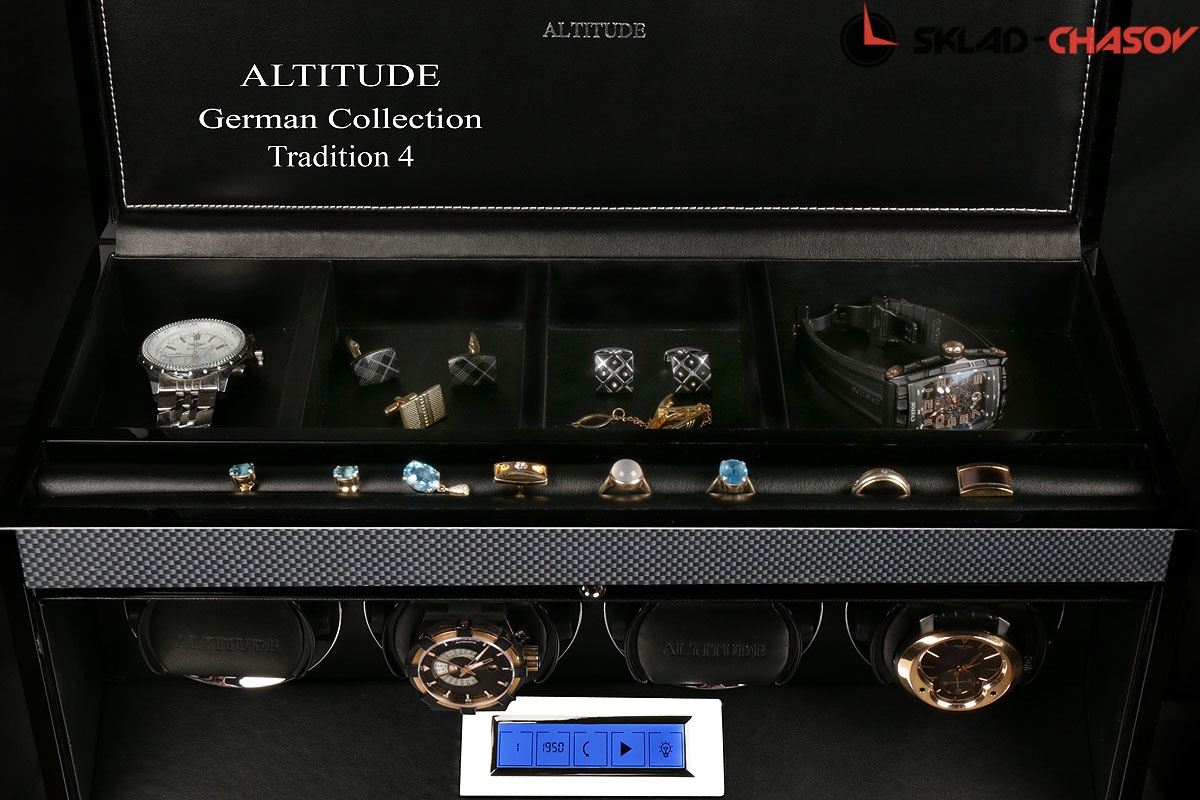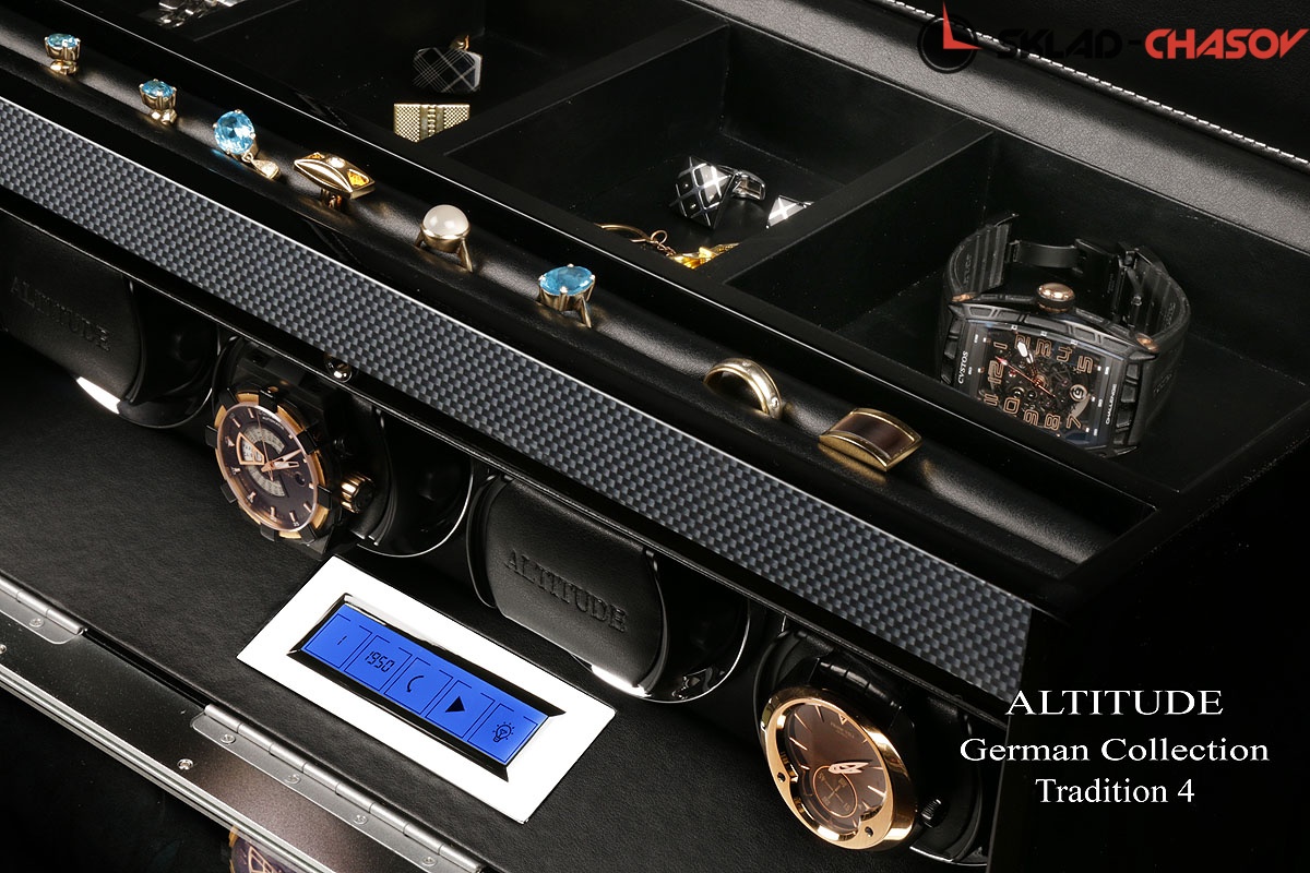 В декоре шкатулки используются такие материалы как благородное черное дерево "венге", минеральное стекло, панель из полированного металла с фирменным логотипом. Декоративная панель: технологичный карбон. Деревянные элементы покрыты множественными слоями рояльного лака. Внутренние поверхности выстлана эко-кожей чёрного цвета. "Стакан" аллюминиевый. В верхней части расположено дополнительное отделение, украшенное логотипом «Altitude», которое можно использовать для хранения наручных часов небольшого размера и ювелирных украшений. Светодиодная подсветка с функцией включения/выключения.